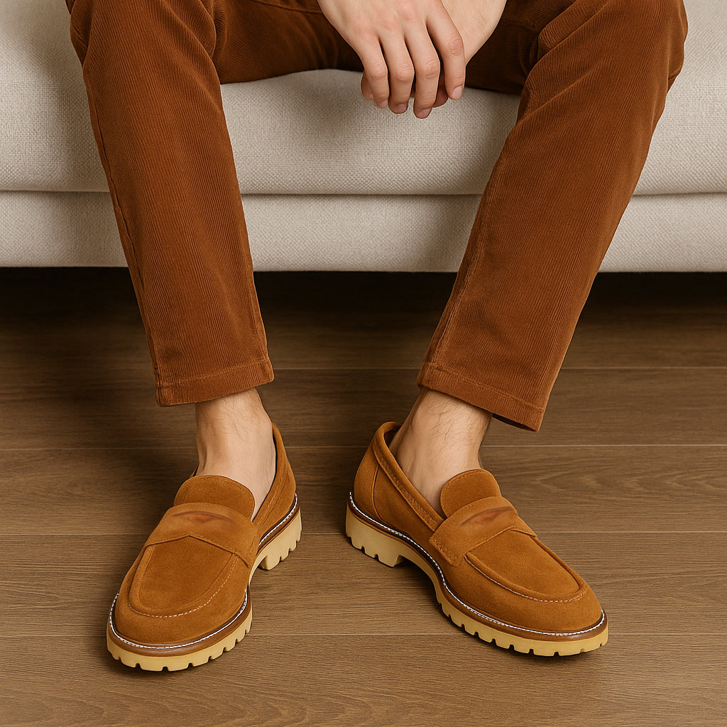 Light Weight Lug Sole Loafers in Orange Suede Leather with Triangular Cut-Strap