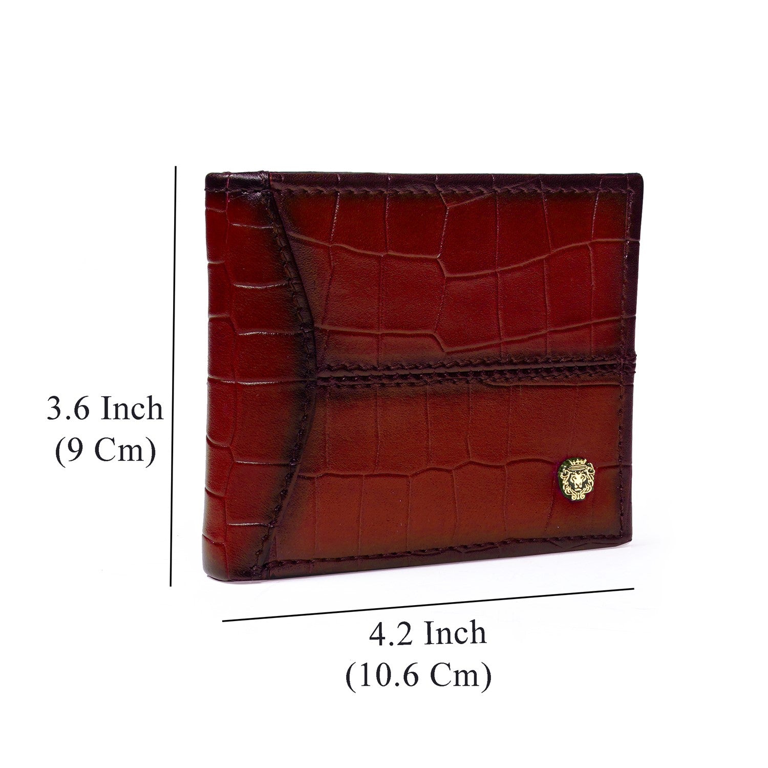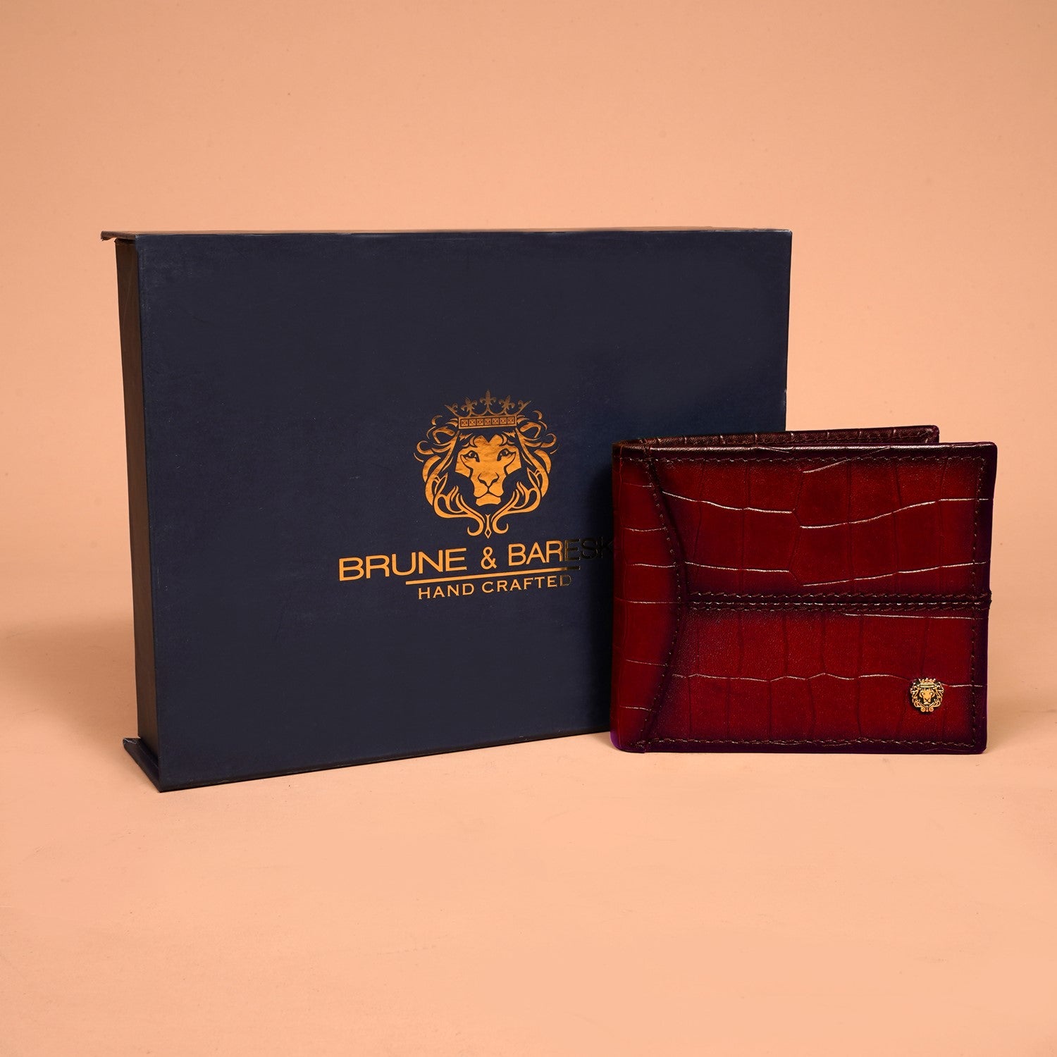 This bi-fold Wine Croco print leather wallet with darker smudged edges looks very elegant. The BRUNE & BARESKIN signature metal Lion brand logo increases the style quotient. The bi-fold opening wallet features two main pockets along with a small security pocket on both sides. Wine leather with a polyester lining and features 3 card slots on Both sides, and two full-length pockets for notes. It has a total of 8 pockets, which makes it a perfect buy for today's generation. It provides the style and storage with artistic Patina regime leather color shades.