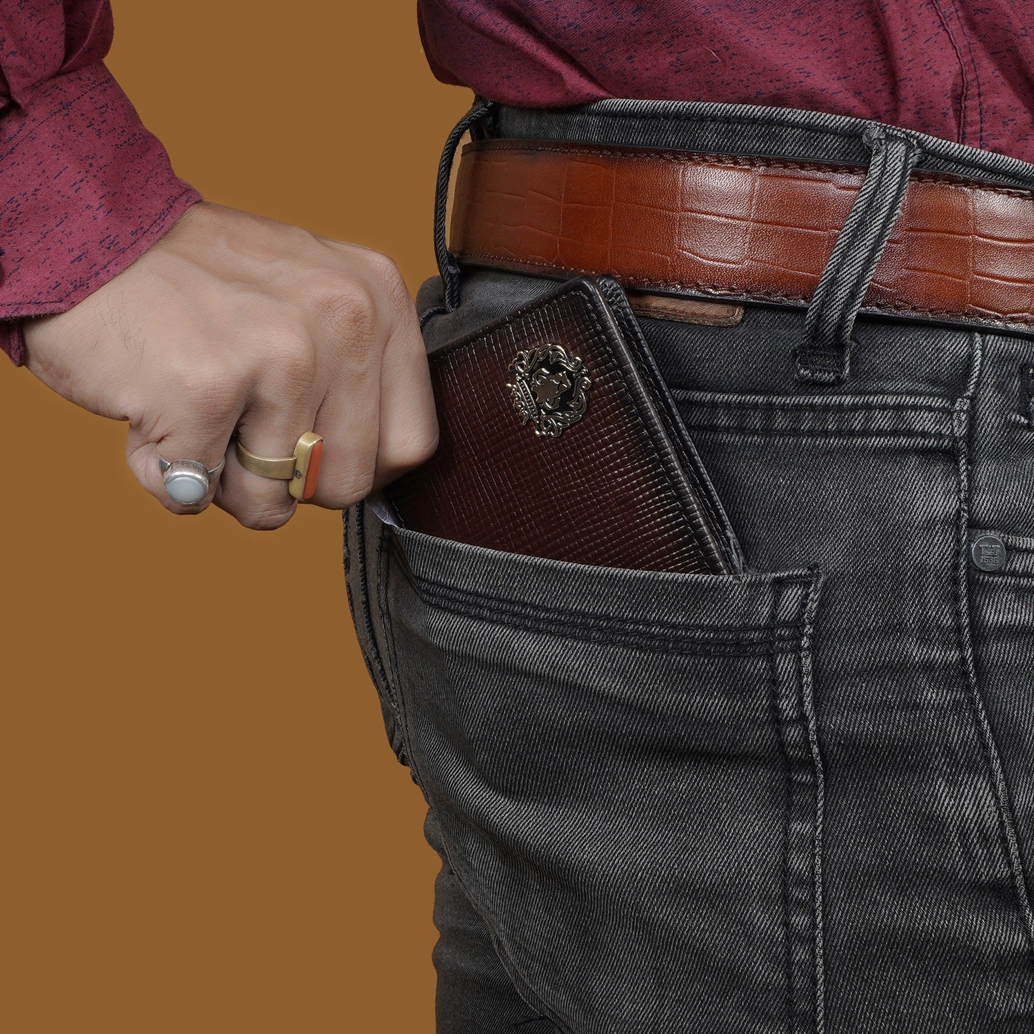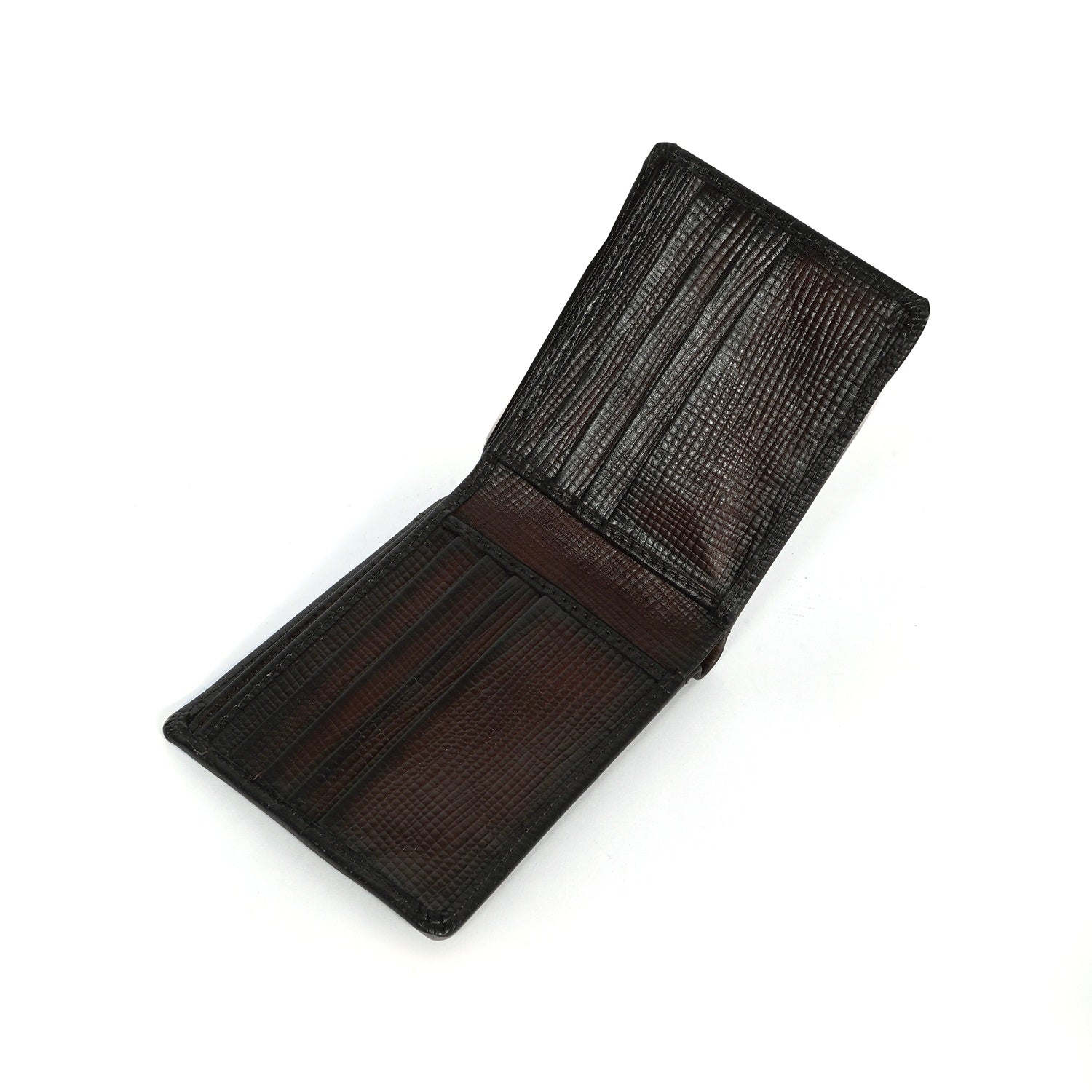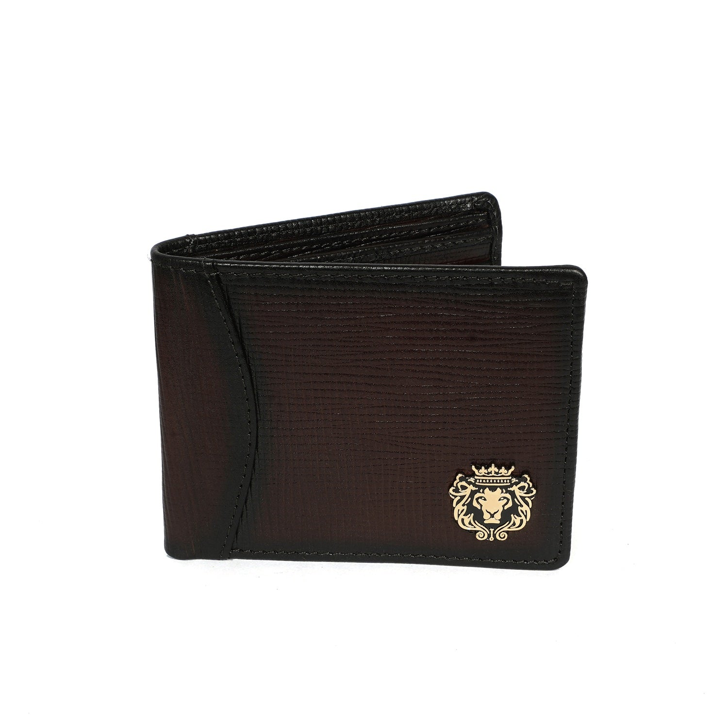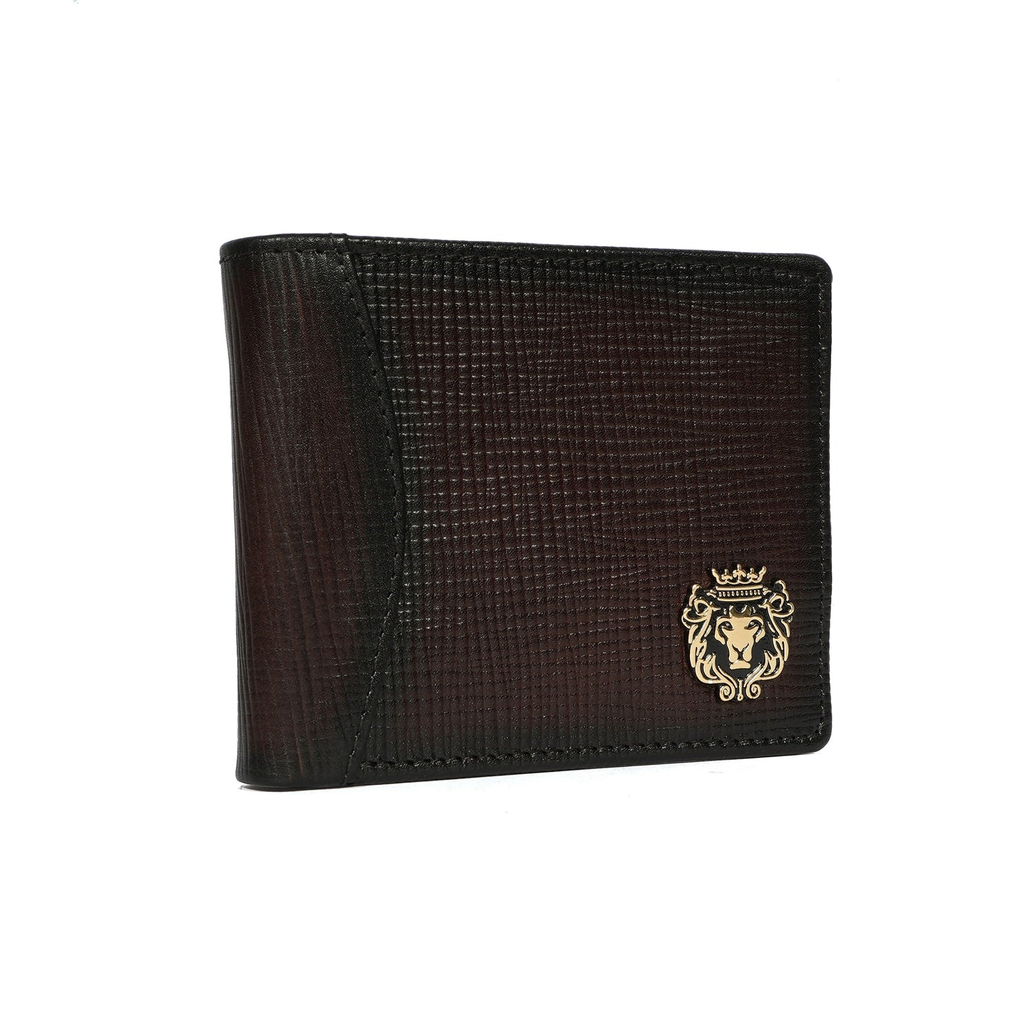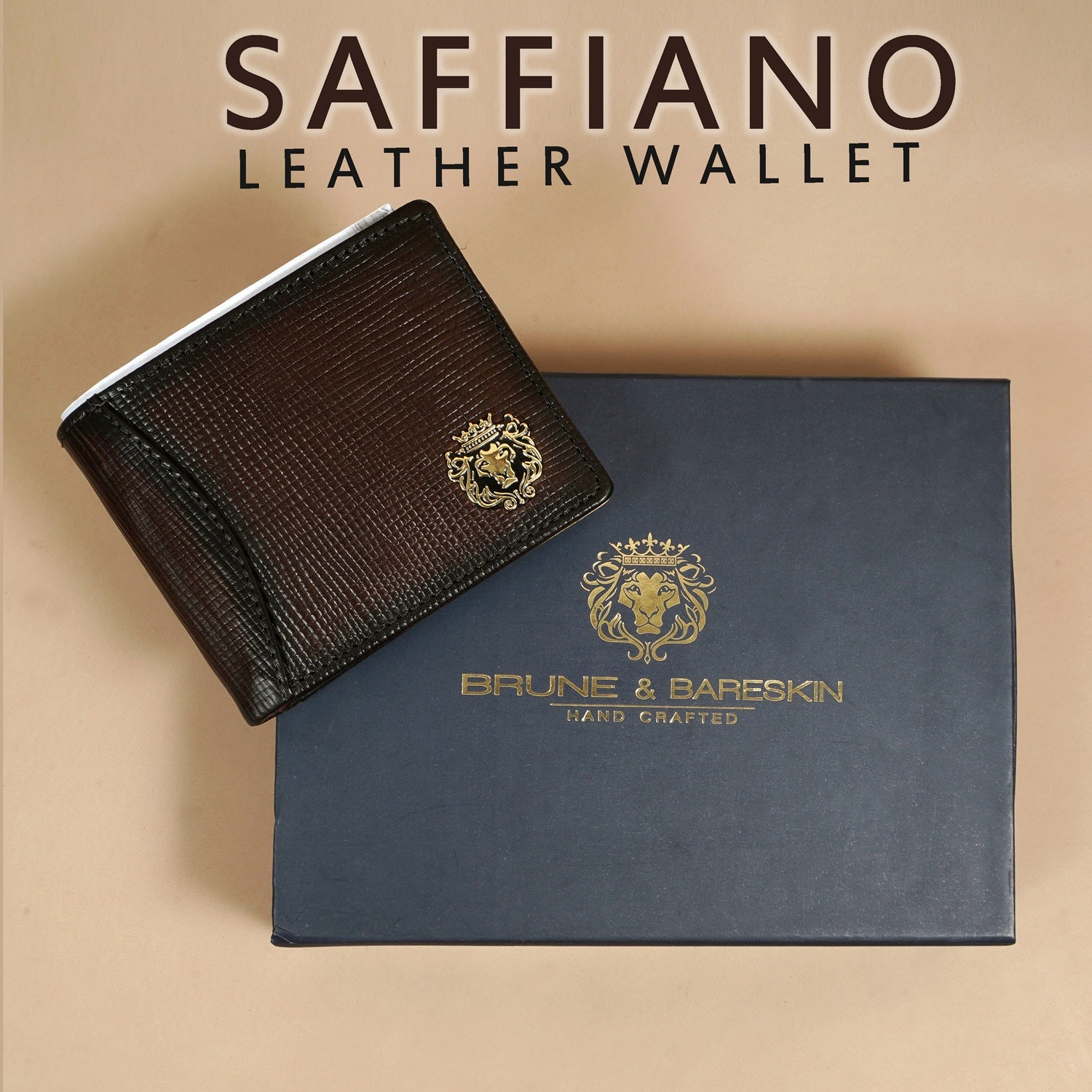 Elevate your style with our Dark Brown Bi-Fold Wallet in Textured Saffiano Leather. This luxurious wallet, crafted by brand Brune & Bareskin, boasts premium quality saffiano leather and a sleek metal lion trademark logo.