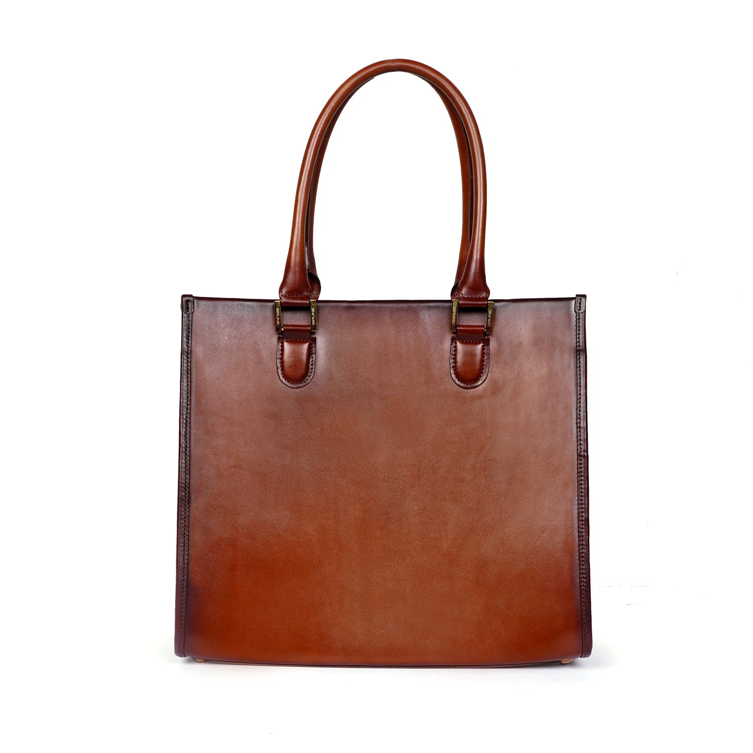 This luxurious handbag by BRUNE & Bareskin is the perfect fashion accessory for any stylish woman. Hand crafted with premium quality genuine leather and a patina finish, it features a secure main compartment with a flap over snap button and an inside zipper pocket for important documents. The convenient shoulder strap and multi-usable pockets on the front make it a stylish and practical choice for any occasion. Embossed with the BRUNE logo, this bag is the perfect tote bag for women who want to stay fashion forward.