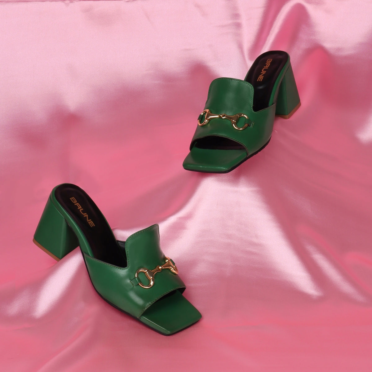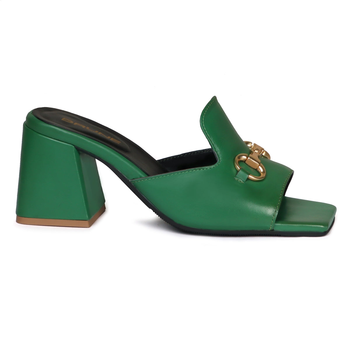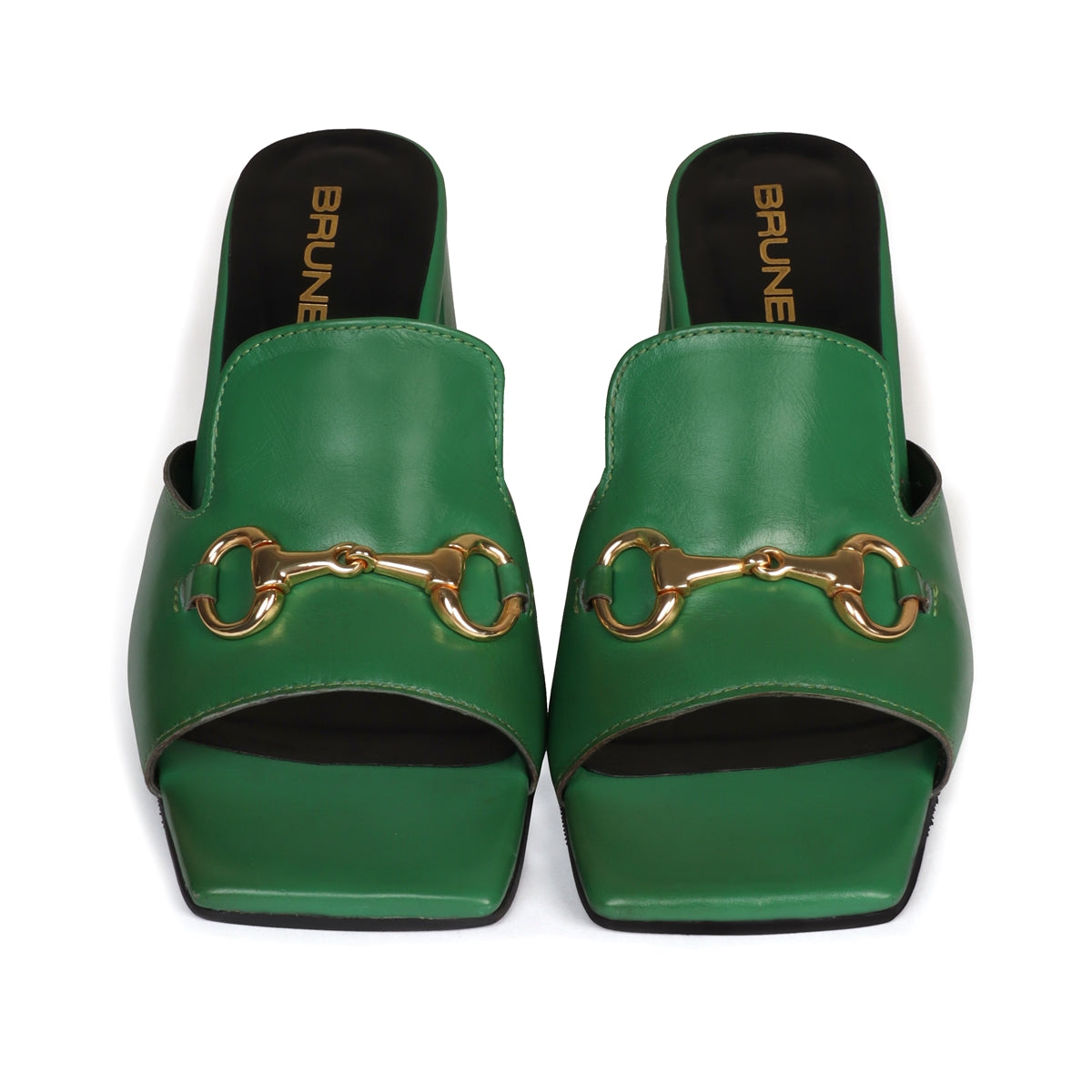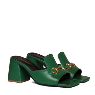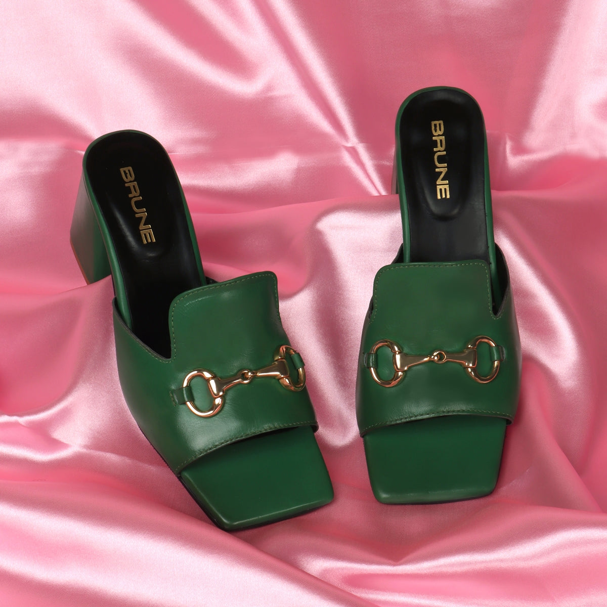 Golden Horse-bit Embellished Green Leather Open Toe Long Vamp Blocked Heel Ladies Sandal by Brune & Bareskin
