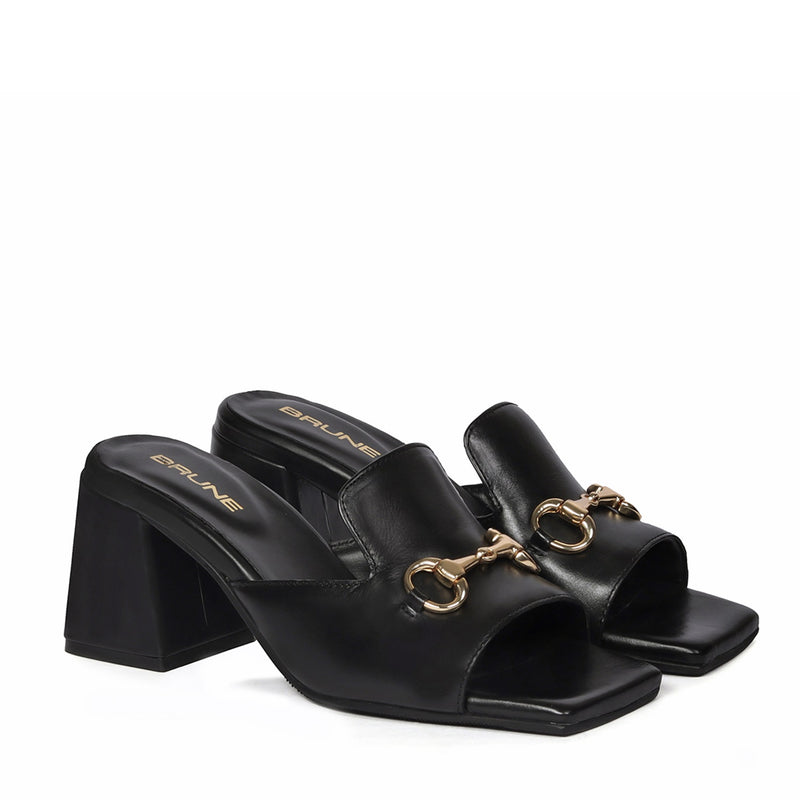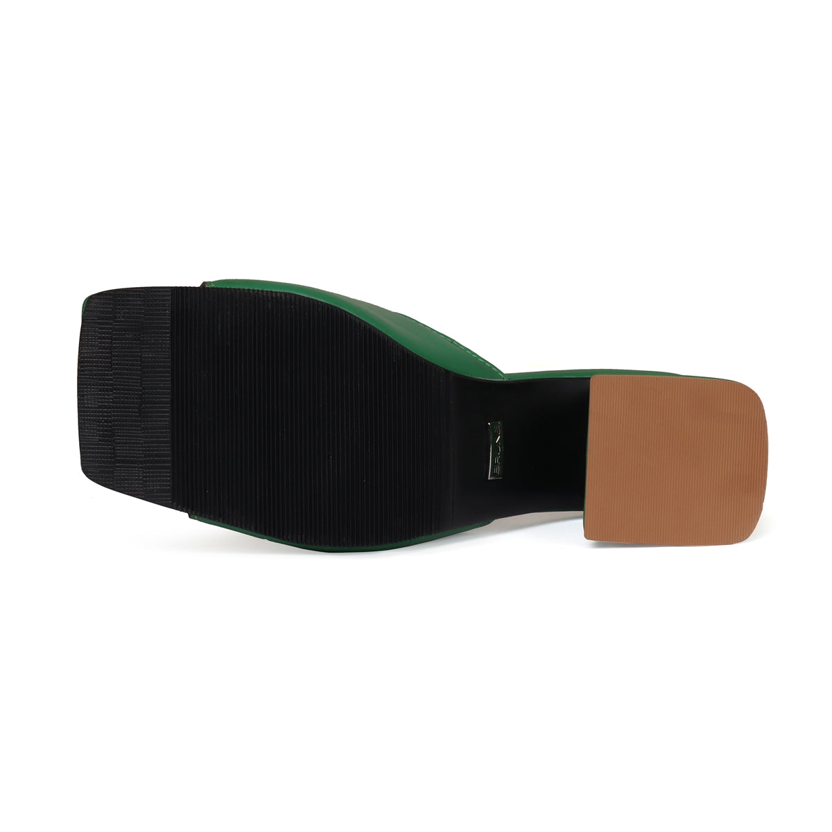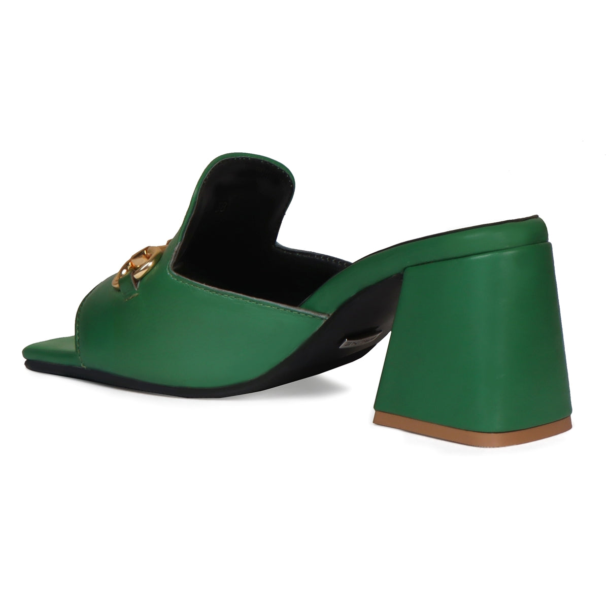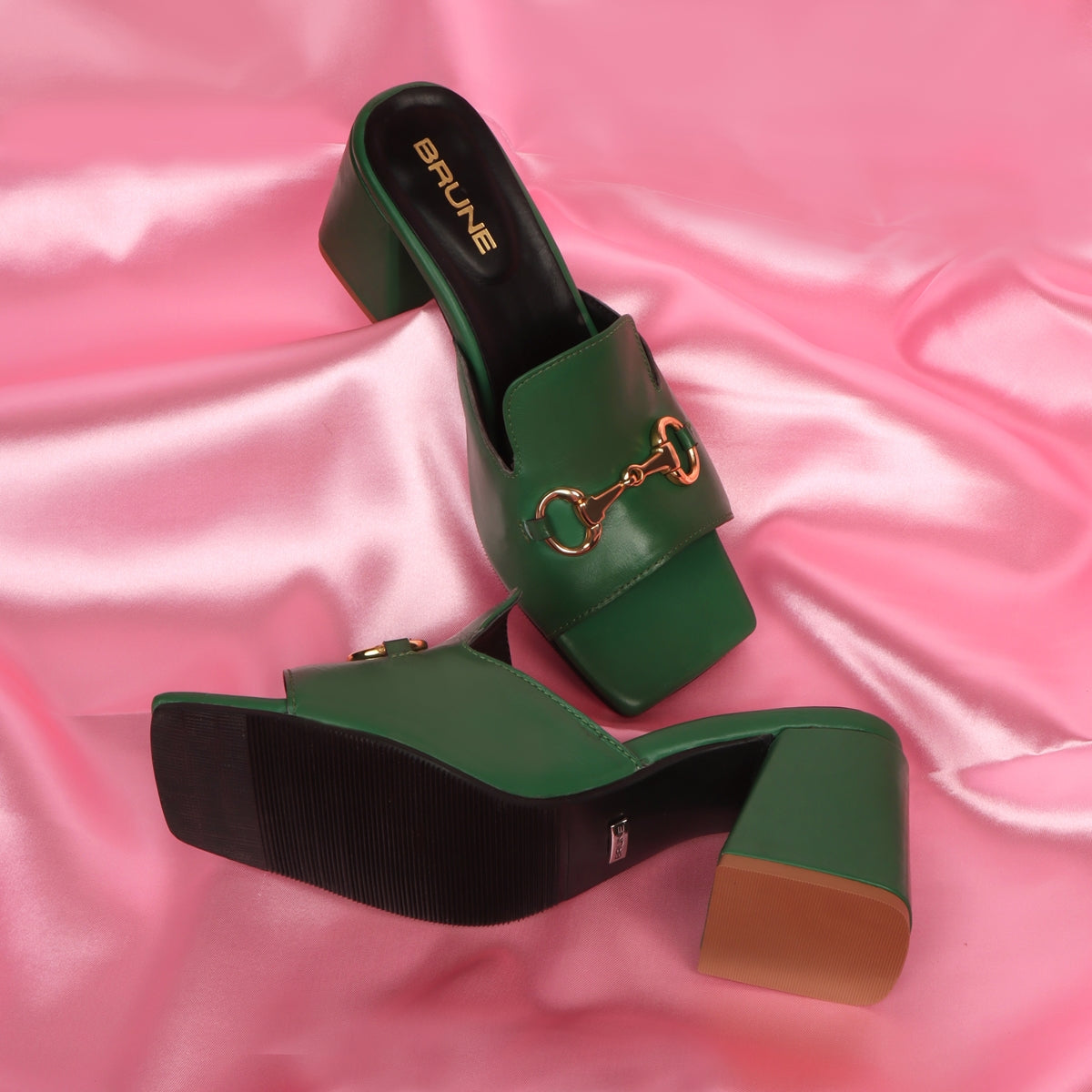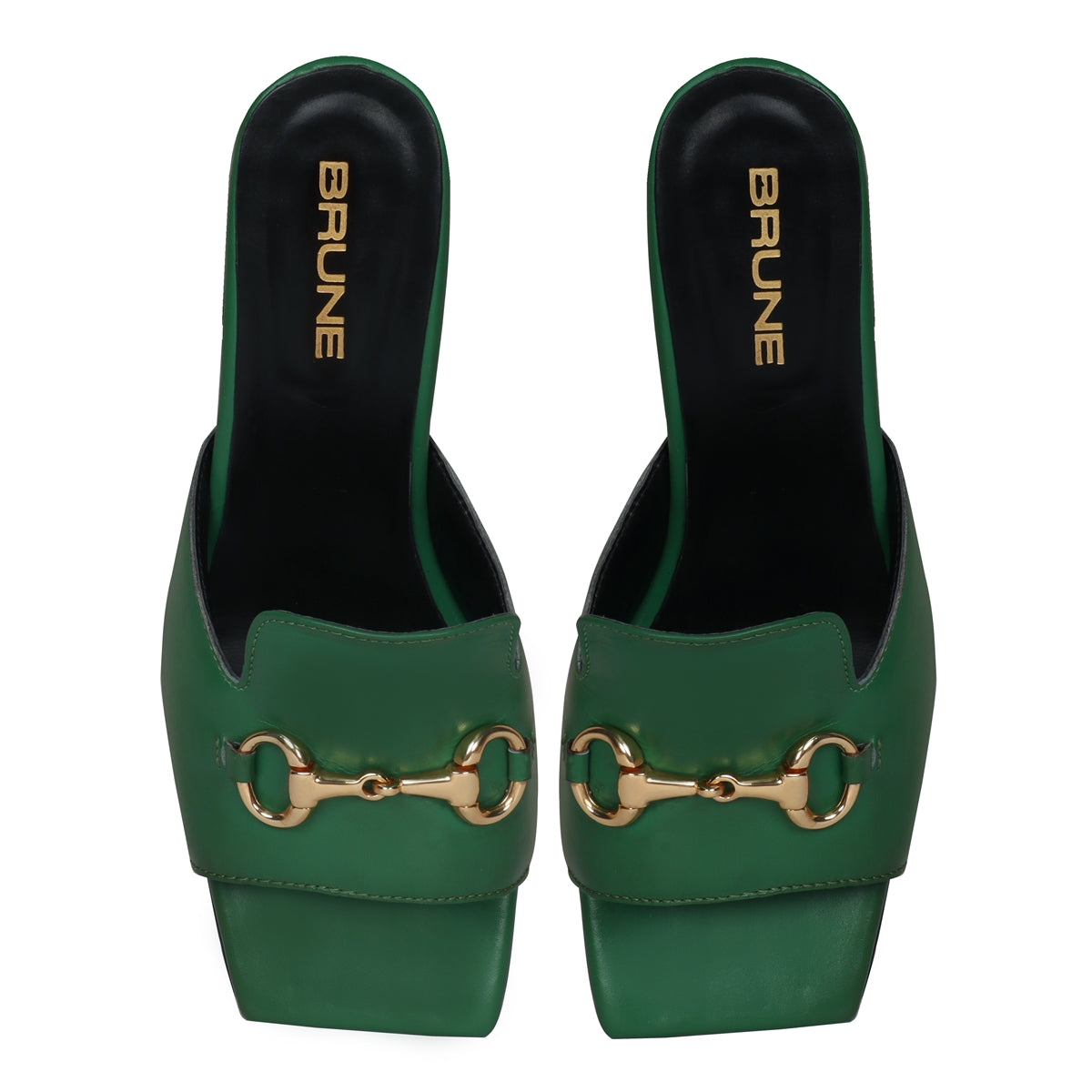 Golden Horse-bit Embellished Green Leather Open Toe Long Vamp Blocked Heel Ladies Sandal by Brune & Bareskin
