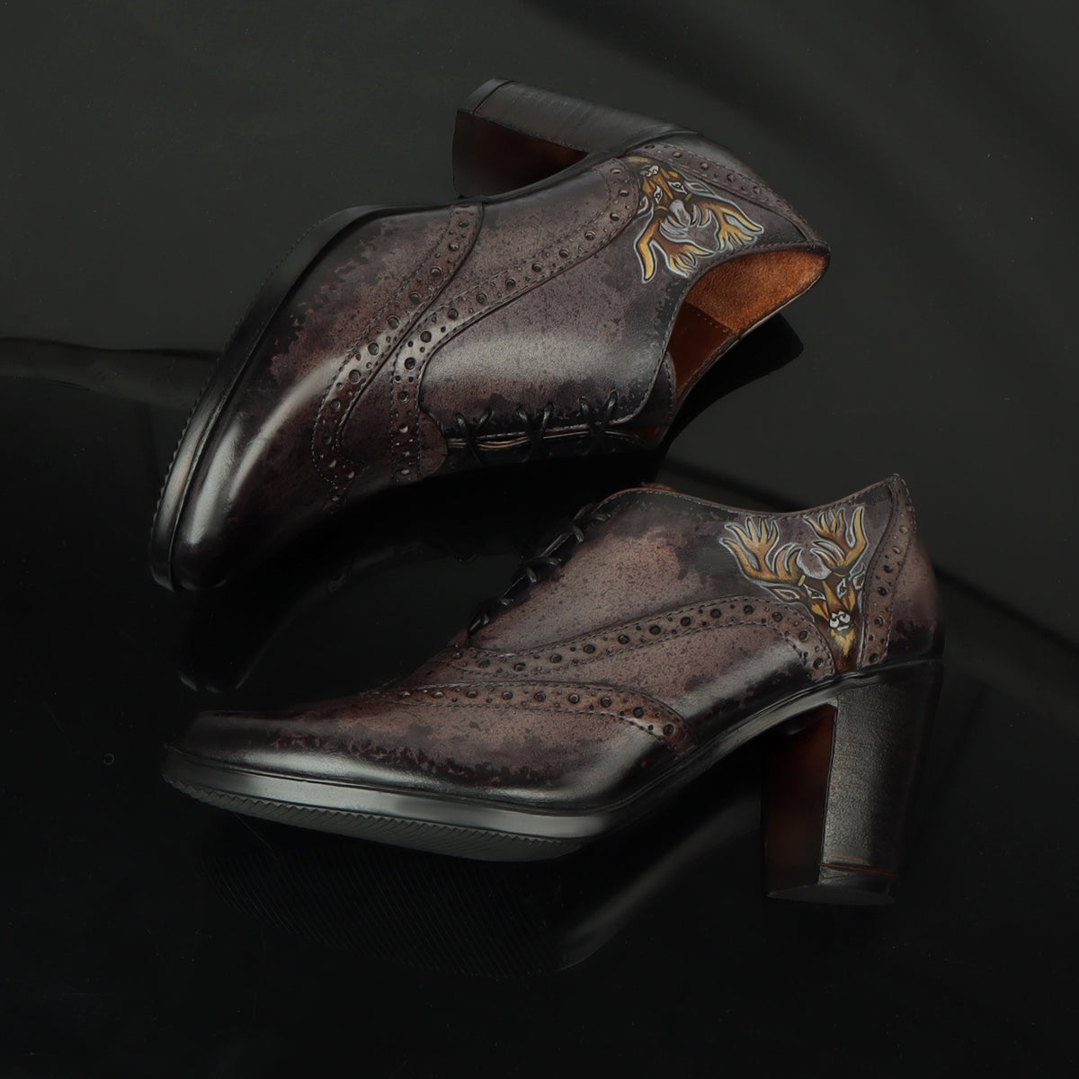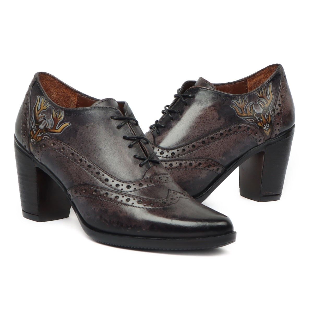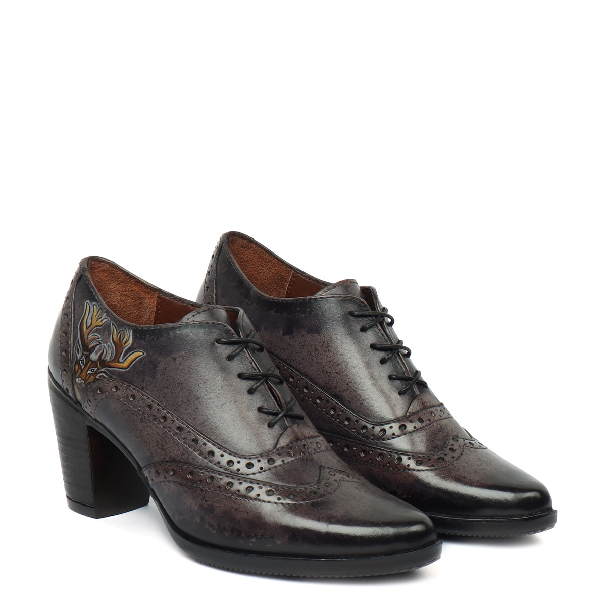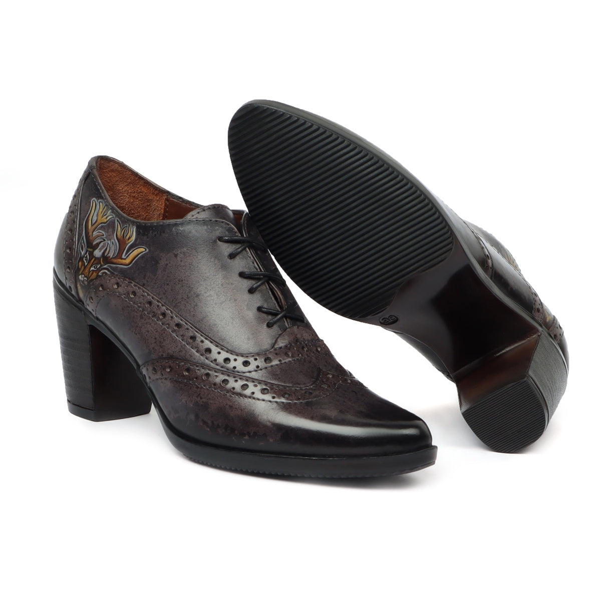 These Black on grey Hand painted deer head gives a layer of uniqueness to them. When you choose to wear these smudged cloudy grey color pure leather shoes by BRUNE & BARESKIN, you are sure to get more than a few glances coming your way. The detailed brogue punching design across the shoe looks very classy. This leather Lace Up Formal Oxford shoe is a very elegant pair by BRUNE & BARESKIN. Cross Lace-Up design with burnished Medallion Toe flaunts your fashion statement. Get ready to leave an unforgettable impression on others by wearing these modernized classic shoes. It is the perfect footwear to gift to that perfect woman in your life. The color can also be customized further with your matching apparel.