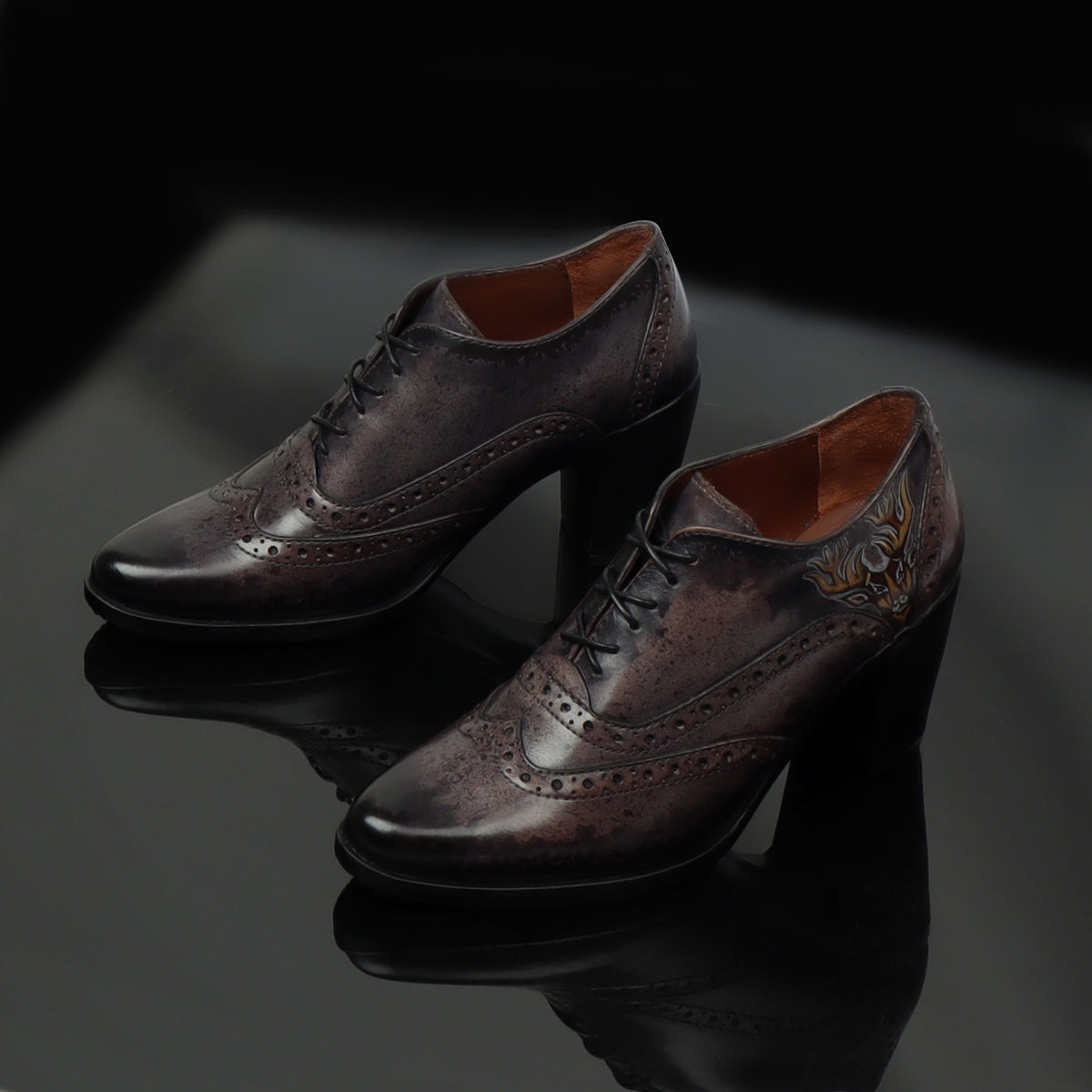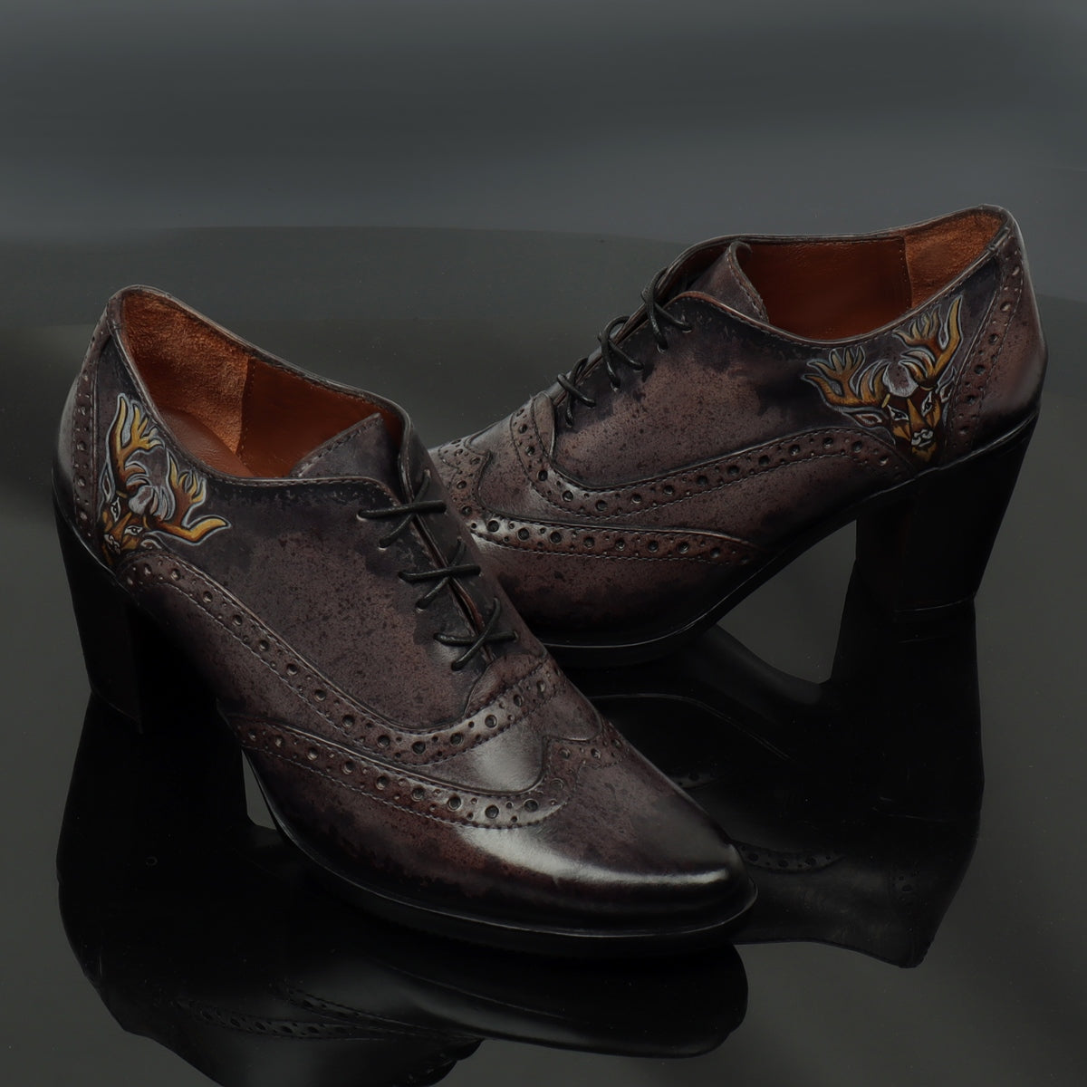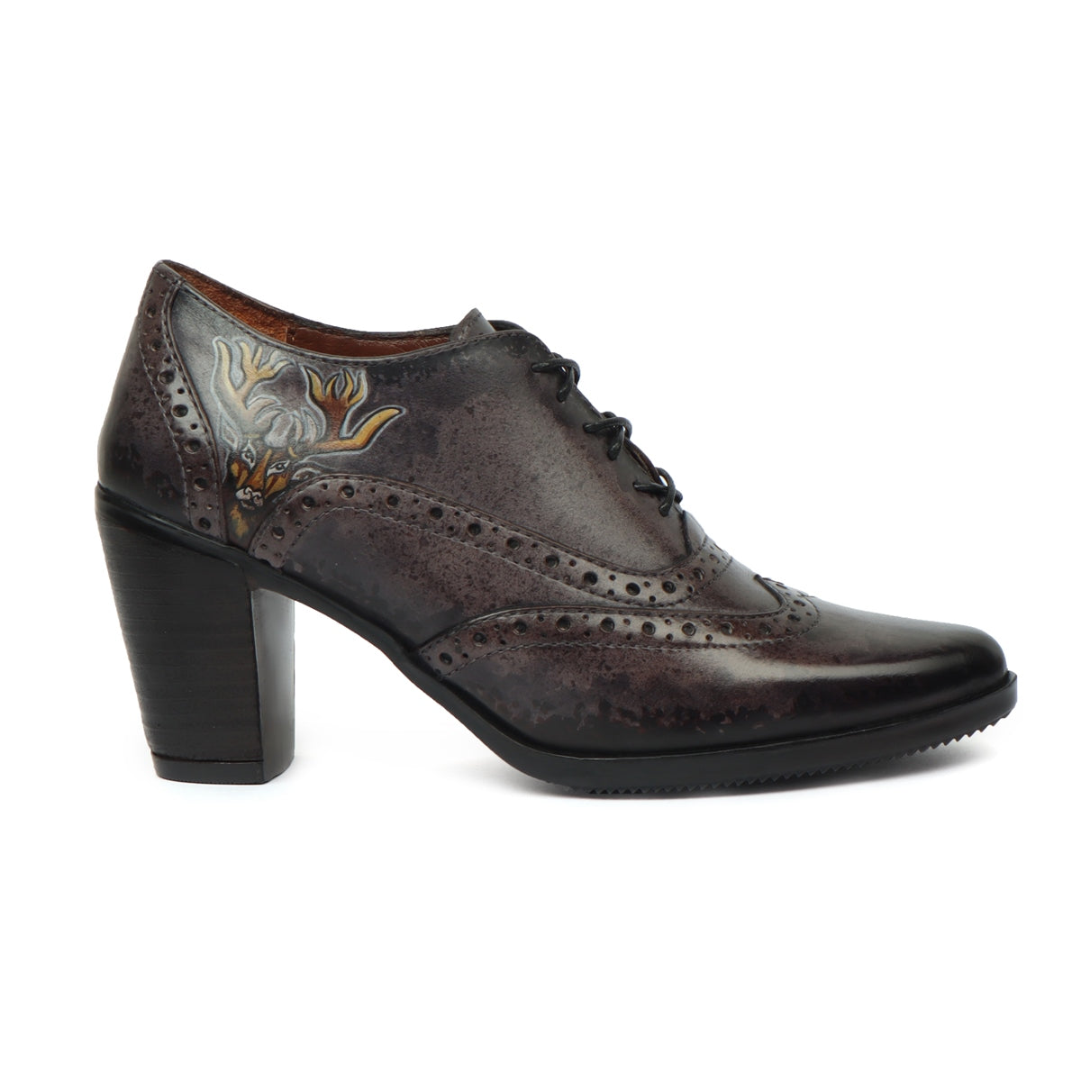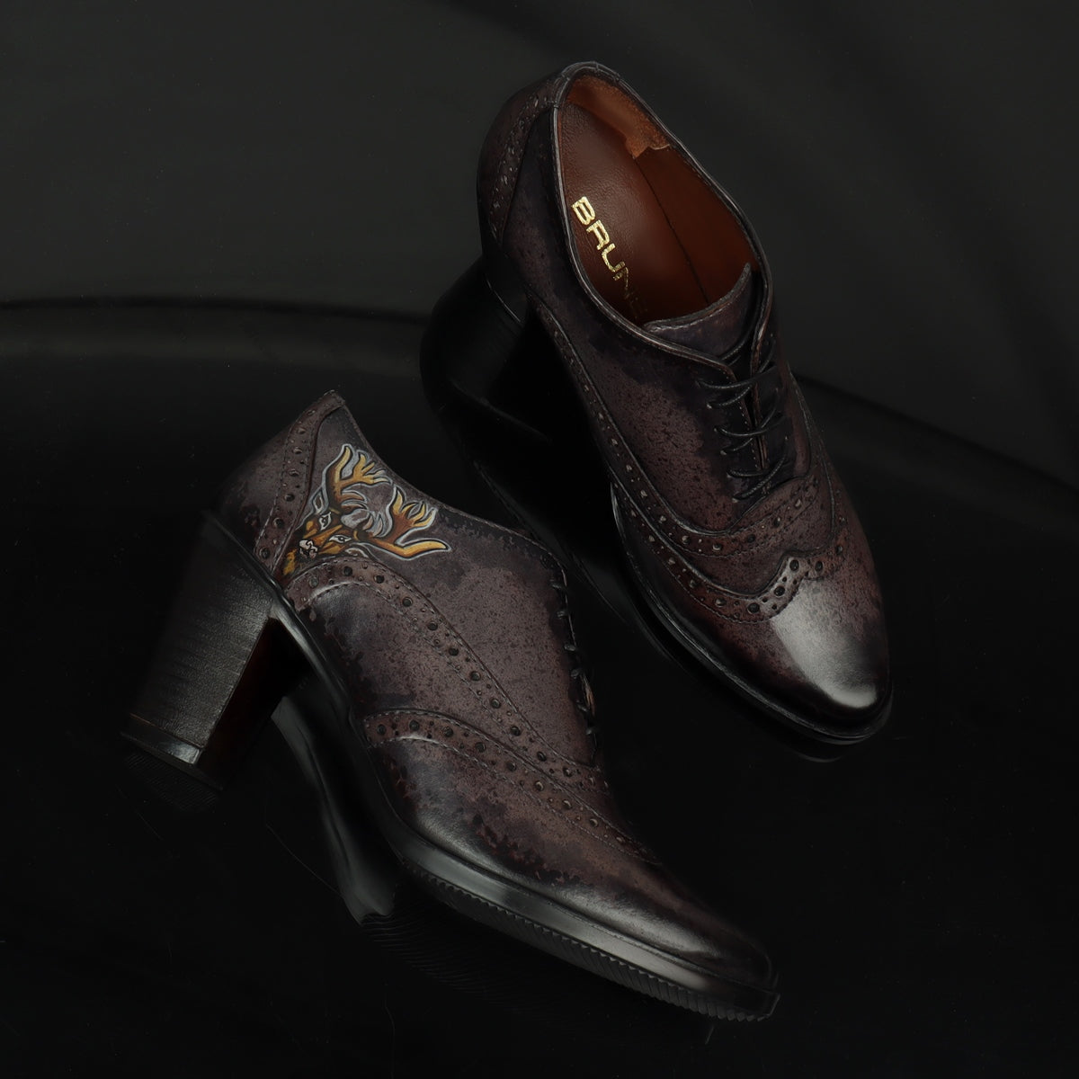 These Black on grey Hand painted deer head gives a layer of uniqueness to them. When you choose to wear these smudged cloudy grey color pure leather shoes by BRUNE & BARESKIN, you are sure to get more than a few glances coming your way. The detailed brogue punching design across the shoe looks very classy. This leather Lace Up Formal Oxford shoe is a very elegant pair by BRUNE & BARESKIN. Cross Lace-Up design with burnished Medallion Toe flaunts your fashion statement. Get ready to leave an unforgettable impression on others by wearing these modernized classic shoes. It is the perfect footwear to gift to that perfect woman in your life. The color can also be customized further with your matching apparel.