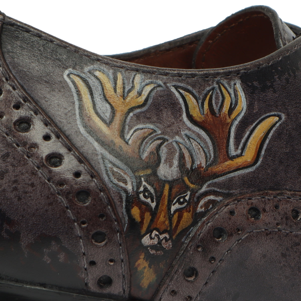 Hand Painted Deer Head Cloudy Grey-Black Full Wingtip Punching Brogues Oxford Patent Leather Boots by Brune & Bareskin