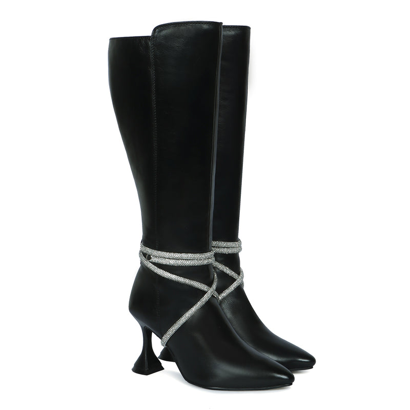 Black Pointed Toe Chain Accent Zip Closure Knee Heights Leather Ladies Fluted Heel Boots By Brune & Bareskin