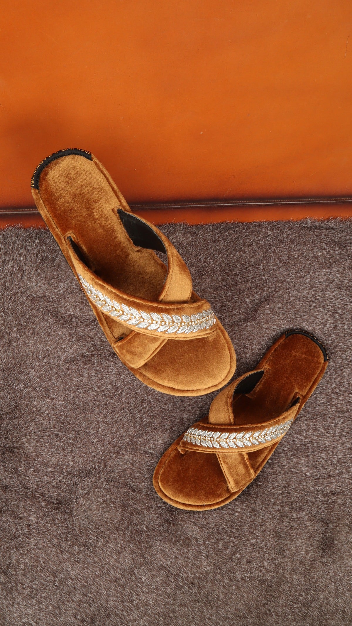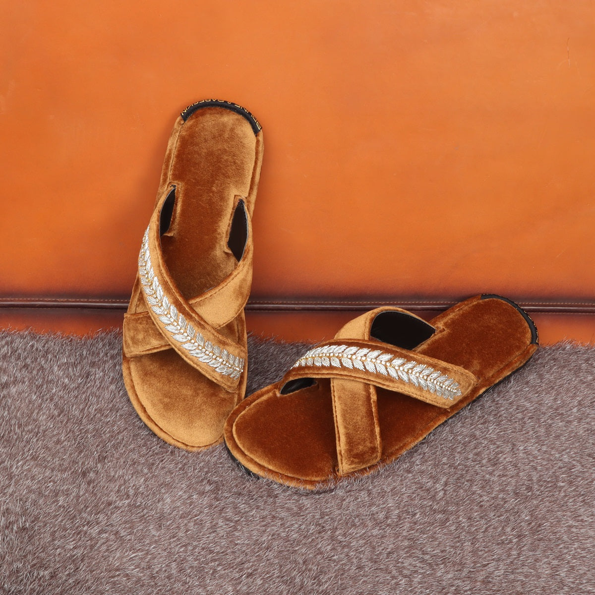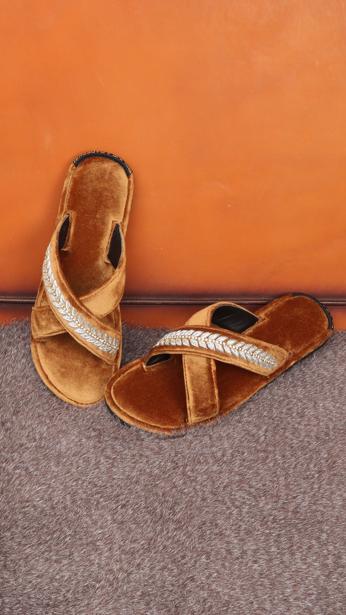 Tan Italian Velvet Cross strap sliders with Leaf zardosi are must have footwear in this season. These super soft velvet base slide-in slippers are must have of the season. The gel injected memory foam base is designed to provide you comfort while walking. We use special layering techniques to keep the base cozy and retain it's shape. The wider cross design straps enhances the elegance further. Carry these with Jeans, Shorts, Capris and other casual wears to be style leader. Anti-Skid Rubber outer sole ensures the perfect walking grip. You can get it made in any color you want along with your logo & name initials with our bespoke services.