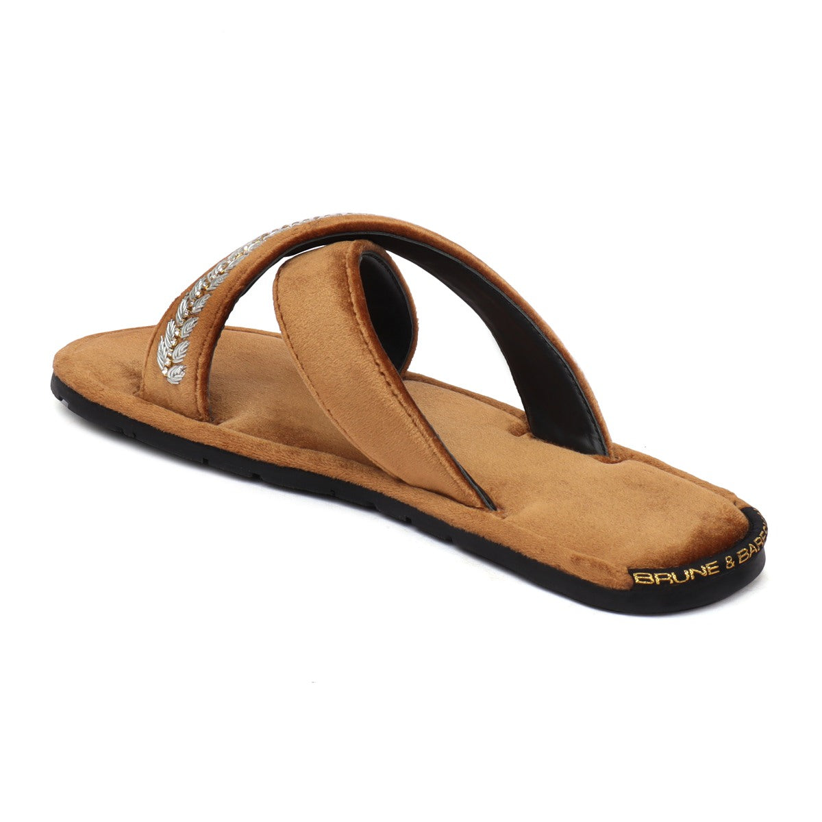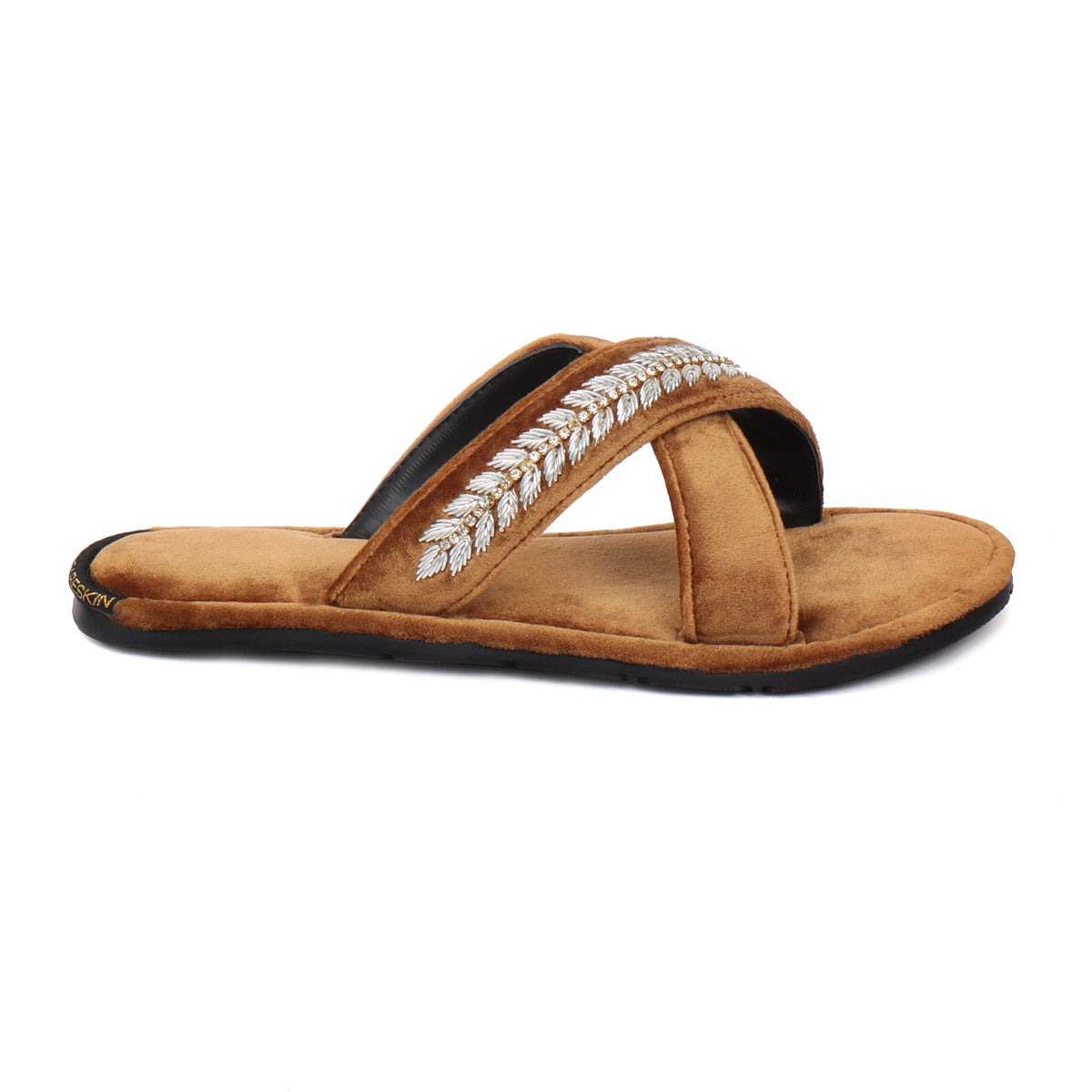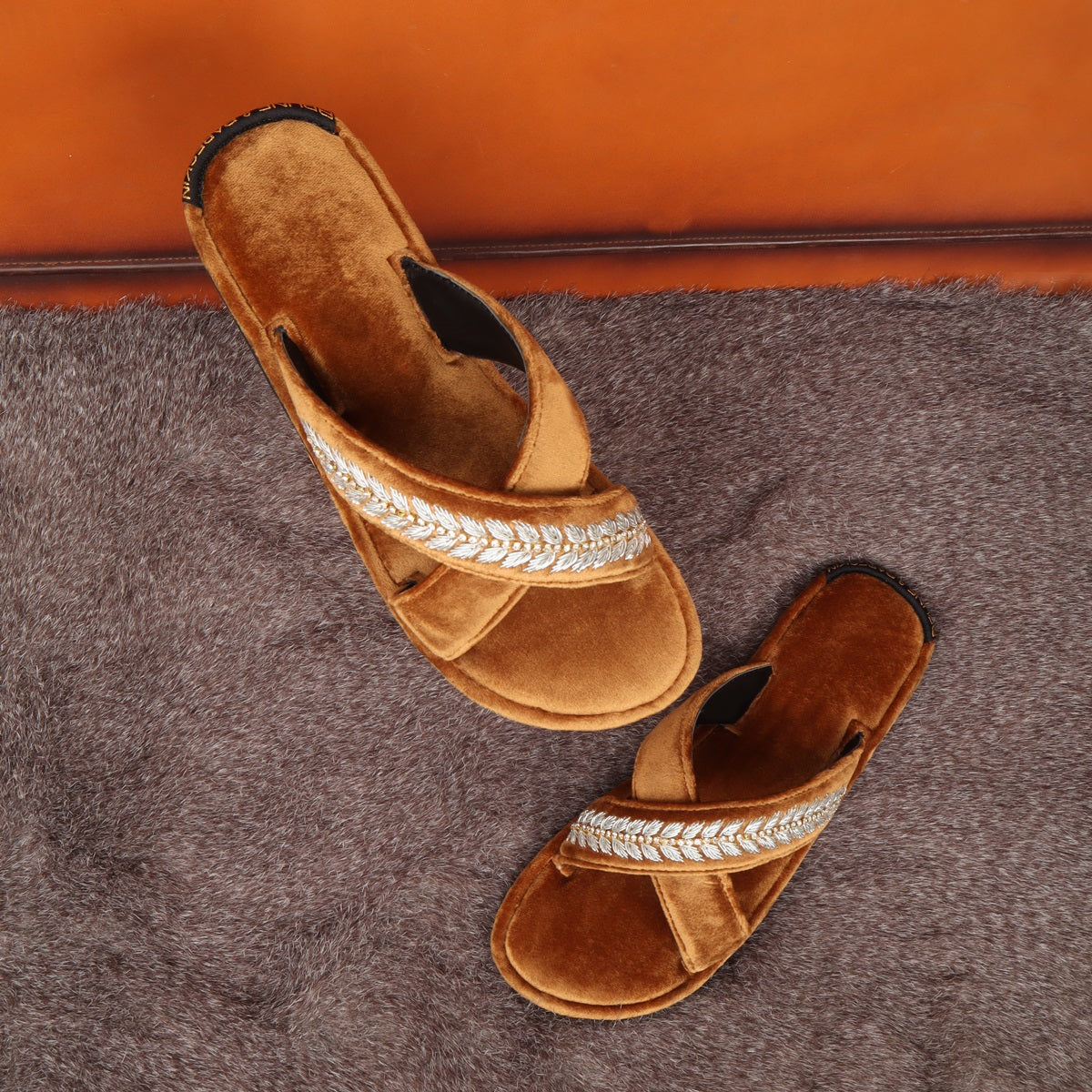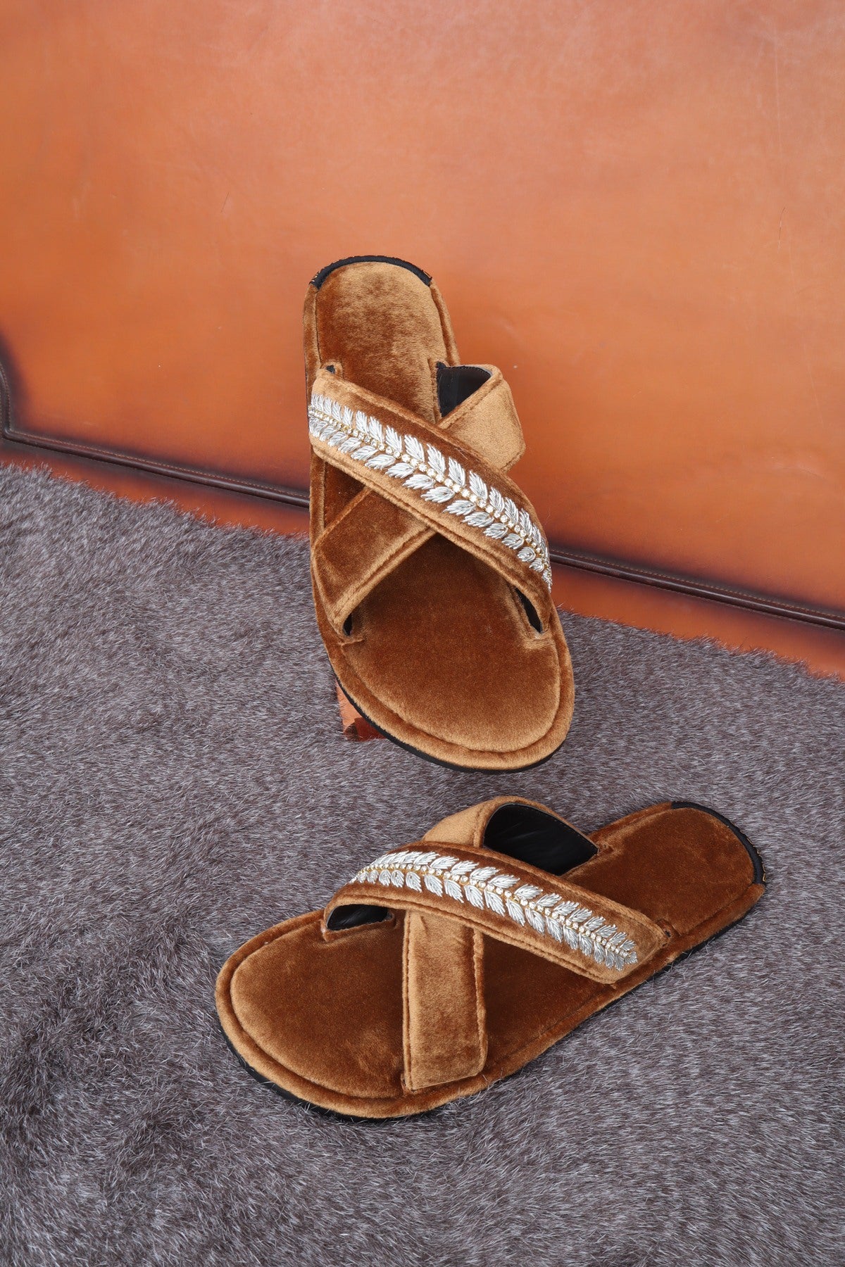 Tan Italian Velvet Cross strap sliders with Leaf zardosi are must have footwear in this season. These super soft velvet base slide-in slippers are must have of the season. The gel injected memory foam base is designed to provide you comfort while walking. We use special layering techniques to keep the base cozy and retain it's shape. The wider cross design straps enhances the elegance further. Carry these with Jeans, Shorts, Capris and other casual wears to be style leader. Anti-Skid Rubber outer sole ensures the perfect walking grip. You can get it made in any color you want along with your logo & name initials with our bespoke services.