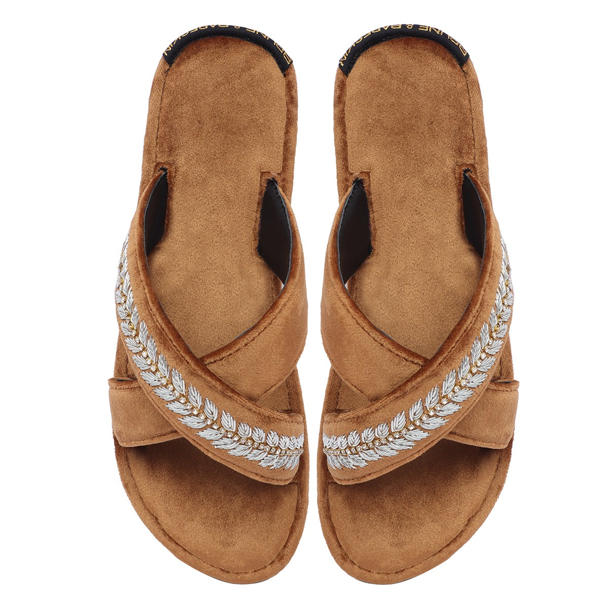 Women's Tan Leaf Design Silver Zardosi Embroidery Cross Strap Slide-In Slippers By Brune & Bareskin