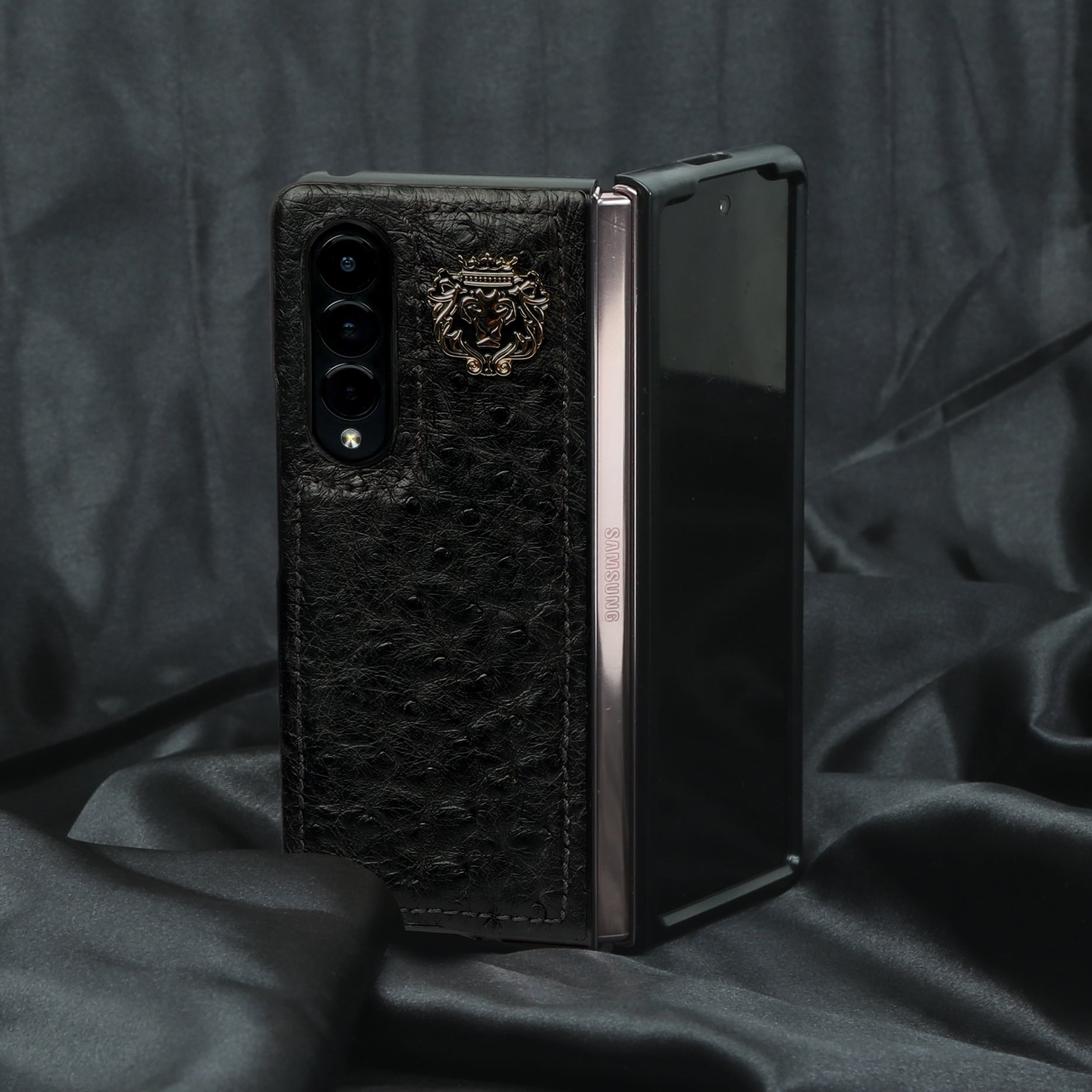This special Ostrich leather Galaxy Mobile Cover is made to give you a completely elegant look. The quality of the leather cover ranks high on durability and style factors. This black Ostrich leather Samsung Galaxy Fold cover looks very elegant. The BRUNE & BARESKIN signature metal Lion brand logo increases the style quotient further. 100% authentic ostrich leather is a mobile cover you would love to have. What are you waiting for? You can click on CUSTOMIZE NOW Button (Just above the "ADD TO CART" button) & fill out the form to submit your customization requirements. Or you can reach us by Call, Email, What's App, and DM.