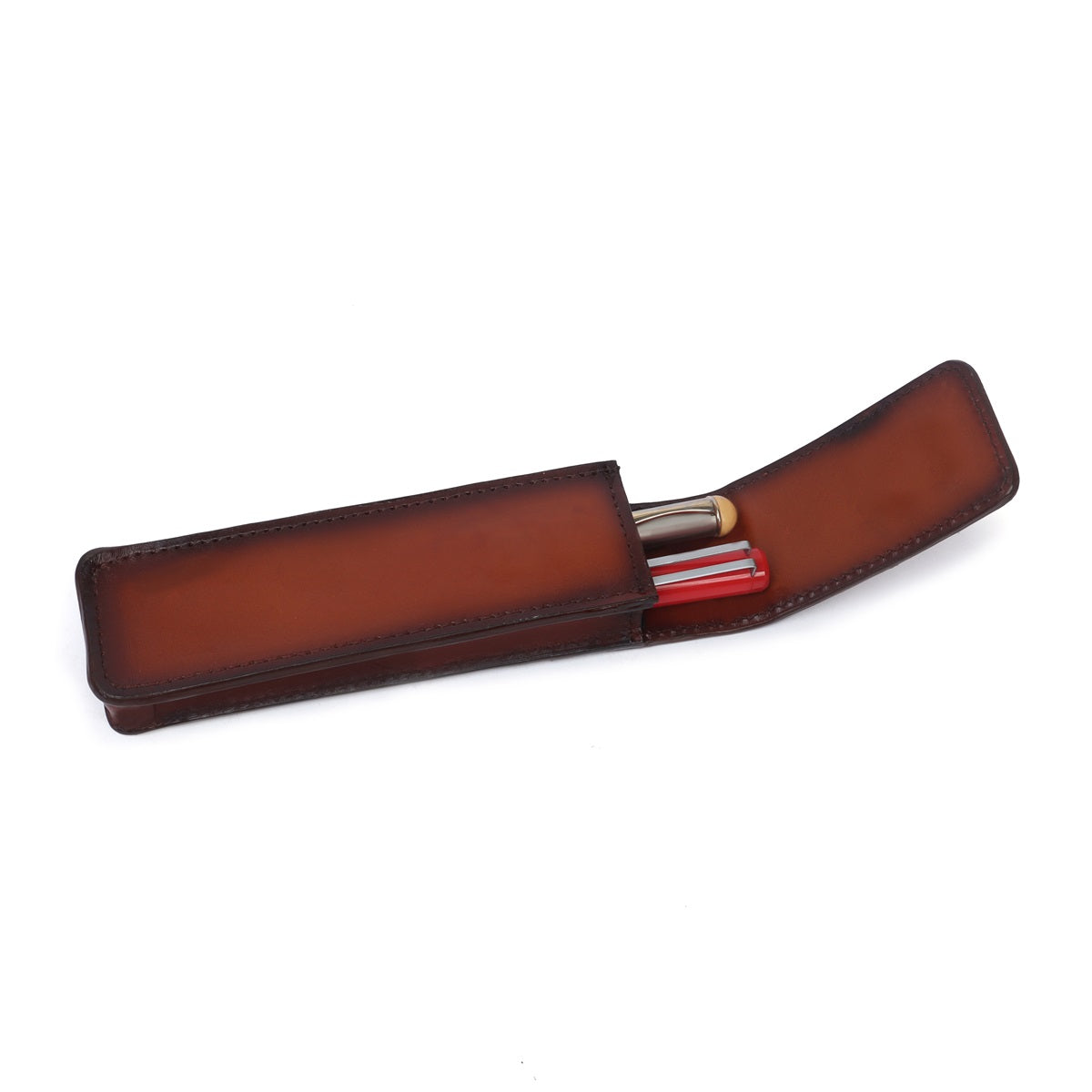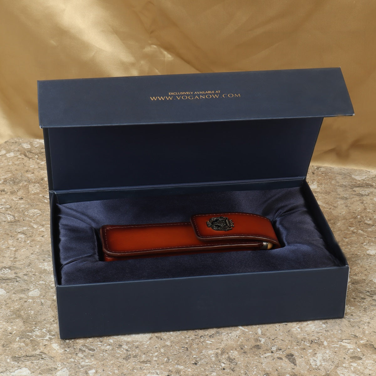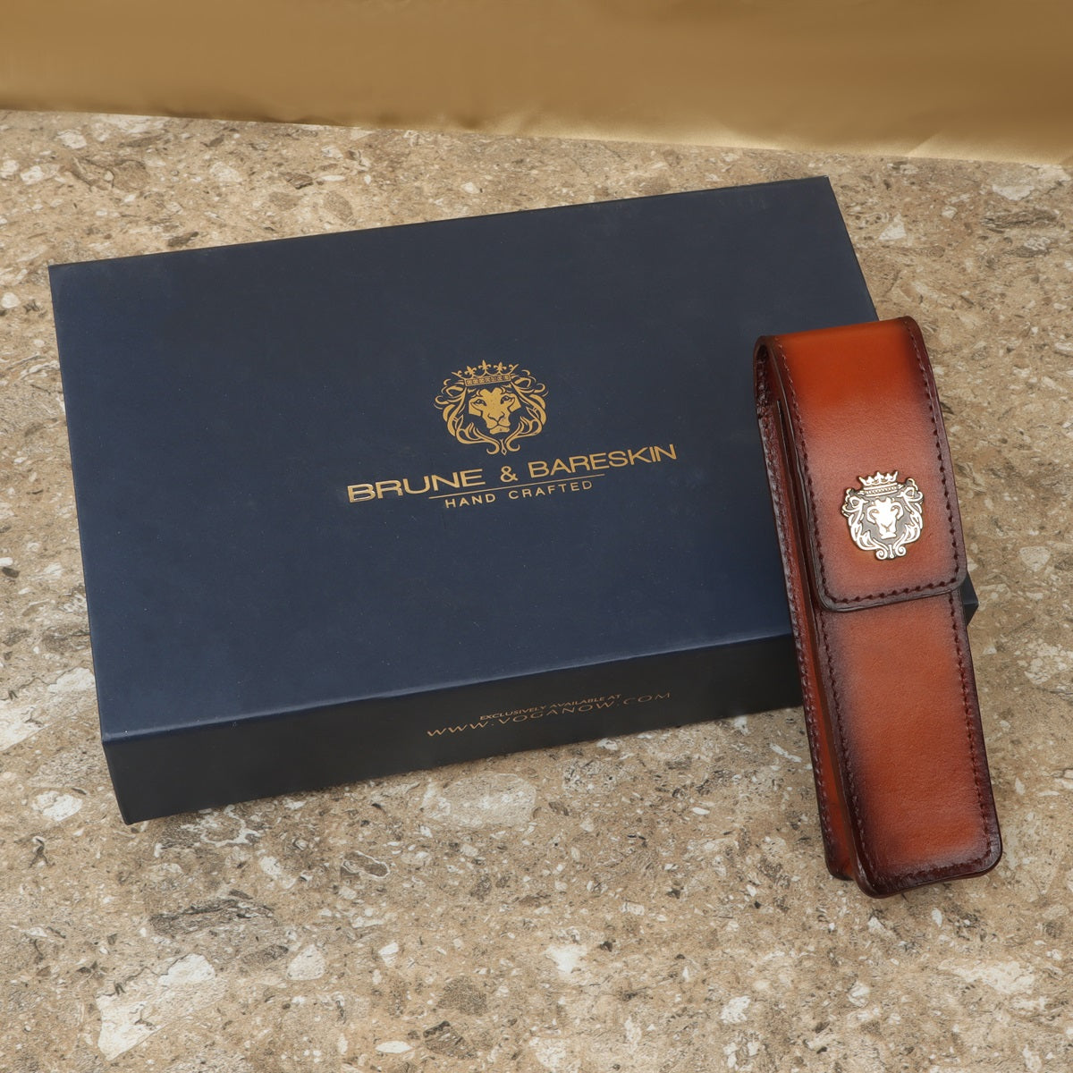 Variety of Leather is not limited to Shoes and Bags only. The latest leather Accessories are made to give you an extra style edge. Tan leather Pen holder is there to give you style, safety for your Pen and Other Expensive Things. This Tan leather Pen Holder with darker smudged edges looks very elegant. The Brune & Bareskin signature metal Lion brand logo increases the style quotient. Moreover, we can customize in your choice of color. It is a perfect Product to travel in style. This cover is quite very handy for the travelers as well. The easier access Magnetic button is there to keep it extra handy. Stylish look makes it an eye catching accessory. Match the color with other accessories like Belt, Card holder, Wallet and Mobile Cover to complete your look. You can also place the order of the same styles with your own custom logos, name initials and in any color shade, you want.