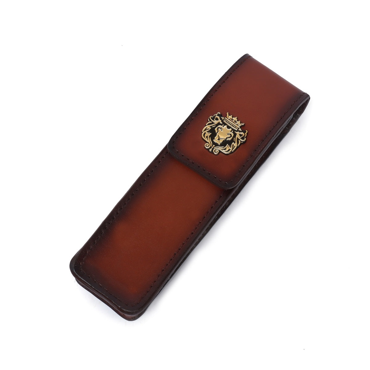 Tan Leather Pen Holder Magnetic Closure with Metal Lion Logo By Brune & Bareskin