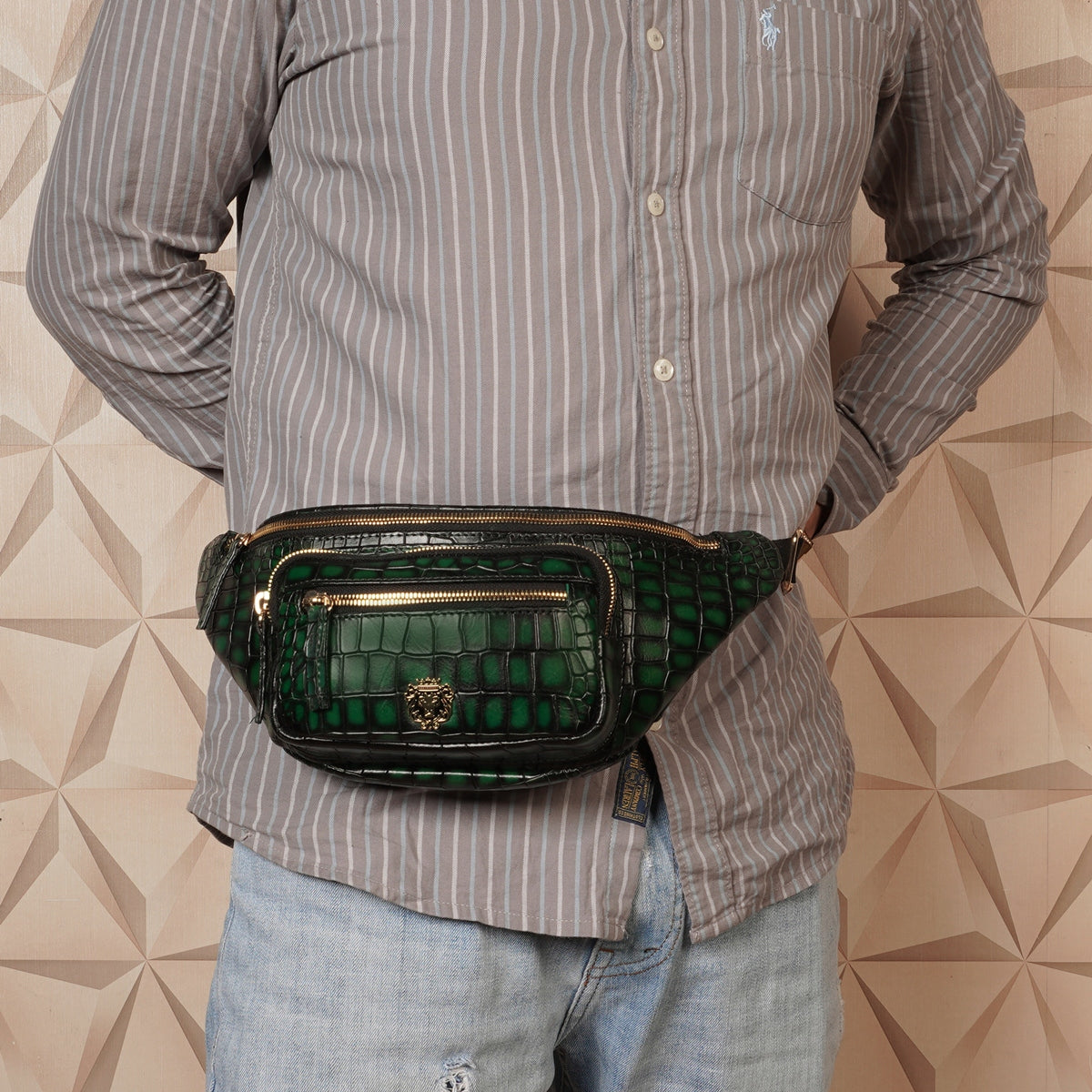 This modern yet classy cross-body bag is a must have especially for the travelers out there. The Green Deep Cut Croco Textured leather in Smokey finish looks lavishing. This trendsetter Deep Cut Croco Print Leather bag with BRUNE & BARESKIN Signature Lion Logo on the front looks astonishing. Multiple easy-access pockets provide ample but convenient space to put traveling essentials. The different size pockets provide the advantage to put things accordingly. It's also equipped with an adjustable strap for comfort and versatility. You can change the color of the bag and add your name initials on it as well.