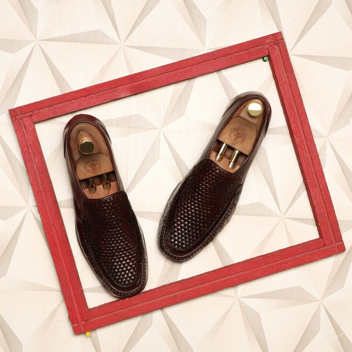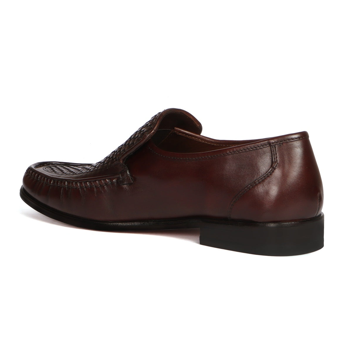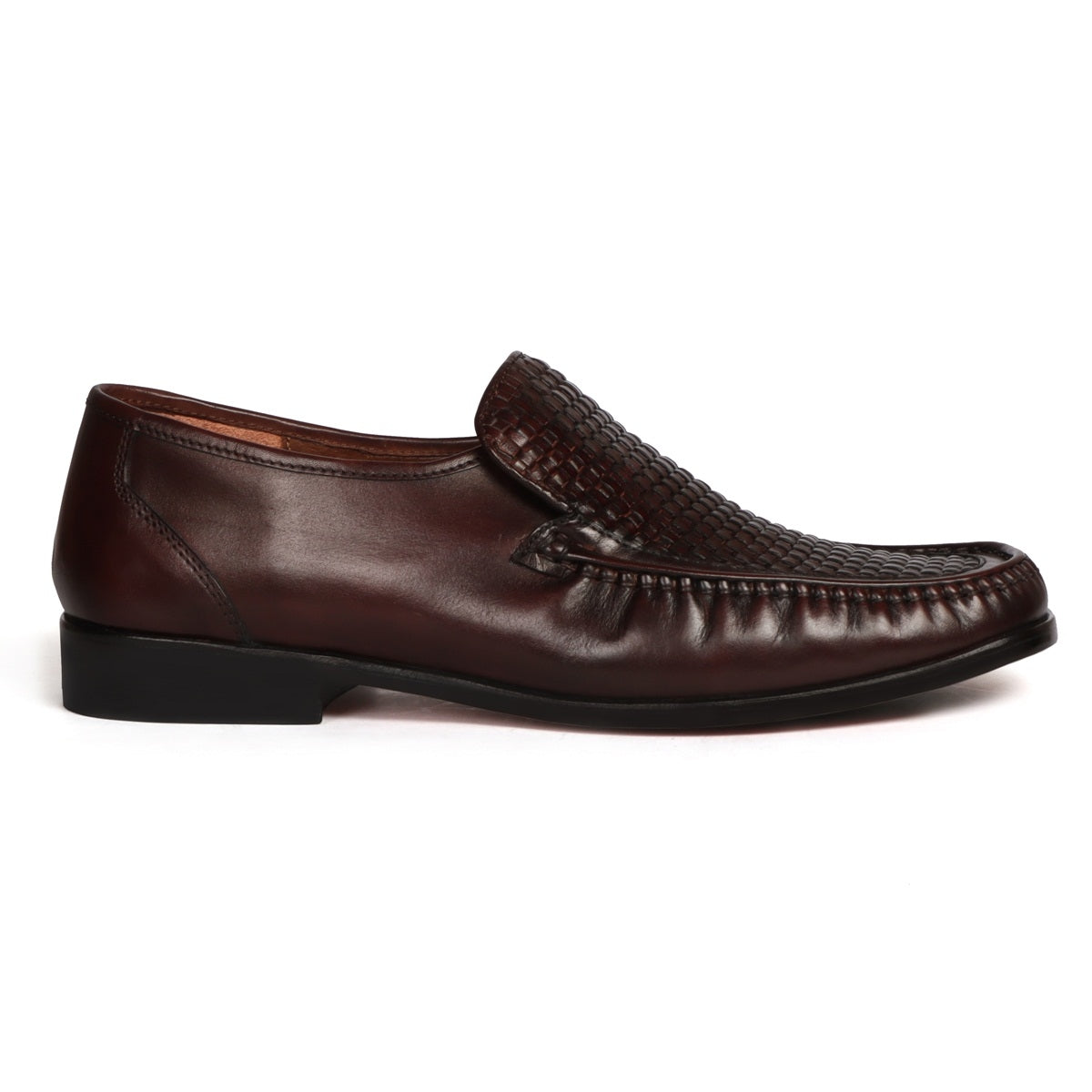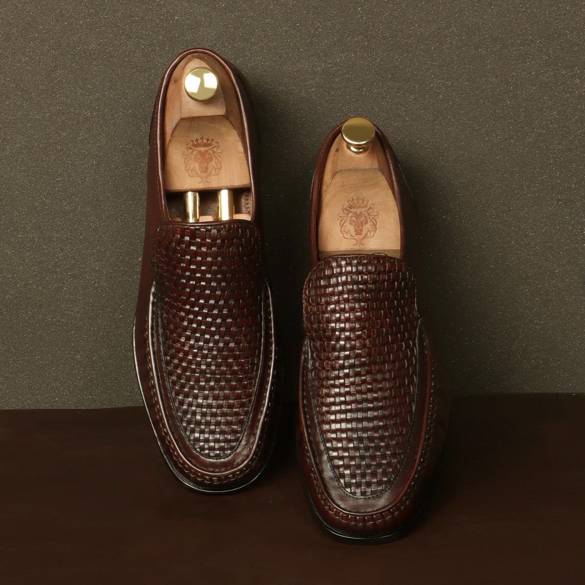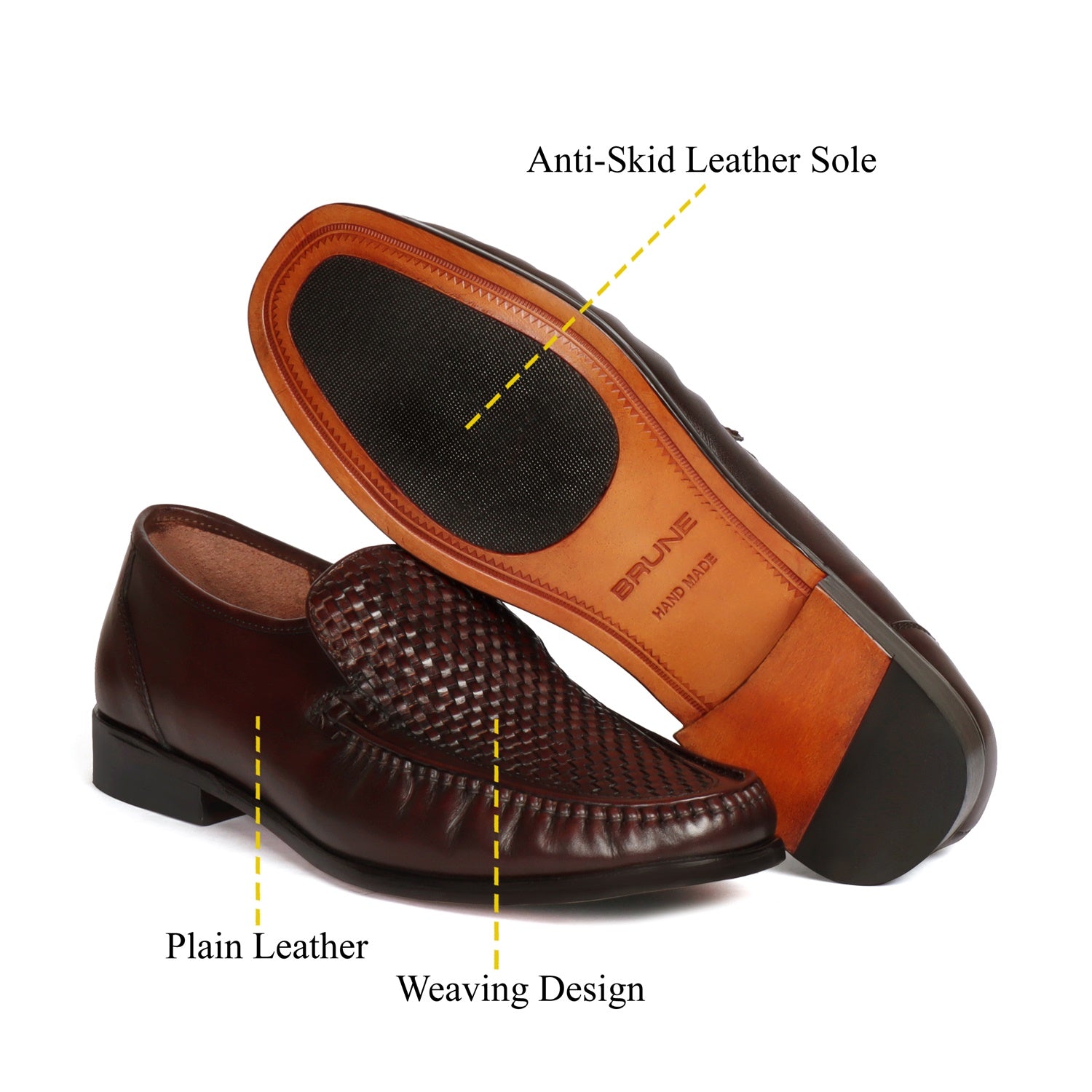 Weaved Vamp Leather Loafers in Dark Brown with Leather Sole