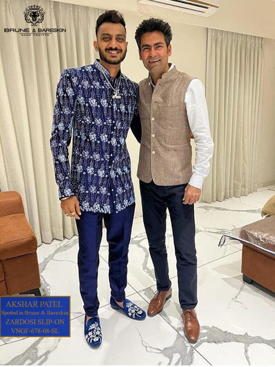 On seeing this ethnic Zardosi Slip-On Shoe, One thing comes to mind is "Woww !!! it's flawless for wedding season". It's beautifully handcrafted silver Floral Patterned embroidered pair on blue Italian velvet slip-on shoes. Brune & Bareskin's designs Extra comfy blue velvet slip-ons enhanced with zardosi artwork. A pair of blue round-toed semiformal slip-ons, velvet upper with blossom silver embroidered and zardosi detail. Zardosi Hand Work done by the most skilled sewing team in India makes this slip-on distinct from others. The right shoe choice can make your big day a remarkable memory. The detailing of hand zardozi work on blue Slip-on is revealing an impact of royal choice. Made using the most premium Italian Velvet, Rubber Sole with Anti Skid Pattern and extra cushioned padding in the insole.