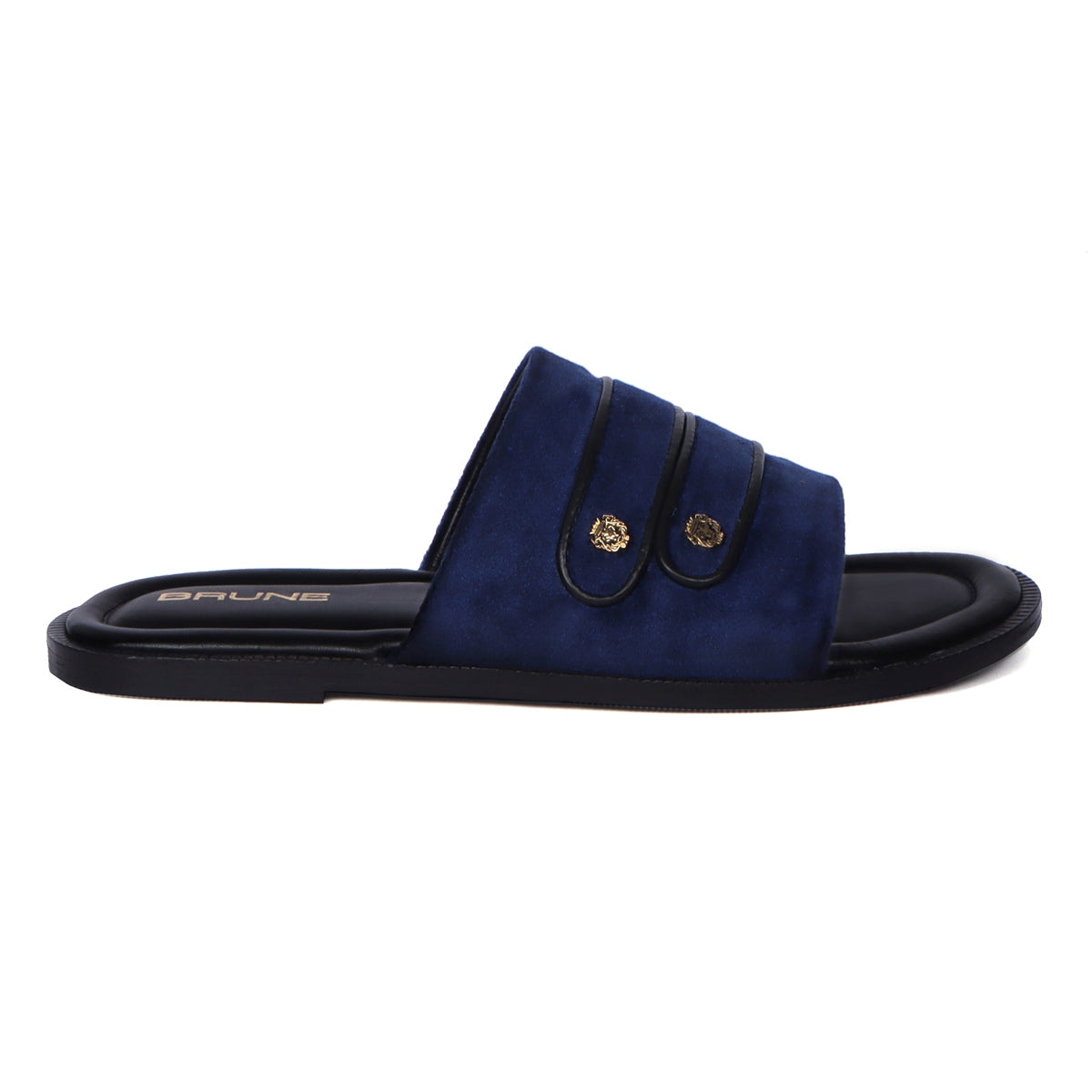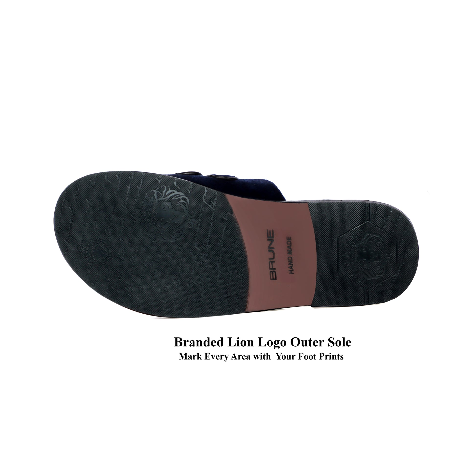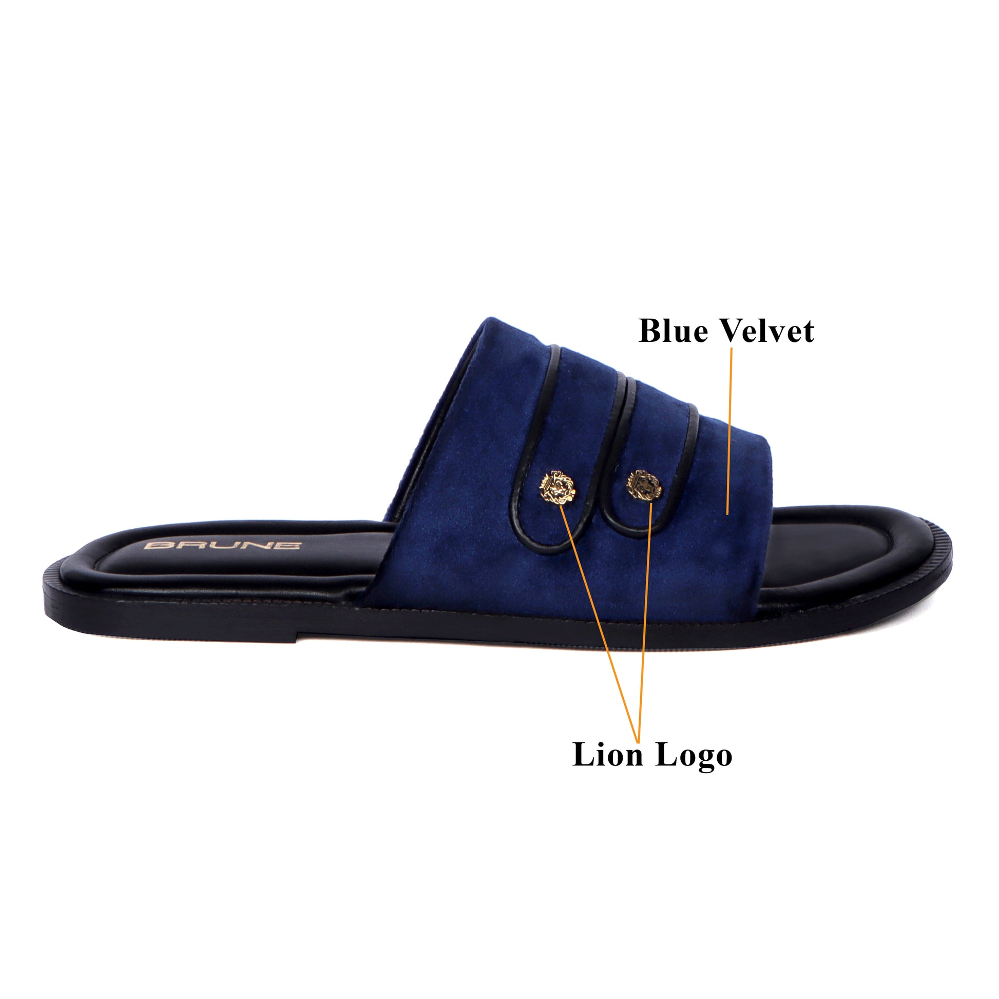 Brune & Bareskin men’s slide-in slippers are handcrafted with blue Italian velvet on the straps and black leather on the base. It is fitted with a flat memory foam sole for all-day comfort and support, it showcases an eye-catching detail with the two straps being embossed with the brand’s Lion logo metal charm. This pair is an ideal solution that offers comfort, a sensation of well-being, and stylishness as well. Anti-skid rubber outer sole ensures the perfect walking grip. You can get it made in your favorite color with our bespoke services.