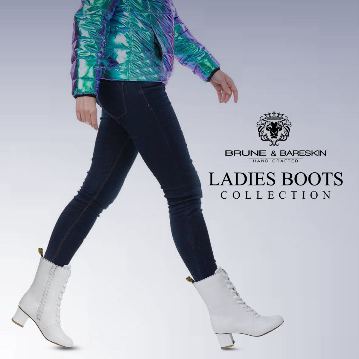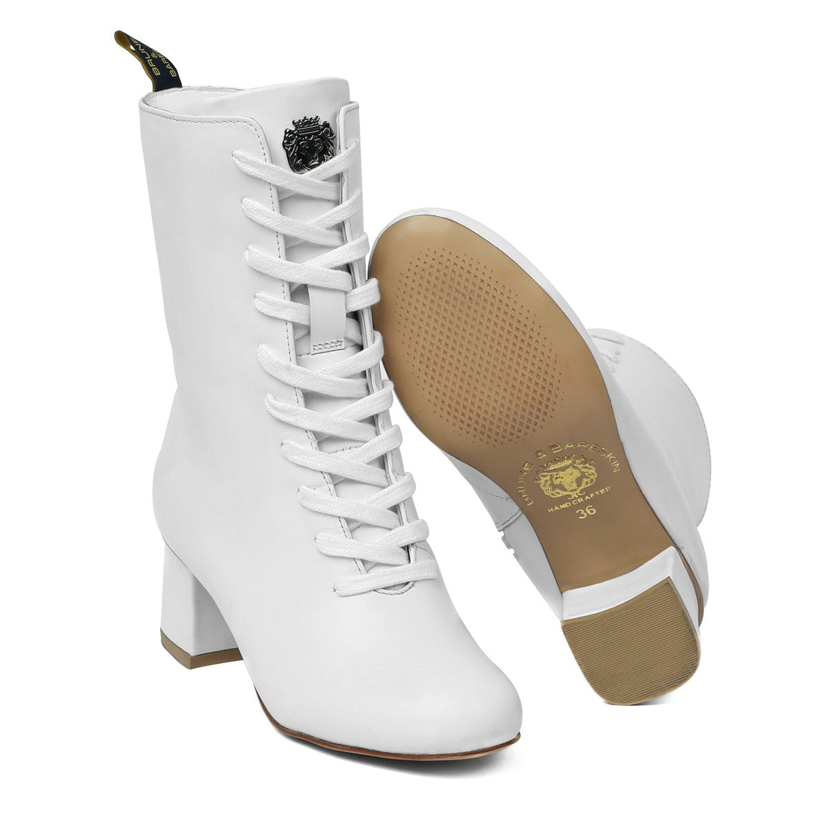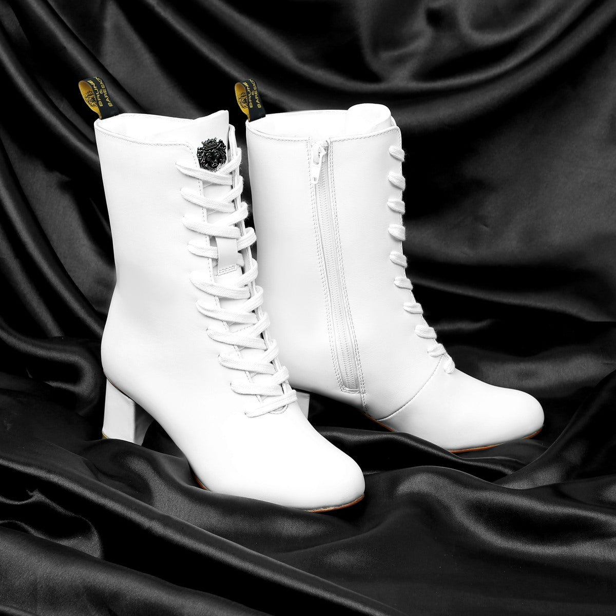 The White genuine leather made lace up boots are the perfect companion in winters. The cap toe and ideal high raise blocked heel provides the elegance. These boots are made to keep the comfort and style at its best. The special design at the top admires the natural movement of knees and legs. The long zipper closure provides a smooth plain feel on the front with easy to access. Long laces take care the style appeal and proper fit. White Leather Ladies Boots looks lavishing with Brune & Bareskin's signature metal lion logo. High Raise blocked heel adds up the extra elegance to look. Carry it with a denim jacket, leather jacket and slim fit jeans and be the center of attraction wherever you go.