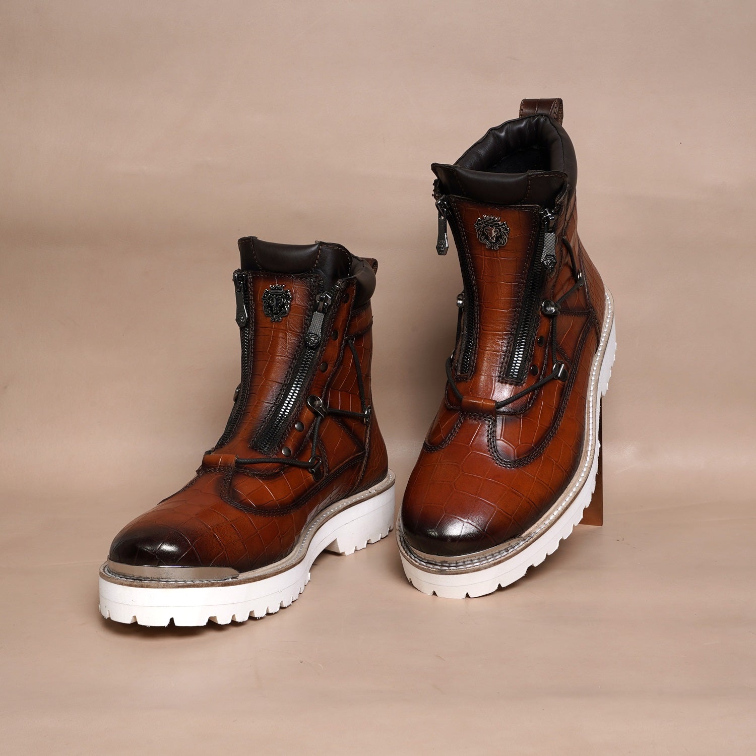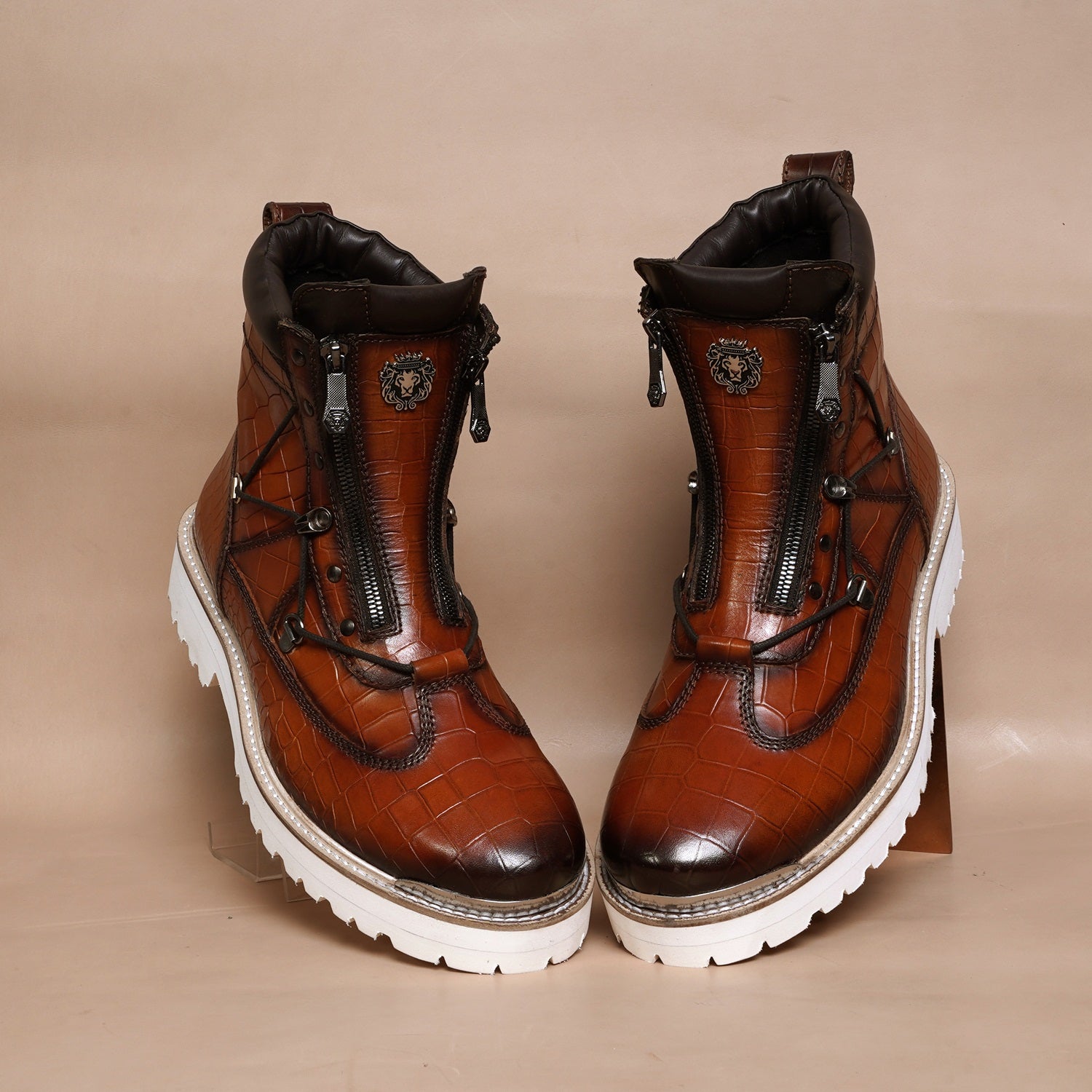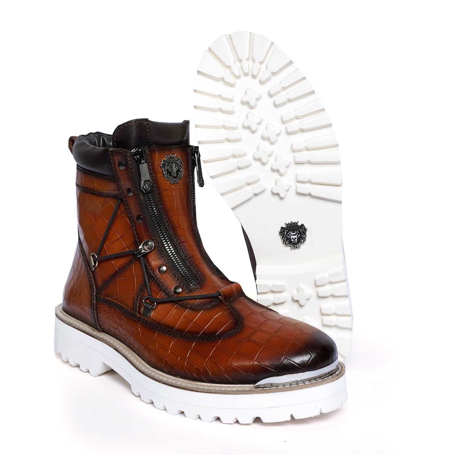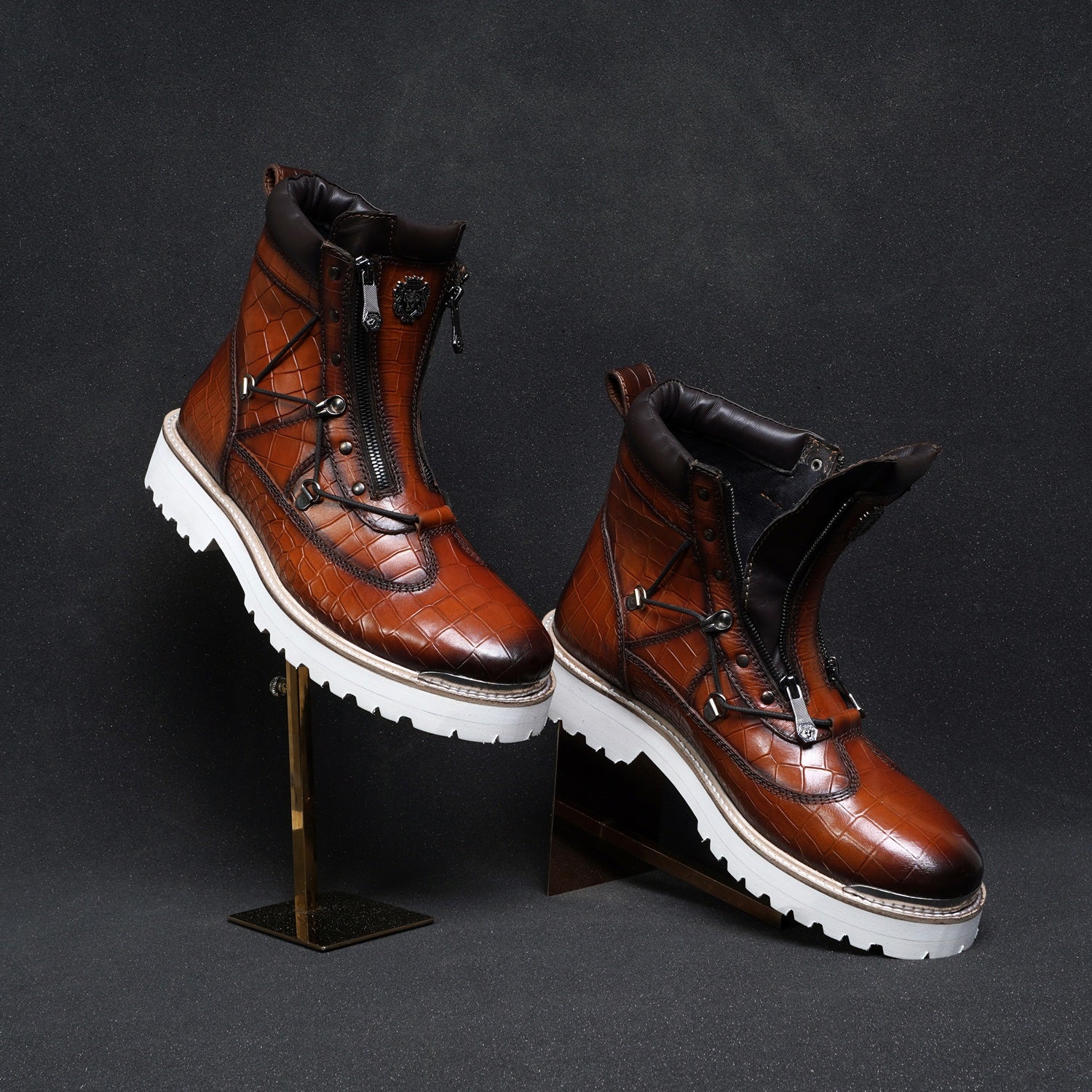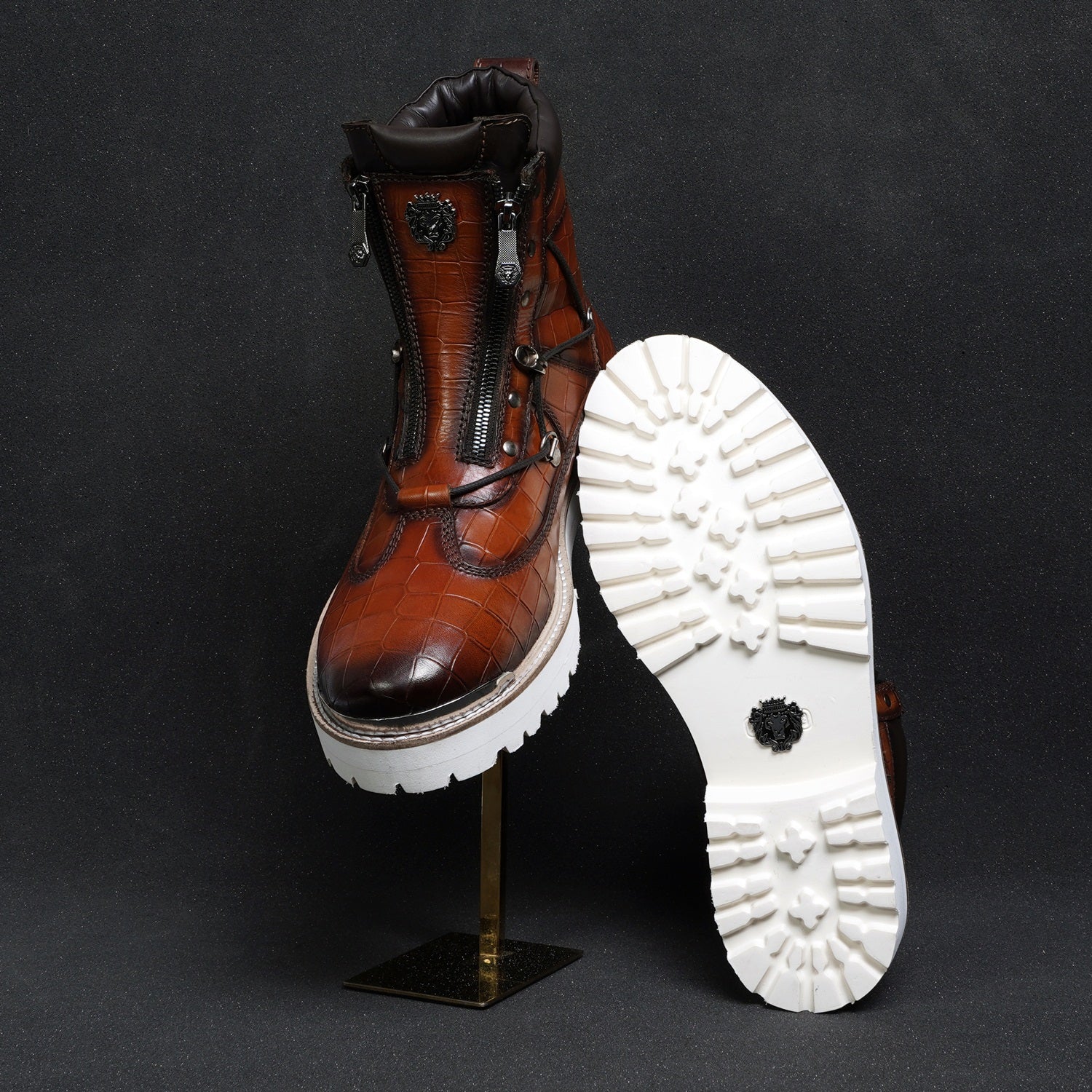 Step into style with the White Chunky Sole Boot in Tan Deep Cut Leather by Brune & Bareskin. The chunky, combat-style design features a deep cut croco textured leather in a striking Burnished Tan color, complete with a front zipper and fixed lace-up closure for a secure fit. The metal lion logo and metal plates on the toe add a touch of edginess. With its white chunky sole and rubberized heeled sole, these ankle-length boots offer both fashion and functionality.