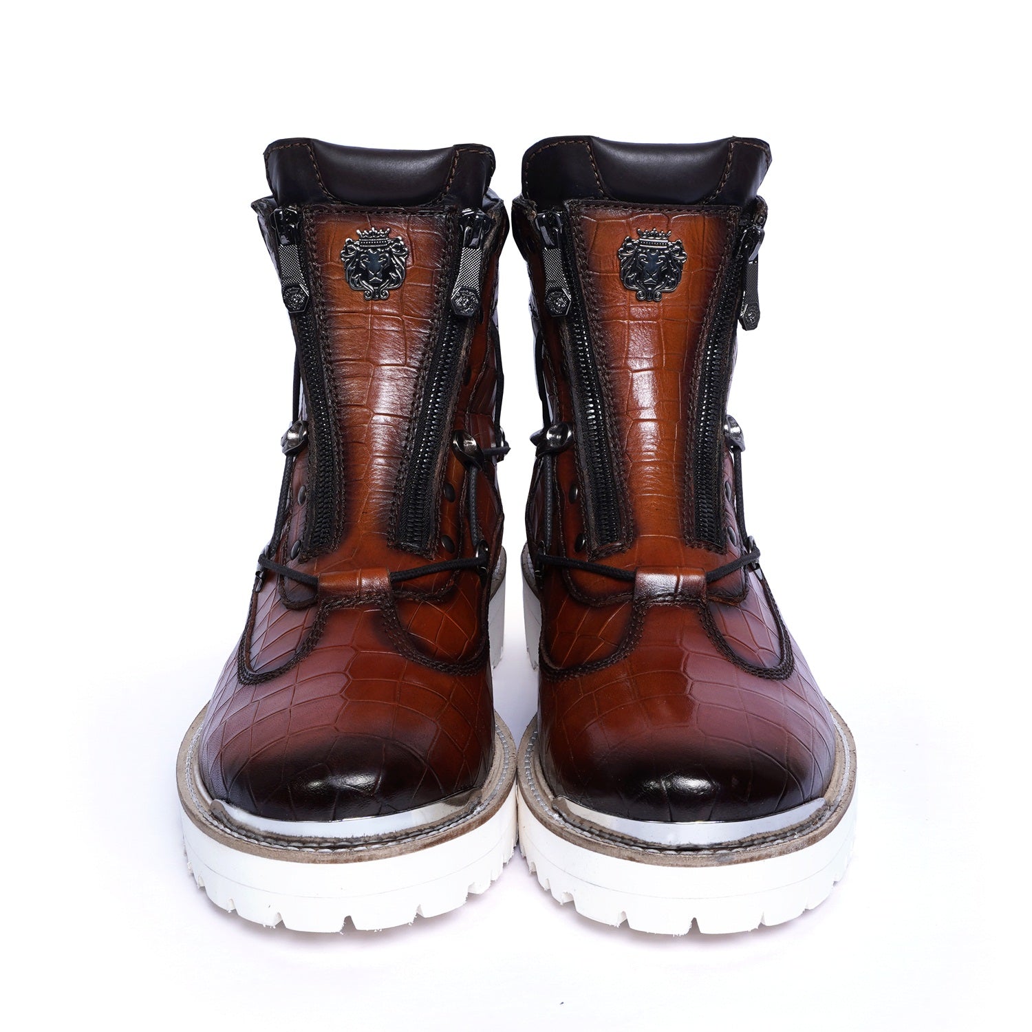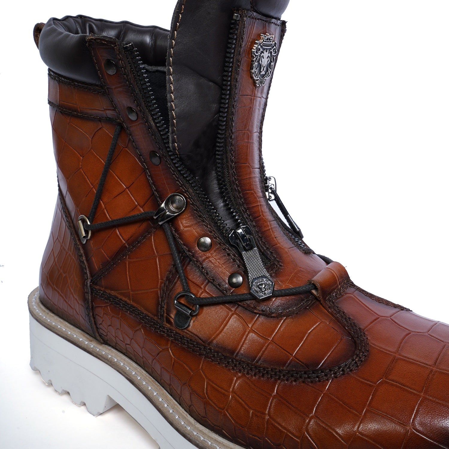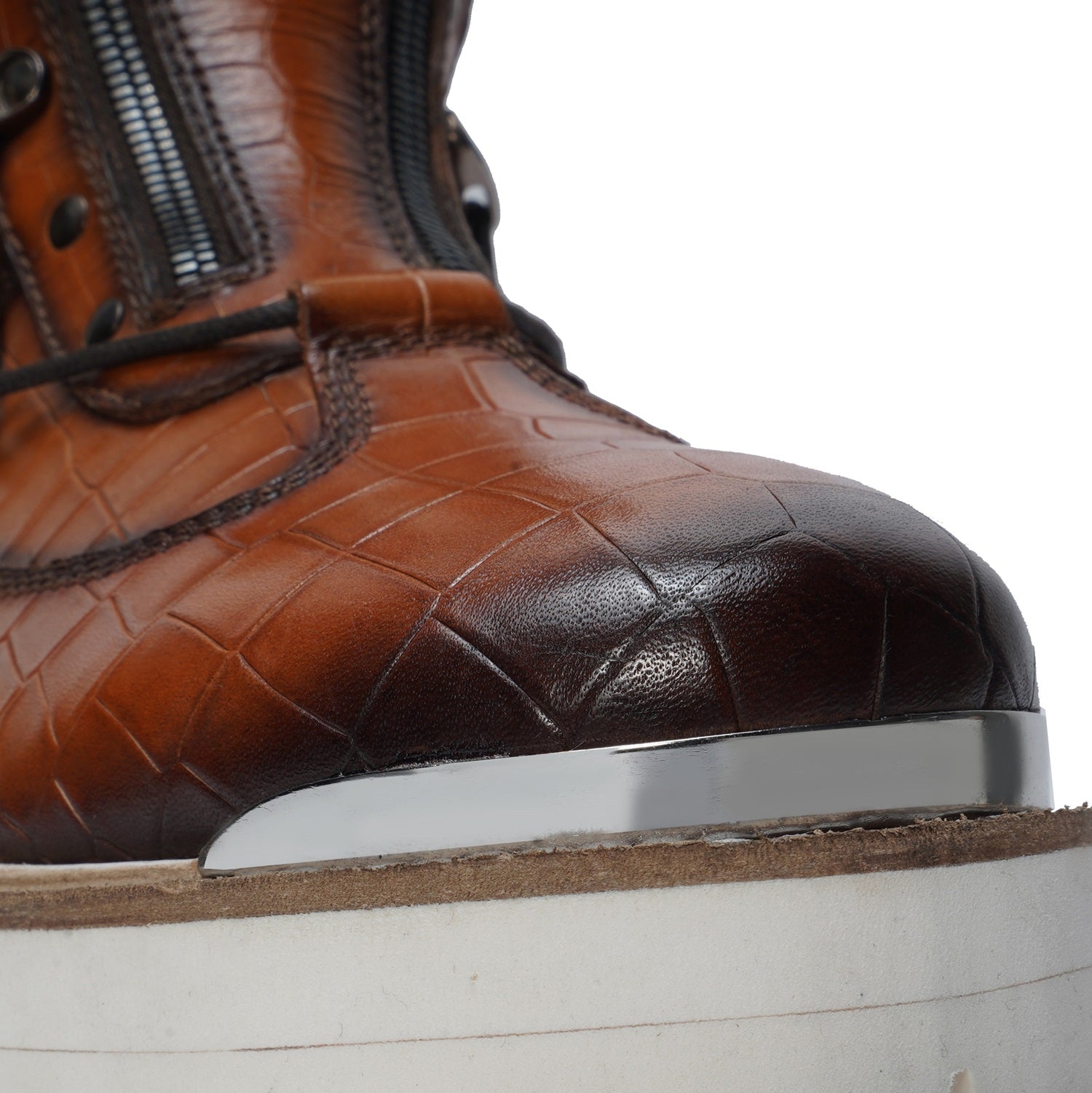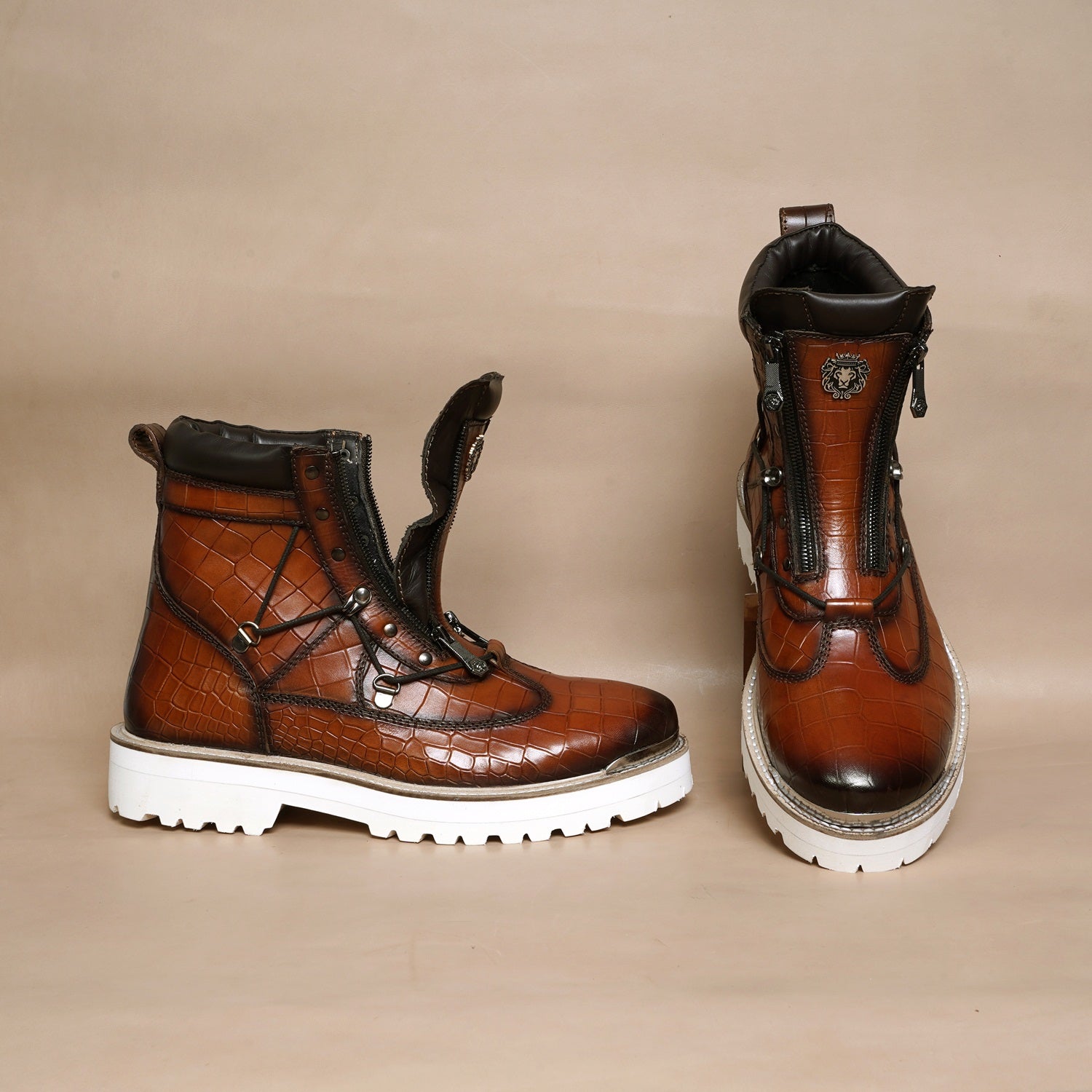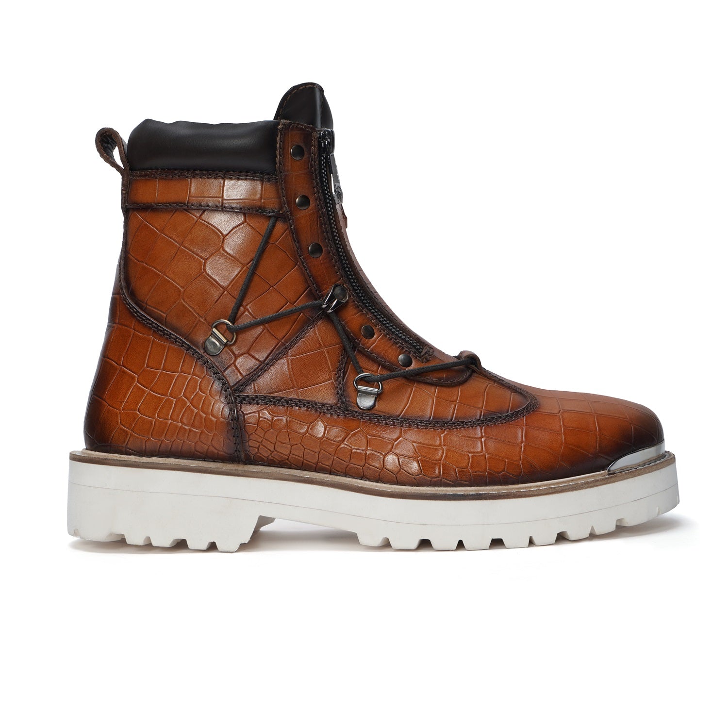 Step into style with the White Chunky Sole Boot in Tan Deep Cut Leather by Brune & Bareskin. The chunky, combat-style design features a deep cut croco textured leather in a striking Burnished Tan color, complete with a front zipper and fixed lace-up closure for a secure fit. The metal lion logo and metal plates on the toe add a touch of edginess. With its white chunky sole and rubberized heeled sole, these ankle-length boots offer both fashion and functionality.