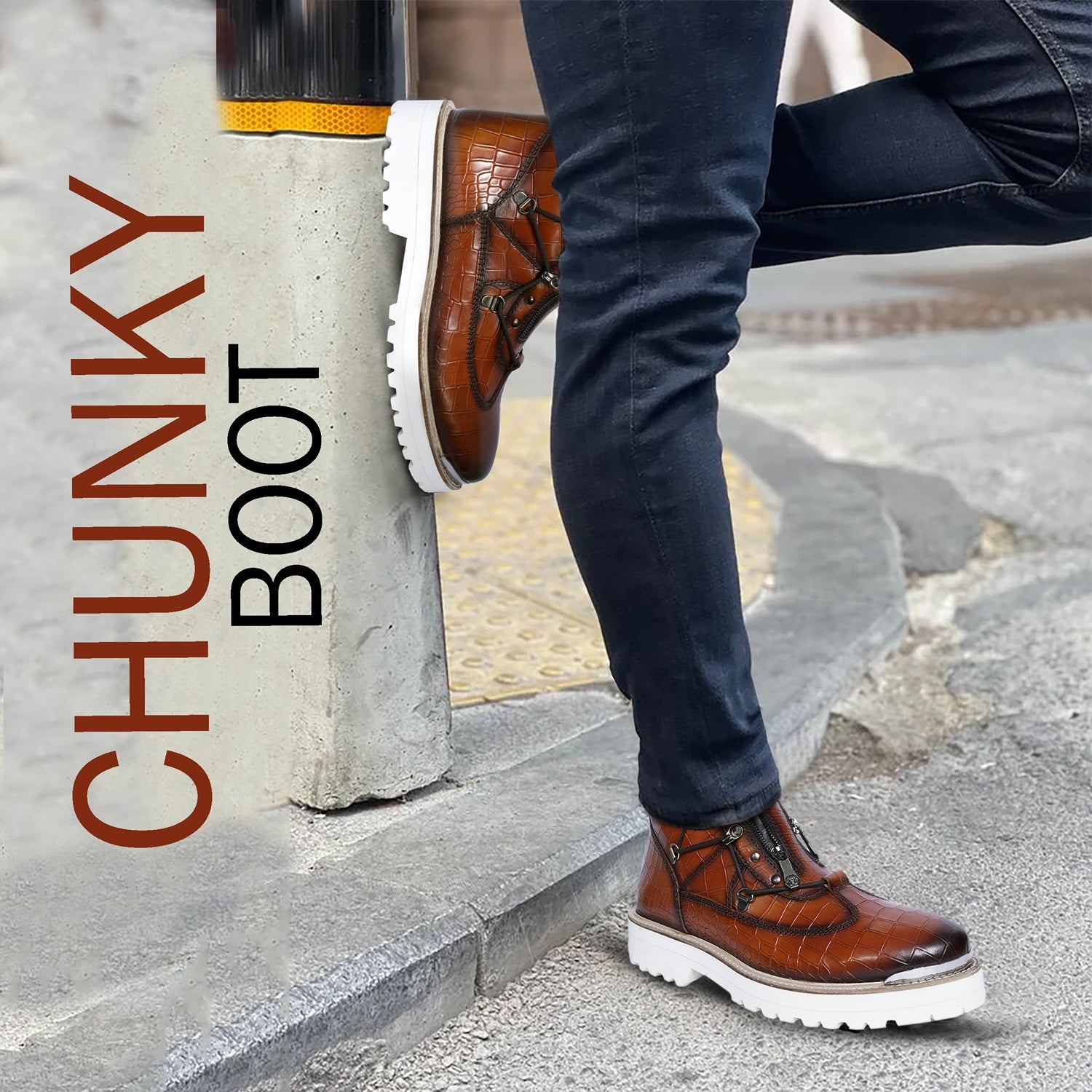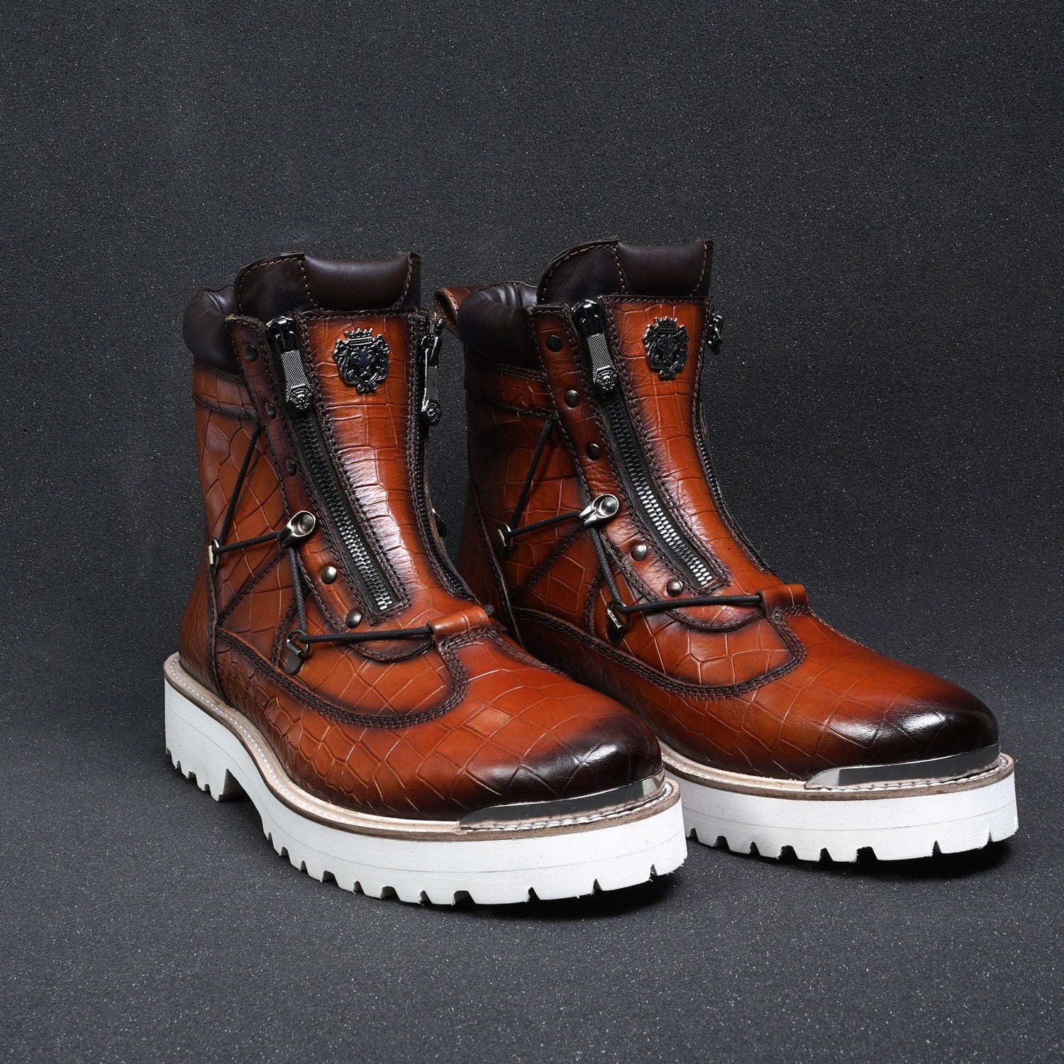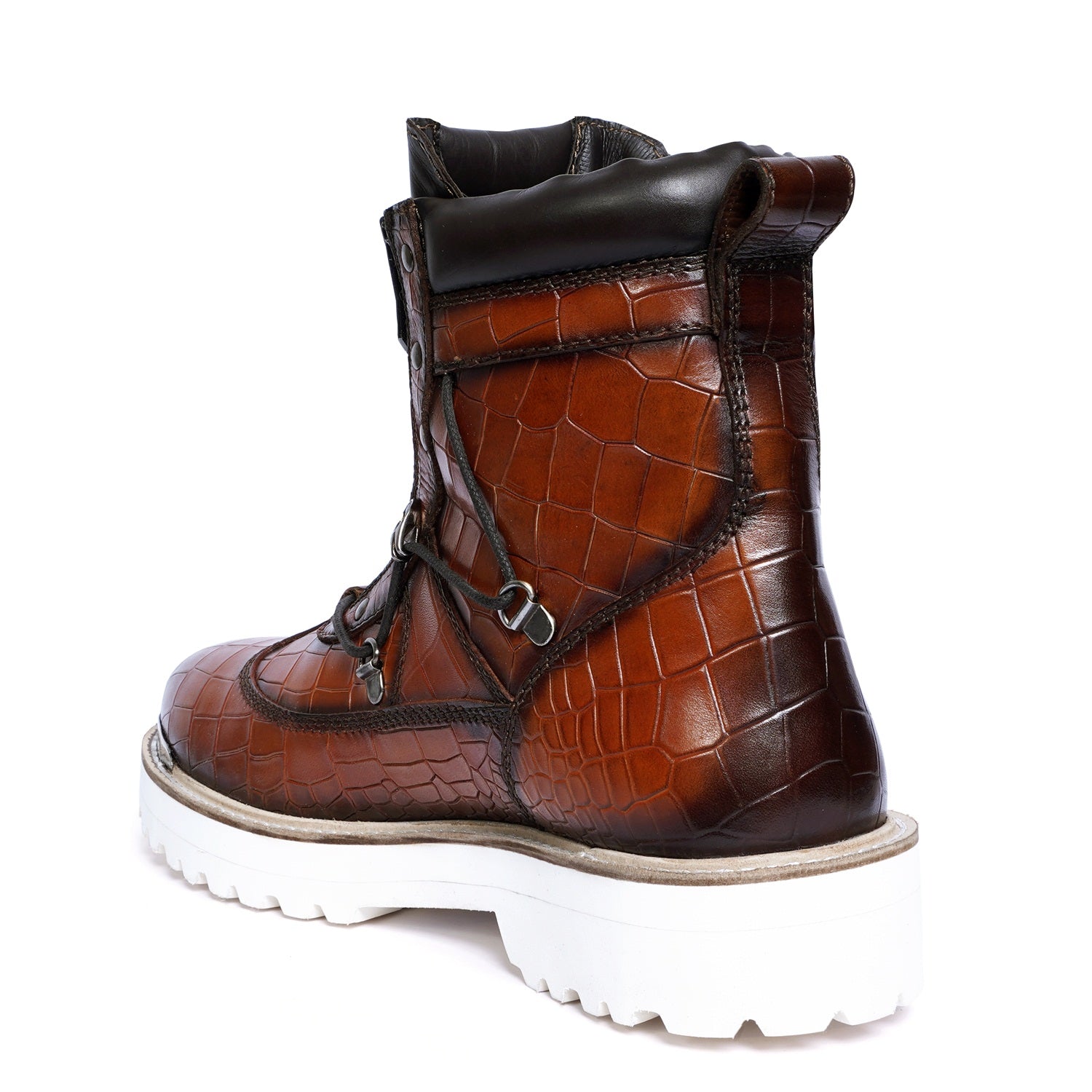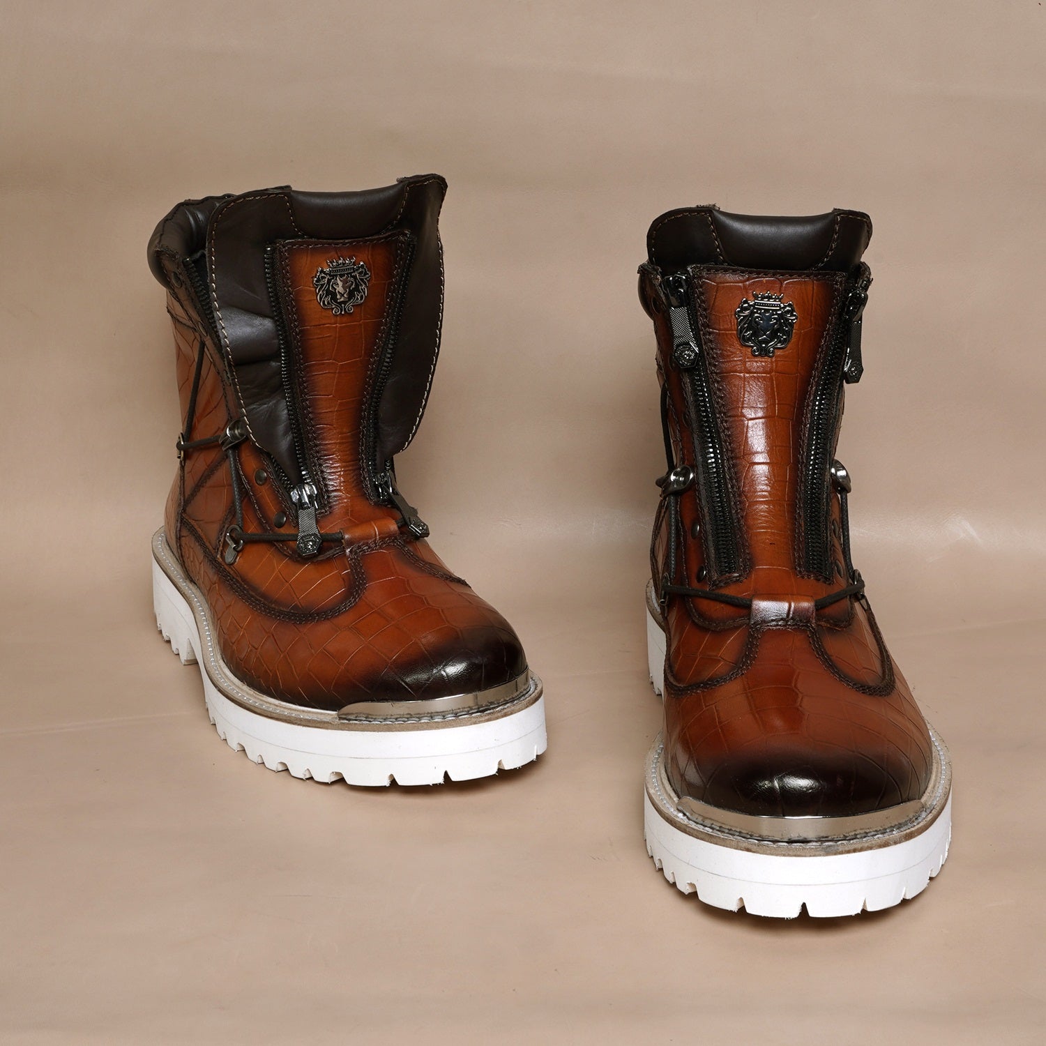 Step into style with the White Chunky Sole Boot in Tan Deep Cut Leather by Brune & Bareskin. The chunky, combat-style design features a deep cut croco textured leather in a striking Burnished Tan color, complete with a front zipper and fixed lace-up closure for a secure fit. The metal lion logo and metal plates on the toe add a touch of edginess. With its white chunky sole and rubberized heeled sole, these ankle-length boots offer both fashion and functionality.