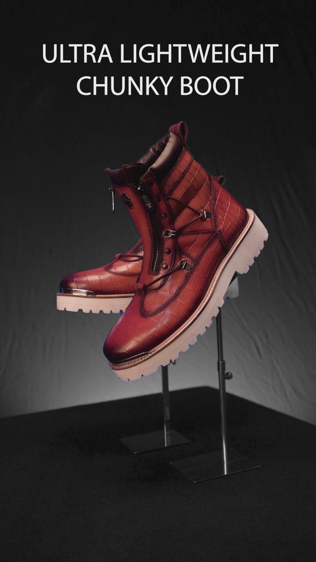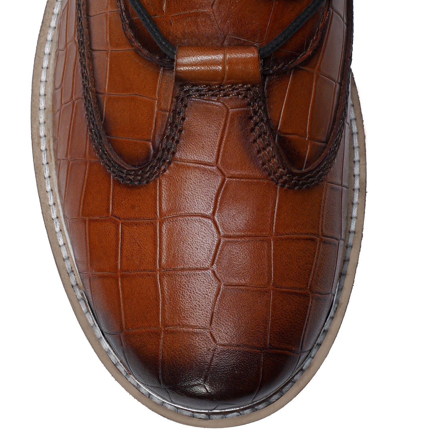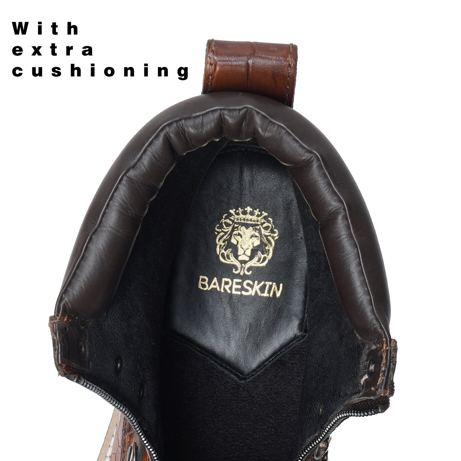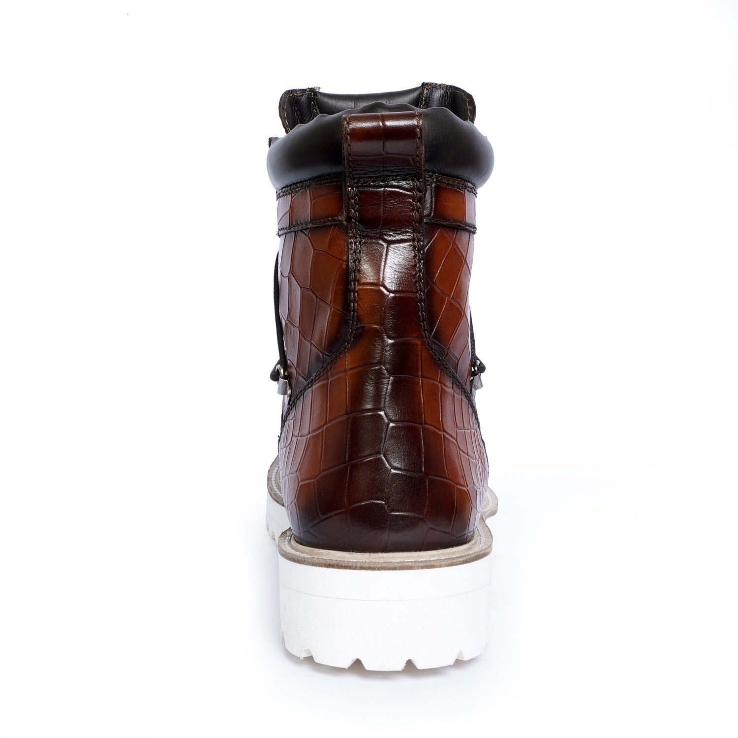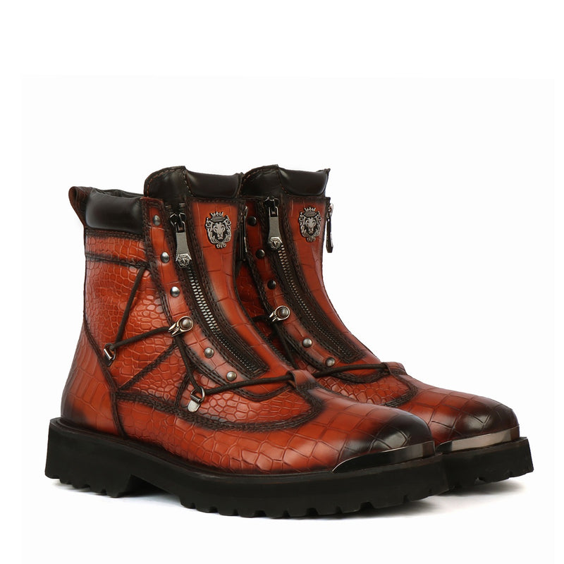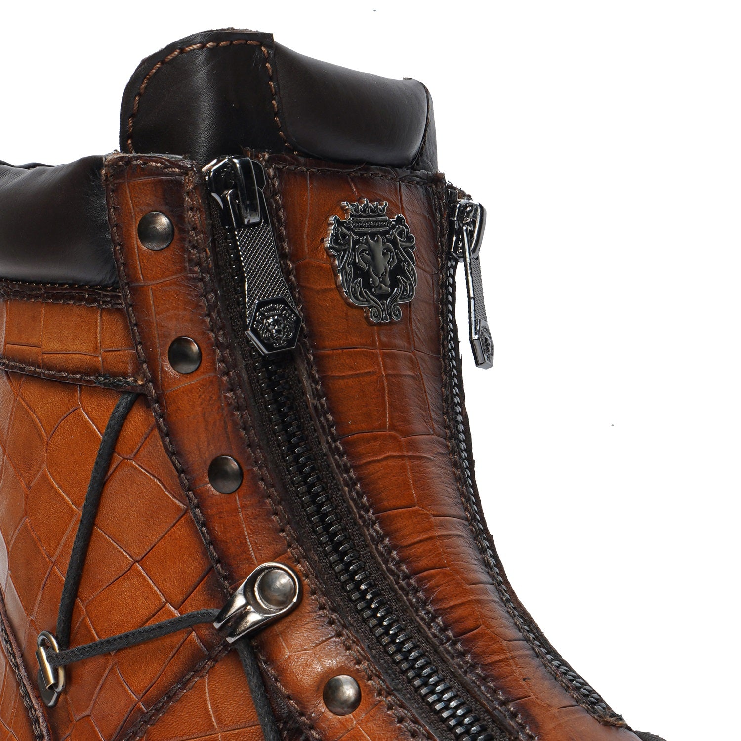 Step into style with the White Chunky Sole Boot in Tan Deep Cut Leather by Brune & Bareskin. The chunky, combat-style design features a deep cut croco textured leather in a striking Burnished Tan color, complete with a front zipper and fixed lace-up closure for a secure fit. The metal lion logo and metal plates on the toe add a touch of edginess. With its white chunky sole and rubberized heeled sole, these ankle-length boots offer both fashion and functionality.