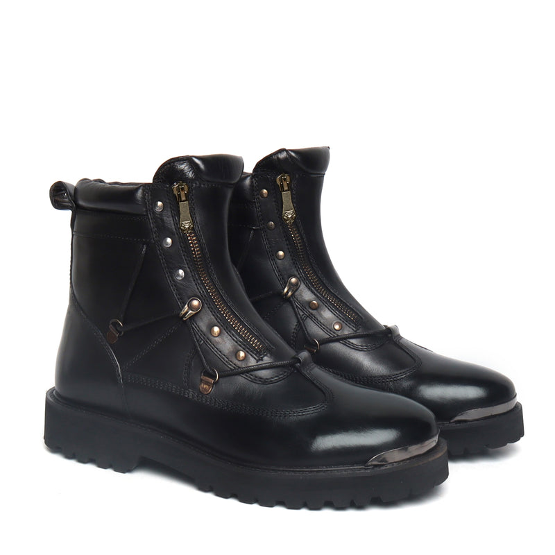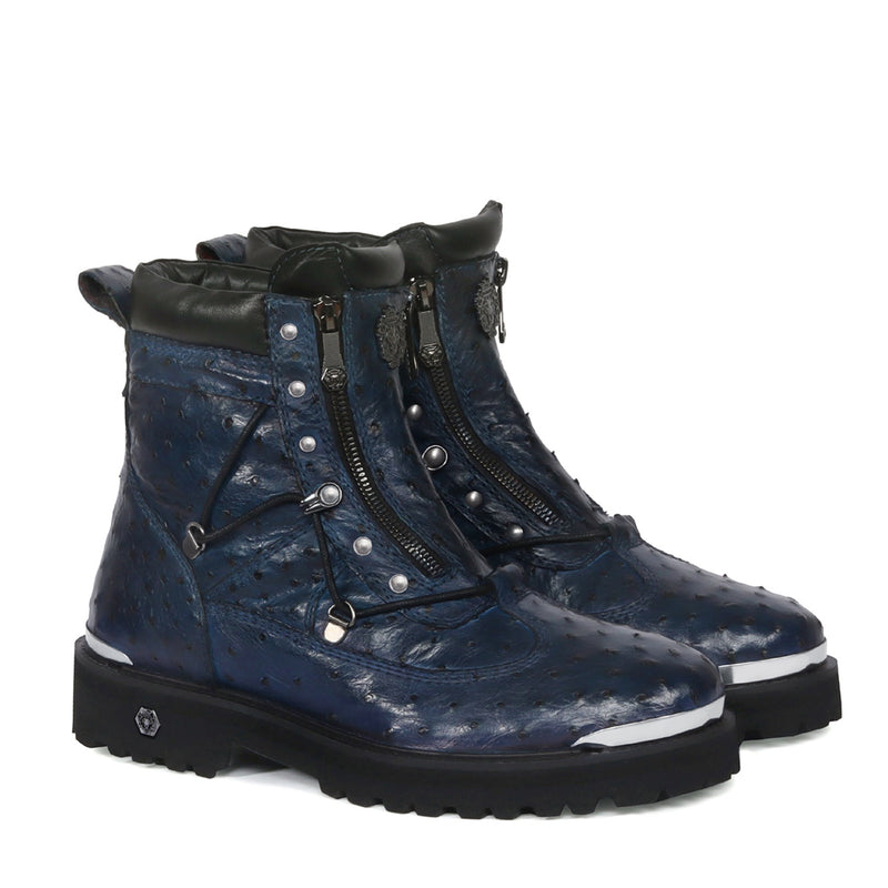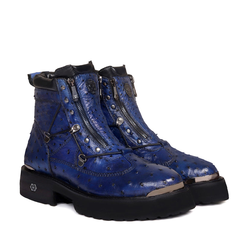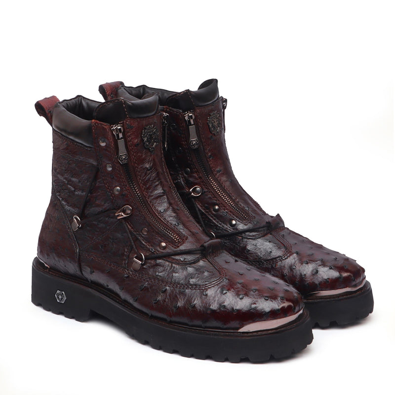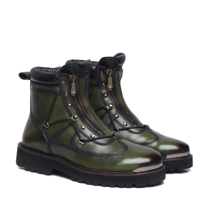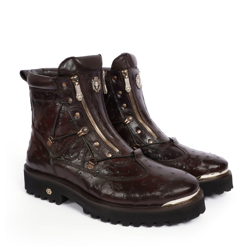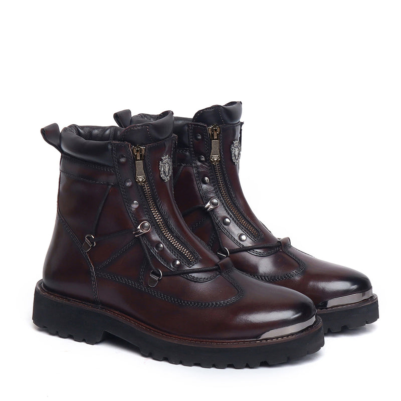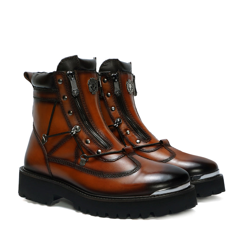 Step into style with the White Chunky Sole Boot in Tan Deep Cut Leather by Brune & Bareskin. The chunky, combat-style design features a deep cut croco textured leather in a striking Burnished Tan color, complete with a front zipper and fixed lace-up closure for a secure fit. The metal lion logo and metal plates on the toe add a touch of edginess. With its white chunky sole and rubberized heeled sole, these ankle-length boots offer both fashion and functionality.