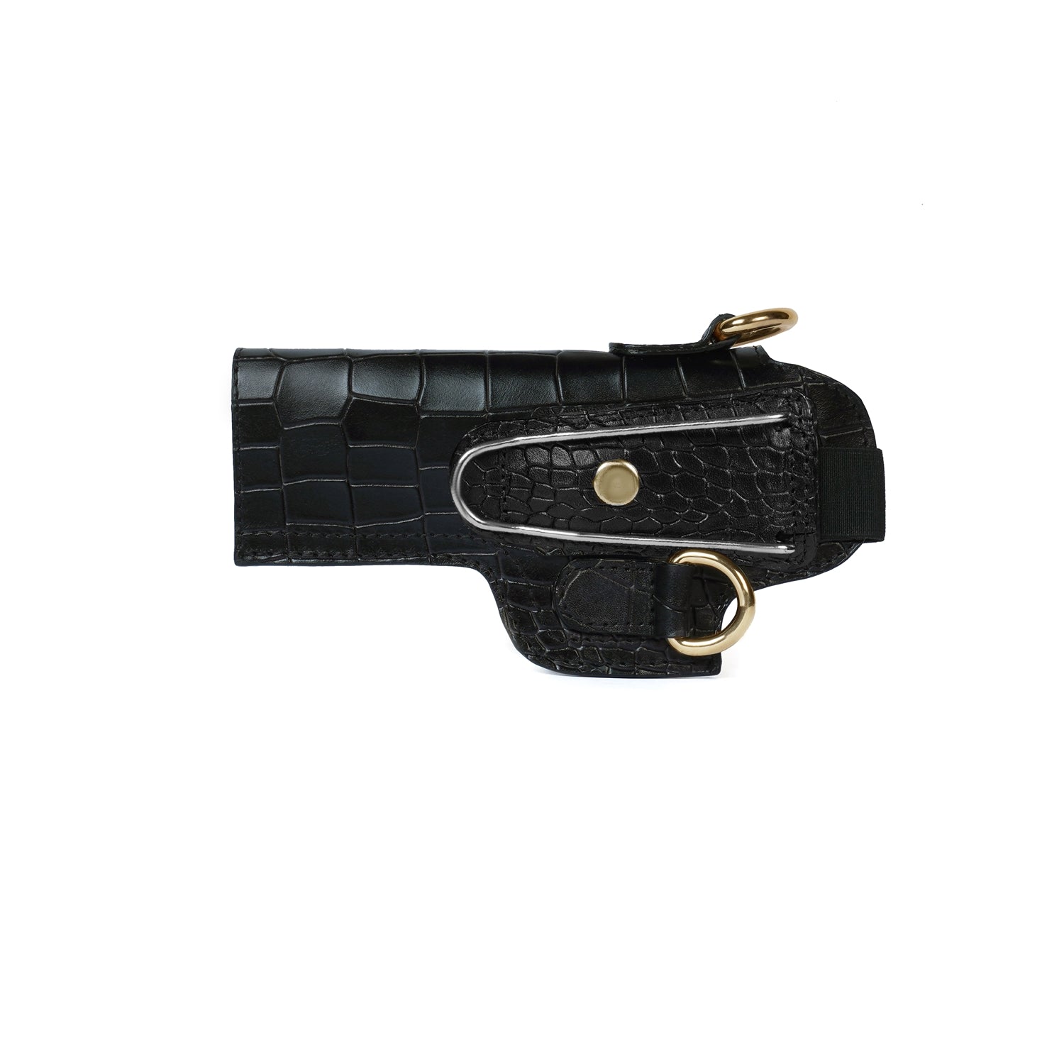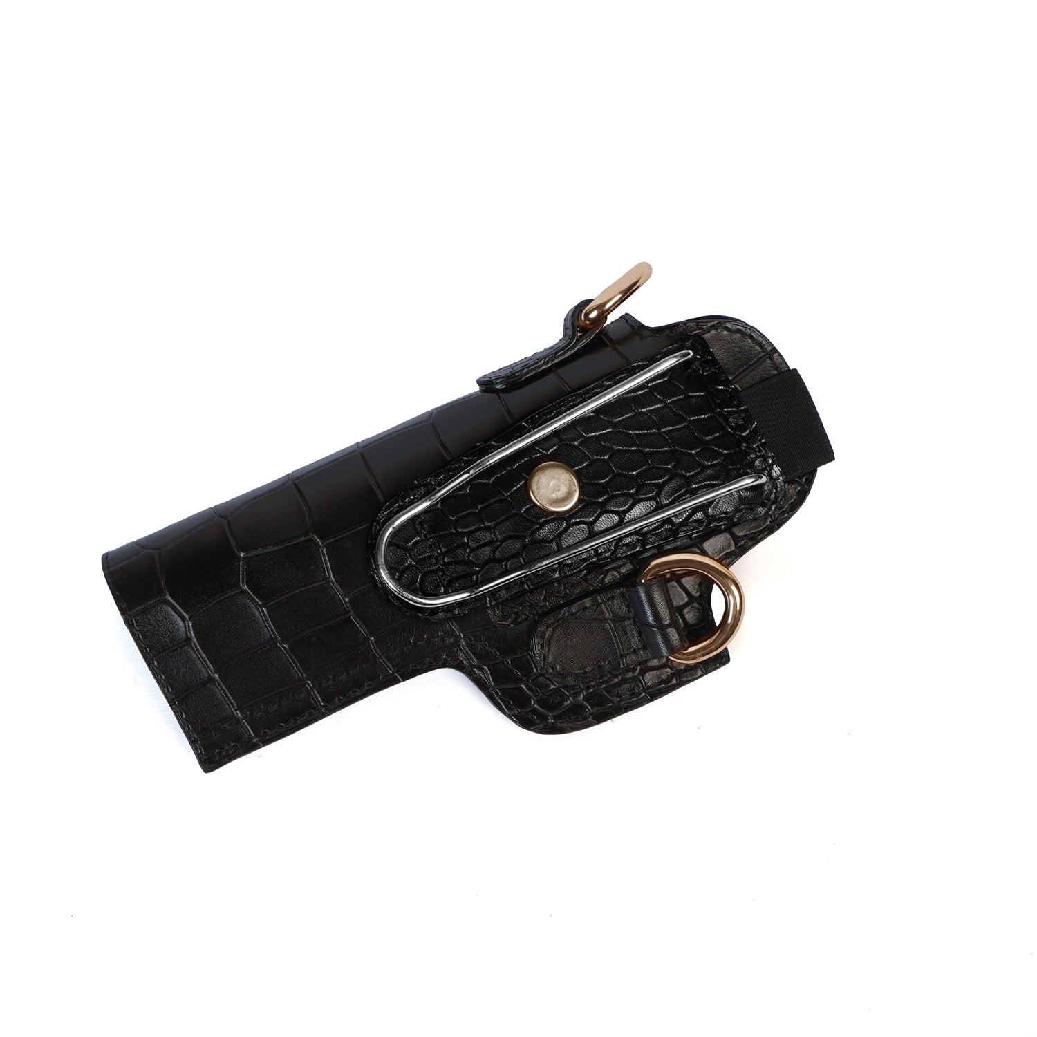 It's super stylish & elegant gun cover by Brune & Bareskin. Made of deep cut croco leather in black color. This specific cover is for .45 revolver, ideal for webley or Indian ordinance revolver. Strong & wide adjustable strap is attached to maintain its durability & comfort to wear through your chest. Bullet holders on wide adjustable leather strap added to enhance the elegance further. BRUNE & BARESKIN signature metal lion logo on wide velcro strap is added to enhance the elegance further. It gives classy look to a person when some one holds it. These can be customized to any size weapon .32, 9mm and .45 pistol and revolvers. We offer name Initials and other personalization like color change , laser engraving of logos or slogans. For this please write to us by choosing the "customization tab".