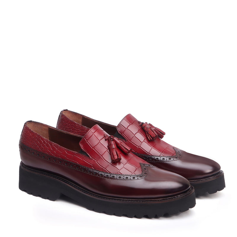 Wine & Black Croco Print Leather Light Weight Tassel Slip-Ons By Brune & Bareskin