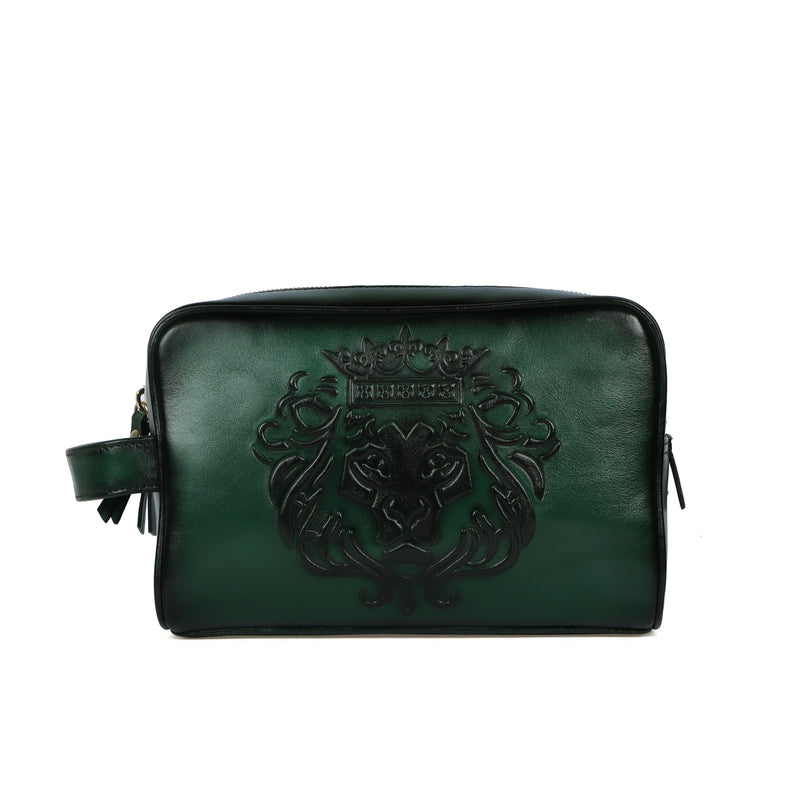 Wine Burnished Deep Cut Leather Embossed Lion Toiletry / Slim Kit Travel Bag