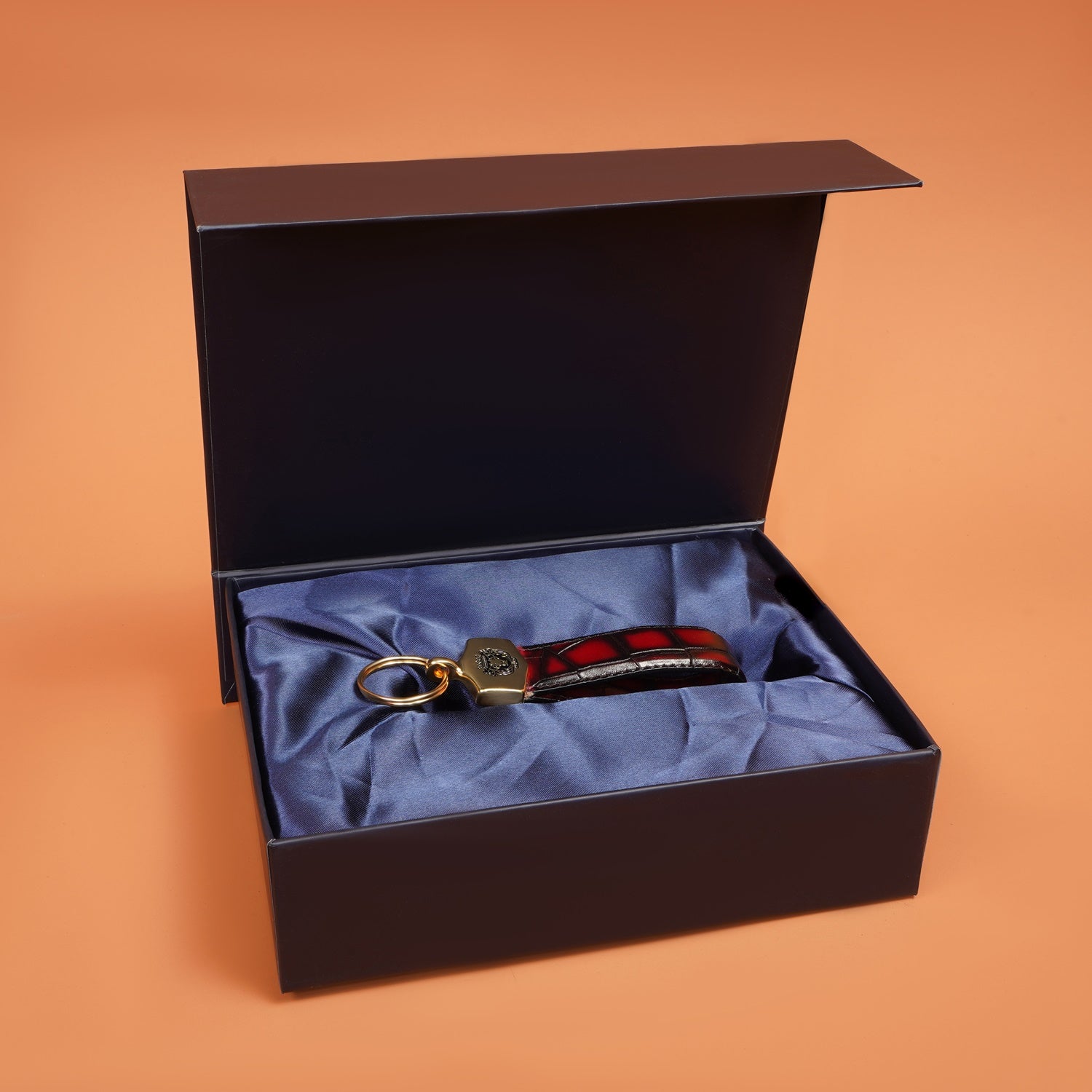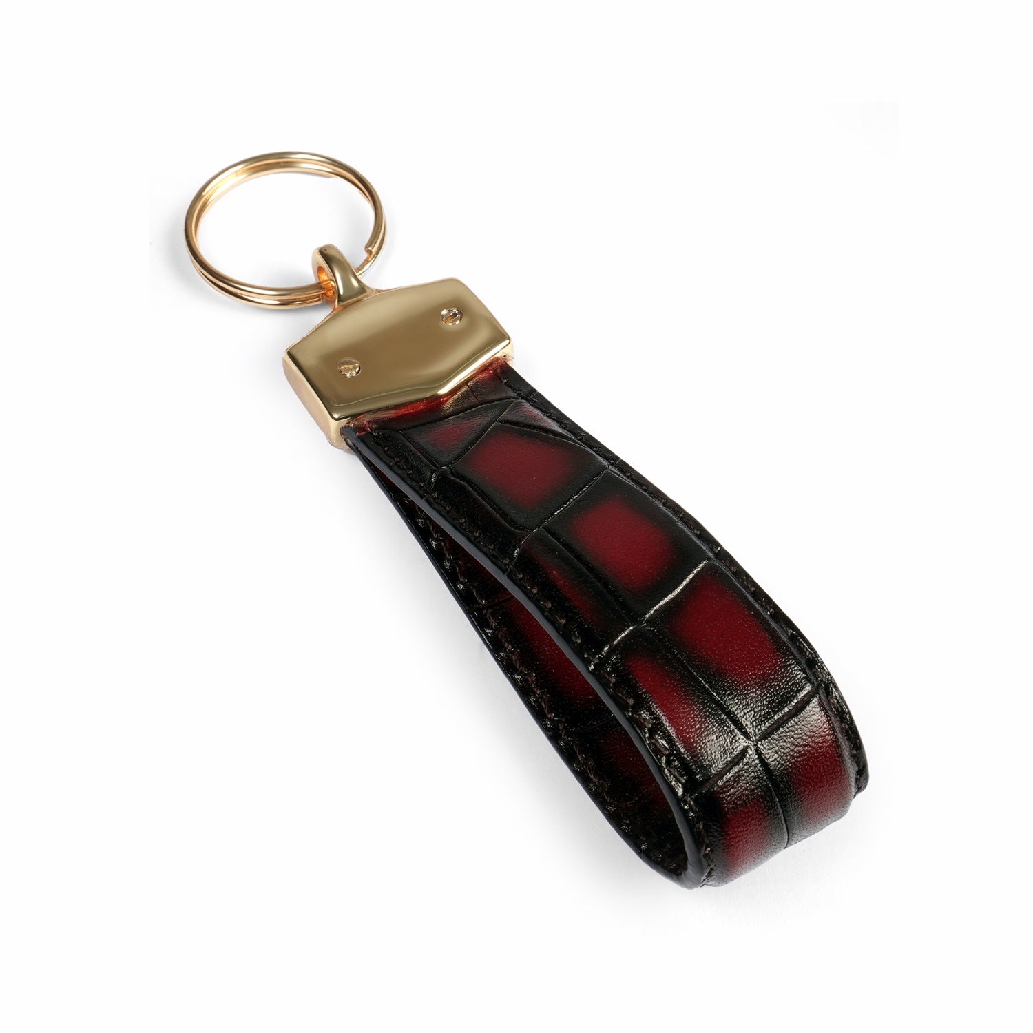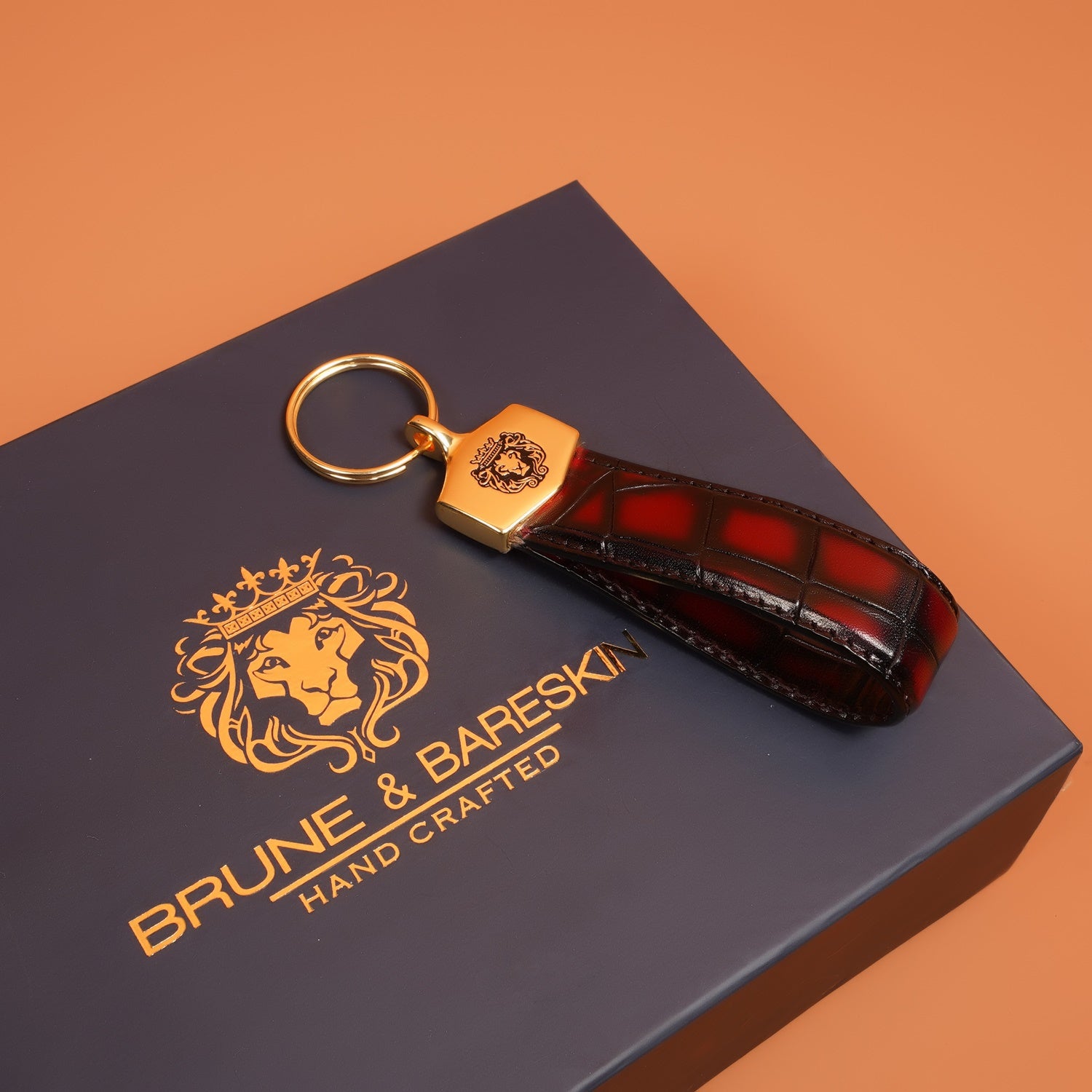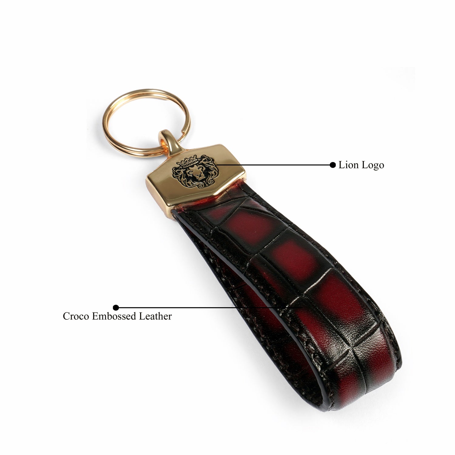 This elegant croco embossed leather keychain is a stylish travel accessory. The wine color provides a very chic look. The gold finish fittings compliments its overall color. Brune & Bareskin signature lion logo on the center looks very elegant. You can also get it customized especially for you with your name initials and favorite color.