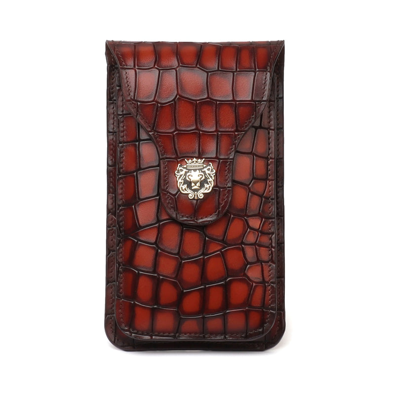 Nowadays, Mobile cover is everyone's need, but deep cut croco should be classy as well as trendy. This wine double pocket deep cut croco mobile cover is surely an elegant pick. It has one compartment to carry mobile phone and one additional pocket to carry cards or cash. The magnetic flap covers the both pockets to provide an additional layer of security and elegance. The BRUNE & BARESKIN metal Lion logo plate at the flap provides a very elite look to it. The adjustable strap helps to carry it very conveniently. This high veg tanned Croco leather will surely serve you for a very long time. You can get it customized with your name initials in your required color shade with our Bespoke Services.