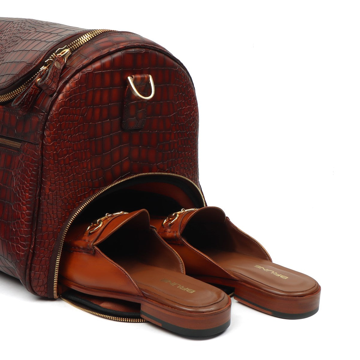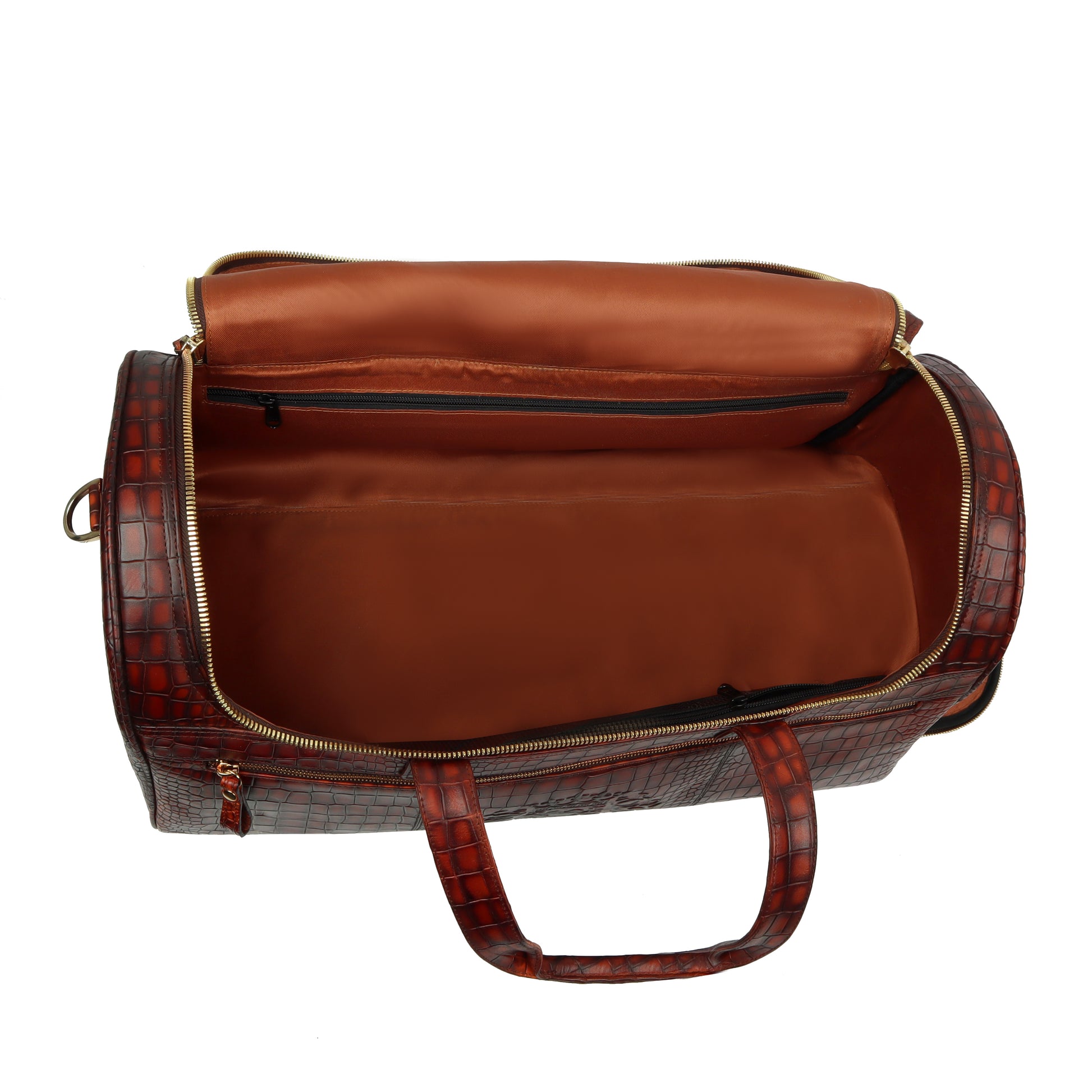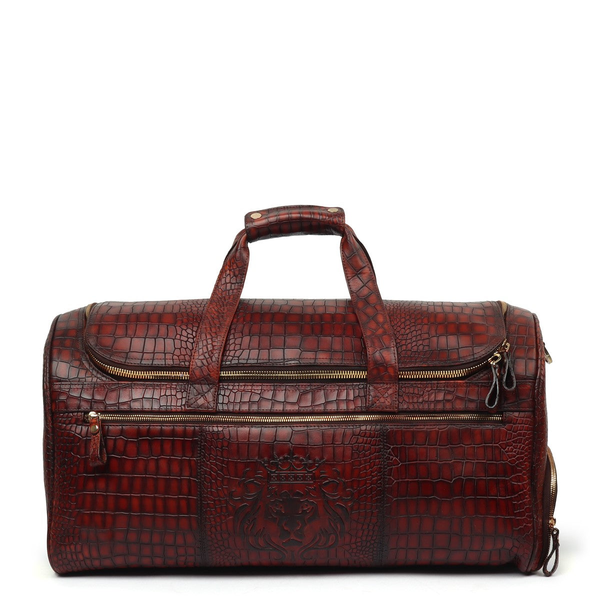 Wine Deep Cut Croco Multi-Pockets Smoky Finish Leather Duffle Bag By Brune & Bareskin