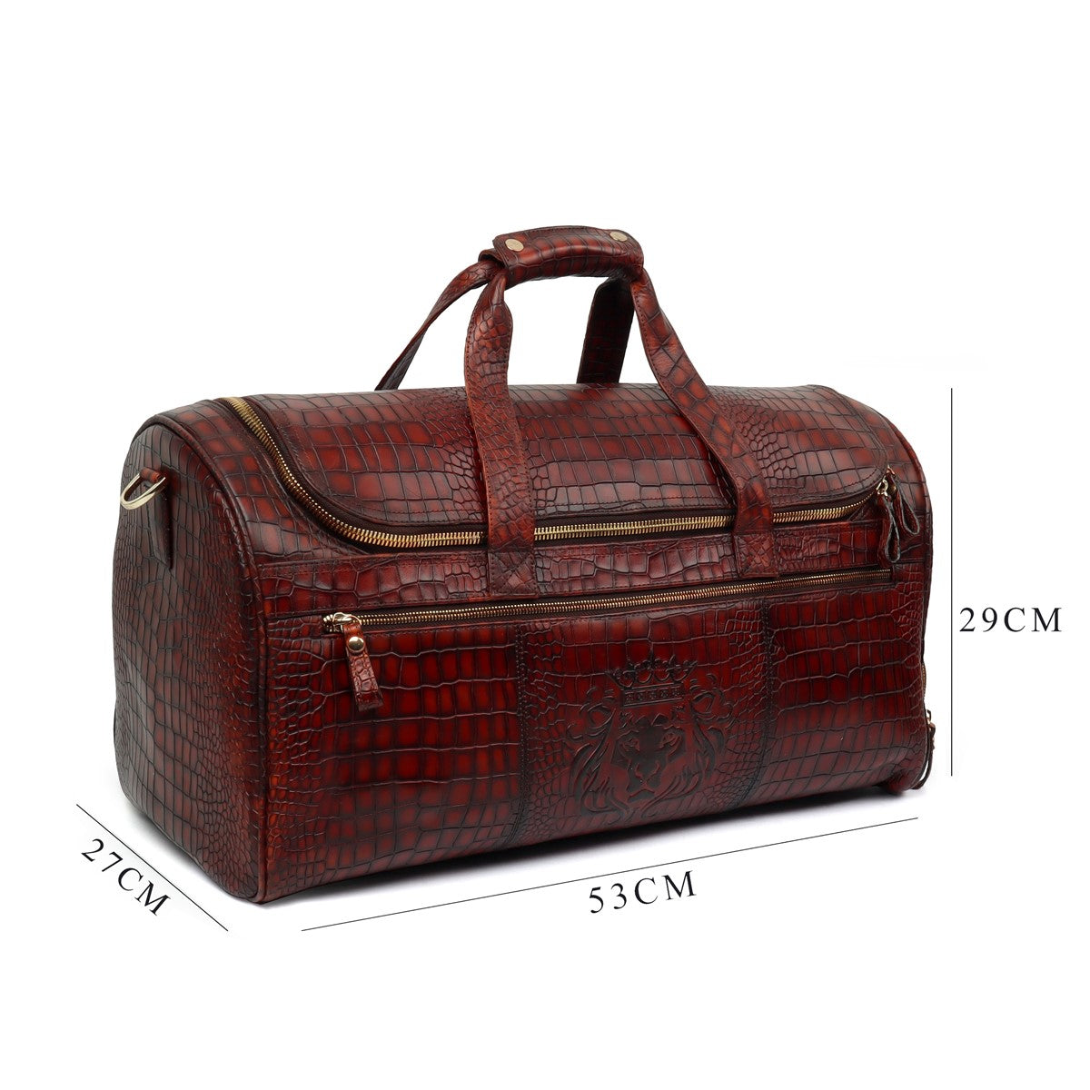 It is a handmade duffle bag that is crafted with precisely selected Deep Cut Croco Textured Leather. The Wine Smokey patina finish gives it an artistic look. It is often said that finding the perfect partner for traveling is quite tough, with this Croco print bag you will not only find the best but also the most attractive one. It features multiple utility compartments. The large main compartment has ample space to carry the clothes for a long weekend. On the front and back of the bag, it has two large zip pocket compartments to carry the essentials with easy access. It also features a dedicated zip show pocket to carry the footwear. The removable/adjustable shoulder strap provides the needed comfort while carrying it. It also has a handle to carry it quickly by hand. You can change the color and also add your initials with our bespoke services.