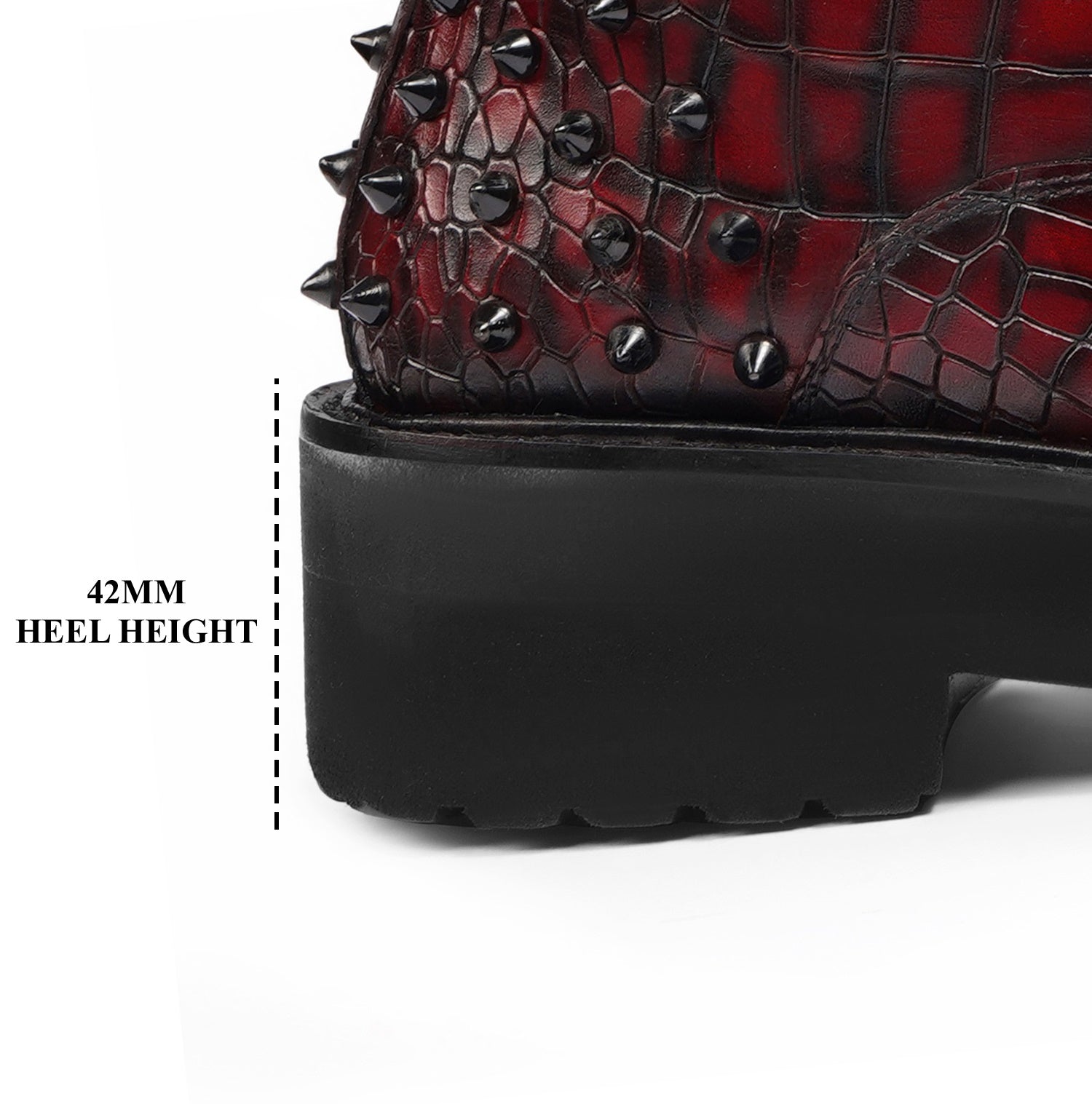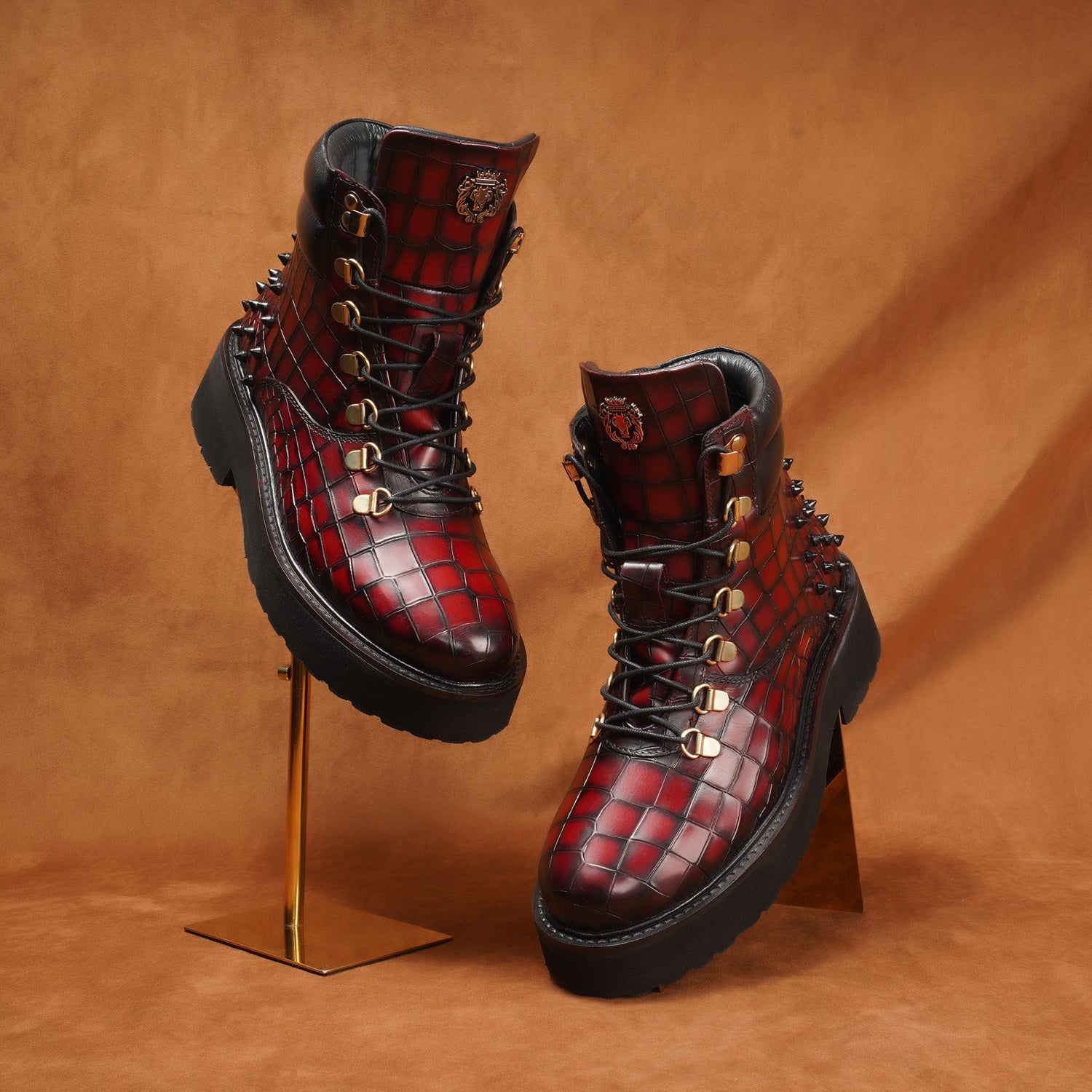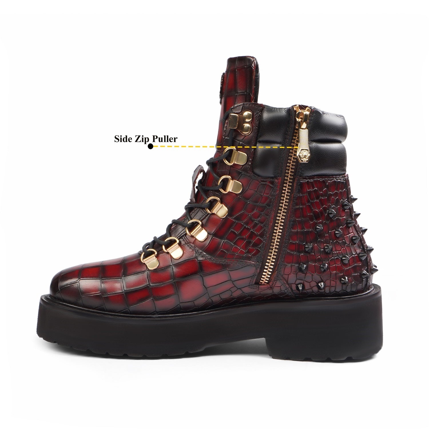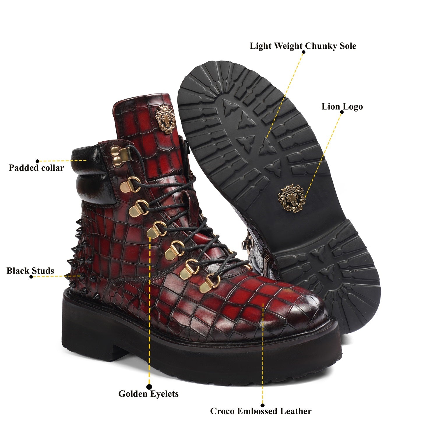 Wine Deep Cut Croco Leather Brune & Bareskin Women Boots are crafted to provide the utmost comfort and next-level style. It is a perfect pair to carry on long travels. These studded ankle-length with golden detailing boots are fitted that emphasize the size and shape of your feet to perfection.
