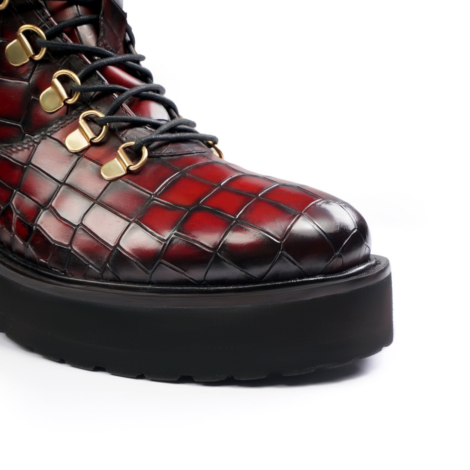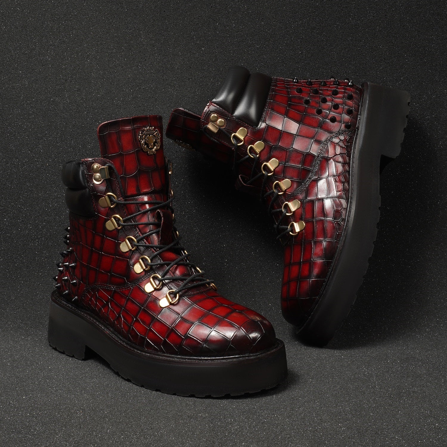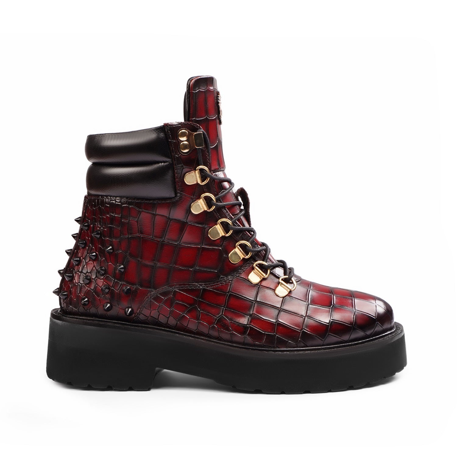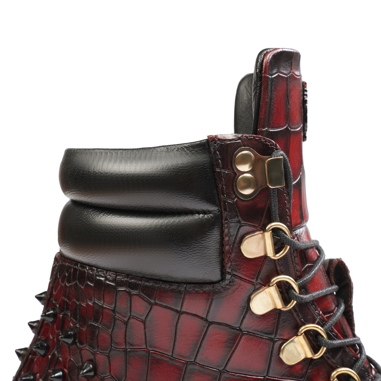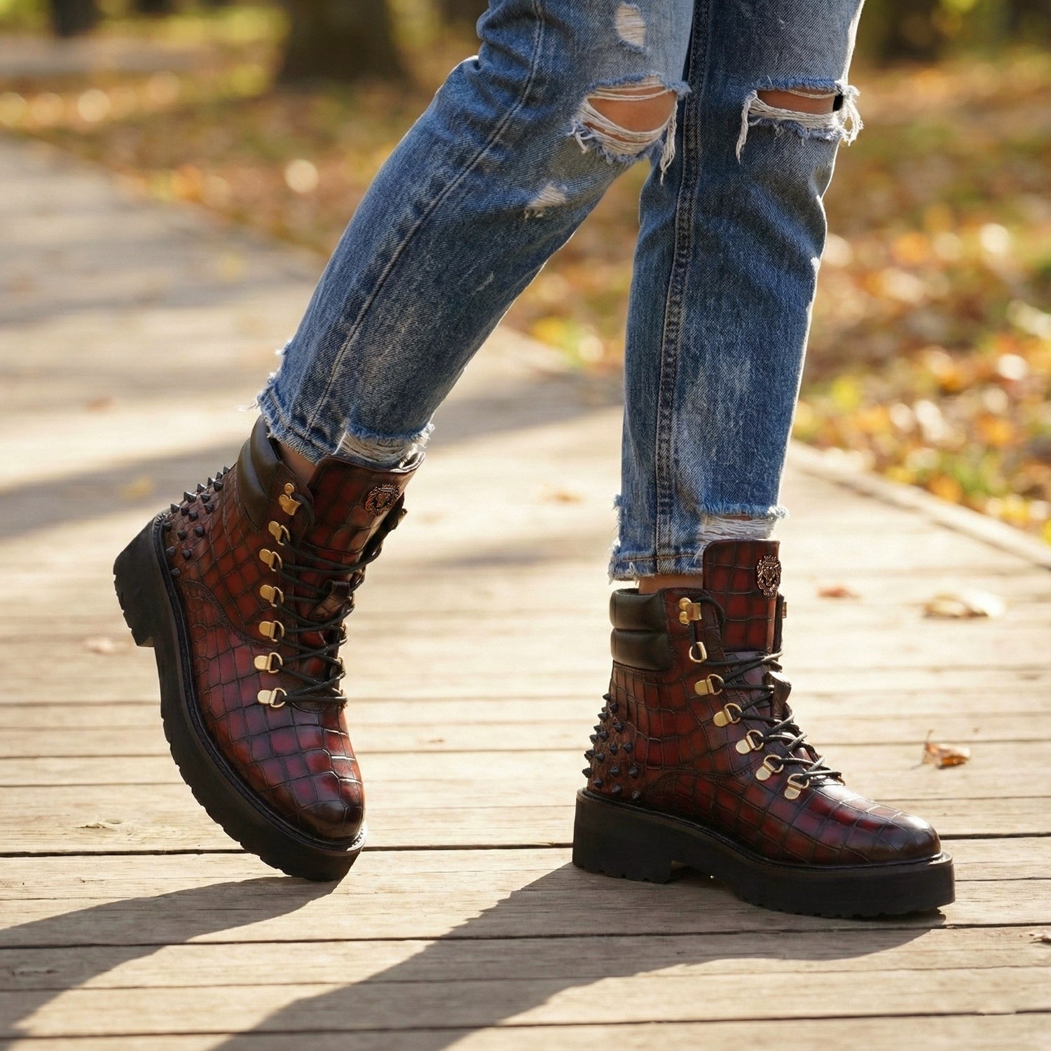 Wine Deep Cut Croco Leather Brune & Bareskin Women Boots are crafted to provide the utmost comfort and next-level style. It is a perfect pair to carry on long travels. These studded ankle-length with golden detailing boots are fitted that emphasize the size and shape of your feet to perfection.