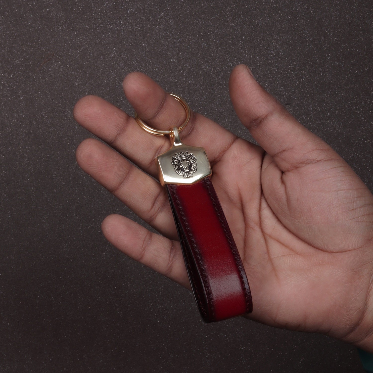This elegant straight look classic keychain is a must have travel accessory. The wine color leather enhances looks very chic. The gold finish fittings compliments its overall color. Brune & Bareskin signature lion logo on the center looks very chic. You can also get it customized especially for you with your name initials and favorite color.