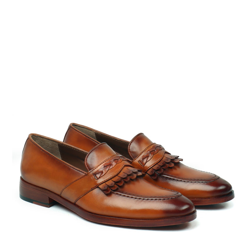Wine Leather Slip-On Loafers with Dual Fringes Weaved Strip By Brune & Bareskin