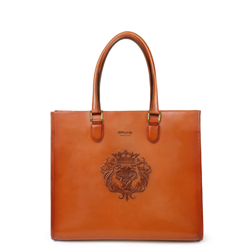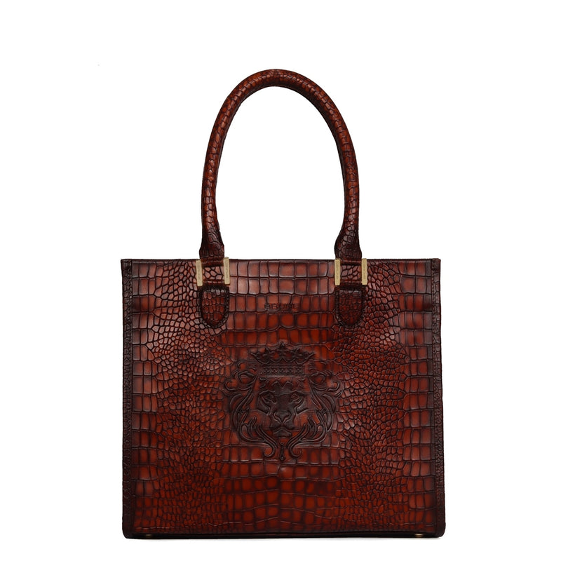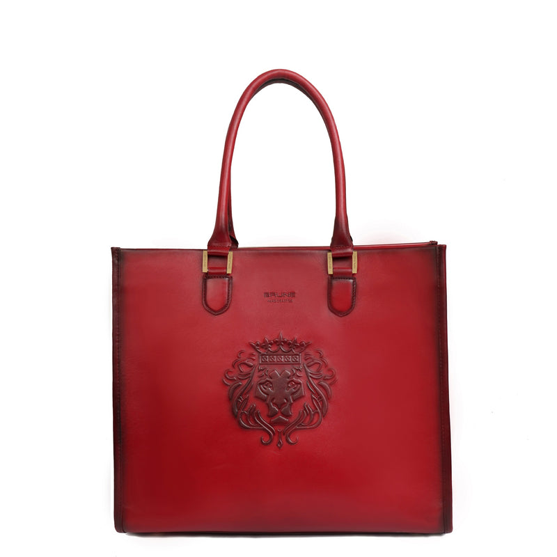 Wine Leather Medium Sized Hand-Bag with Embossed Lion