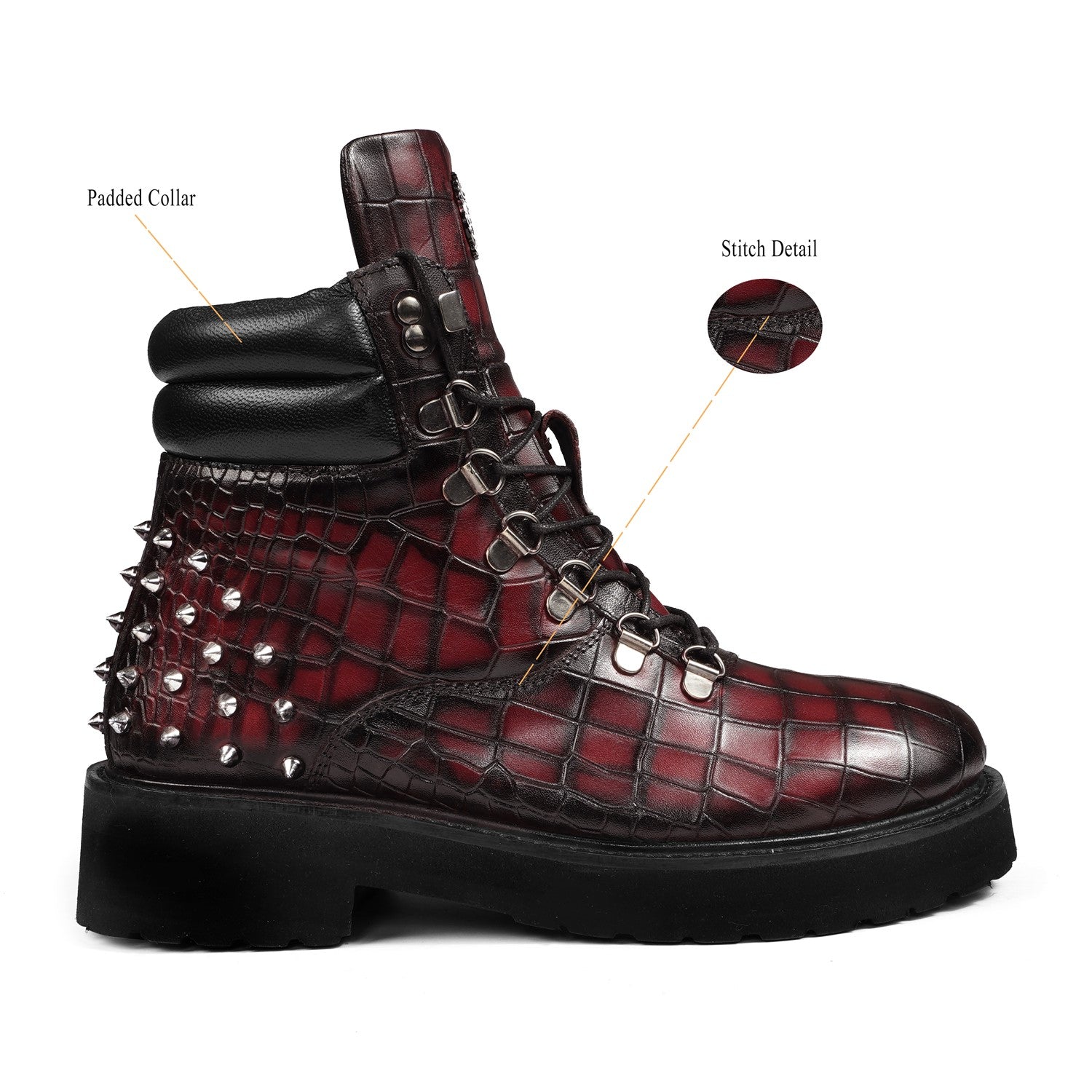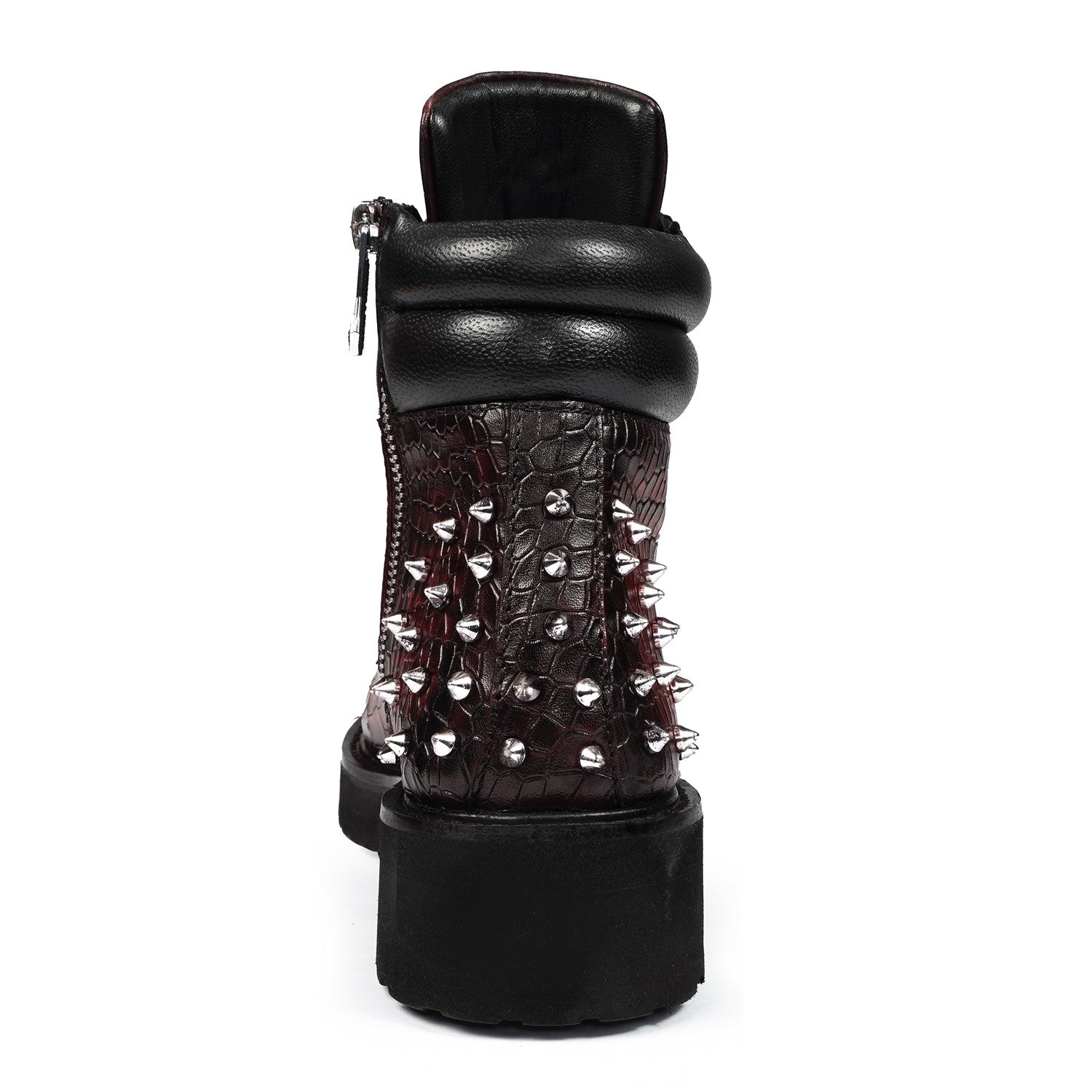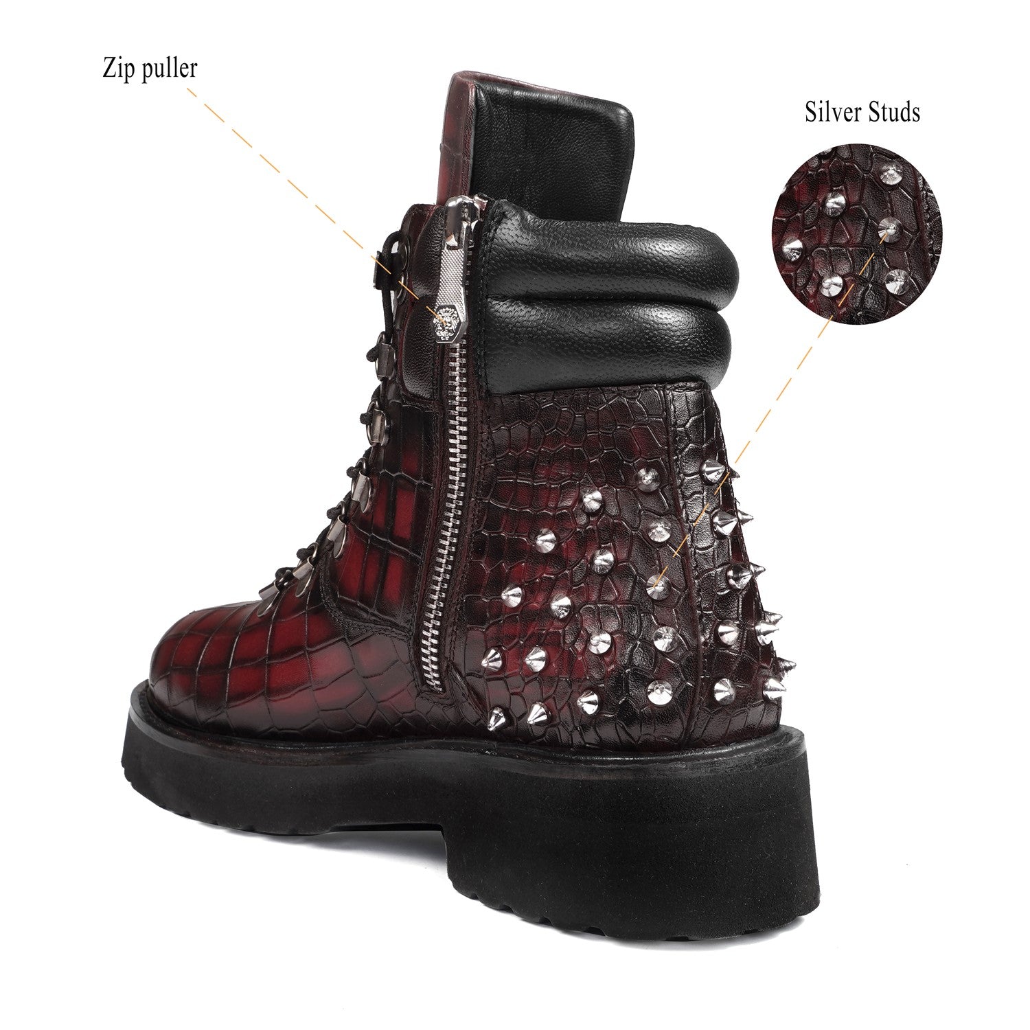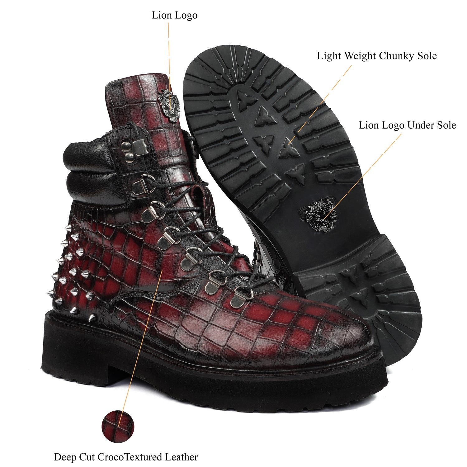 Women Light Weight Biker Studd Chunky Boots in Wine Deep Cut Croco Leather