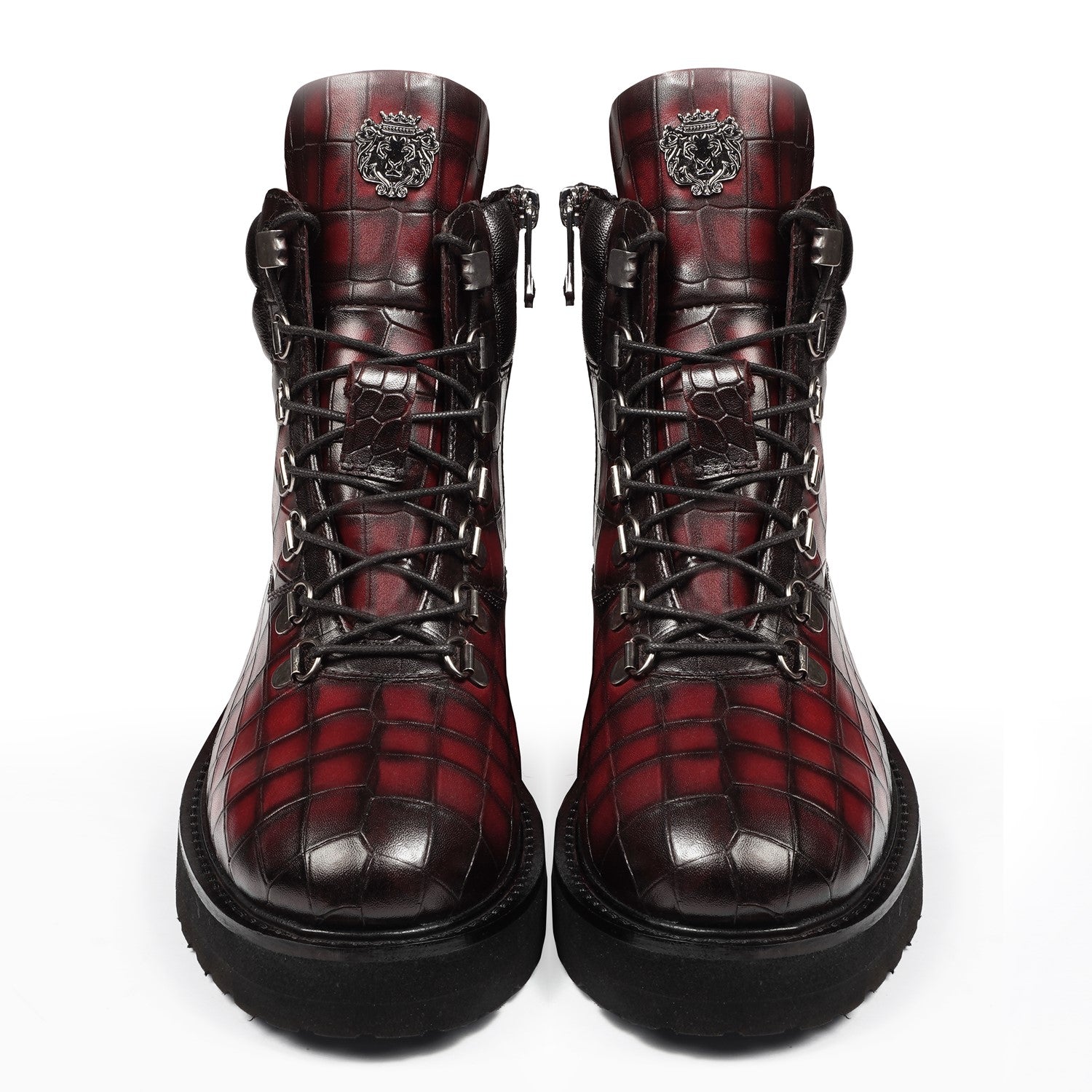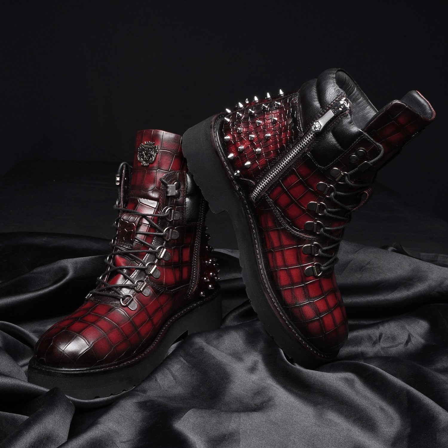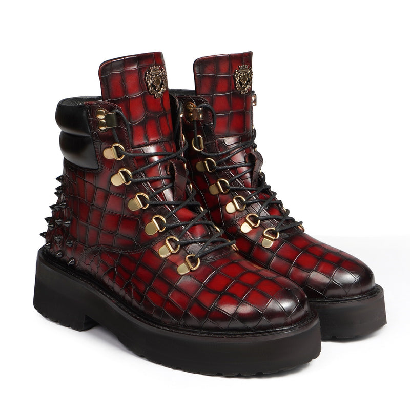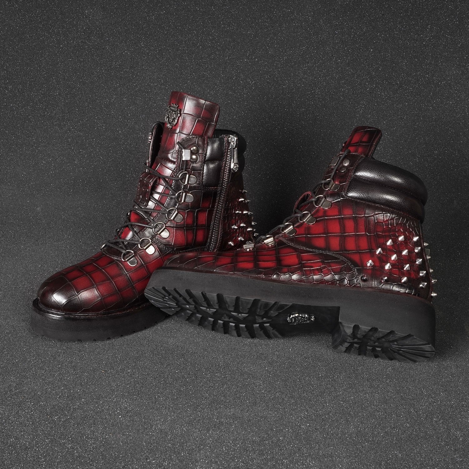 Women Light Weight Biker Studd Chunky Boots in Wine Deep Cut Croco Leather
