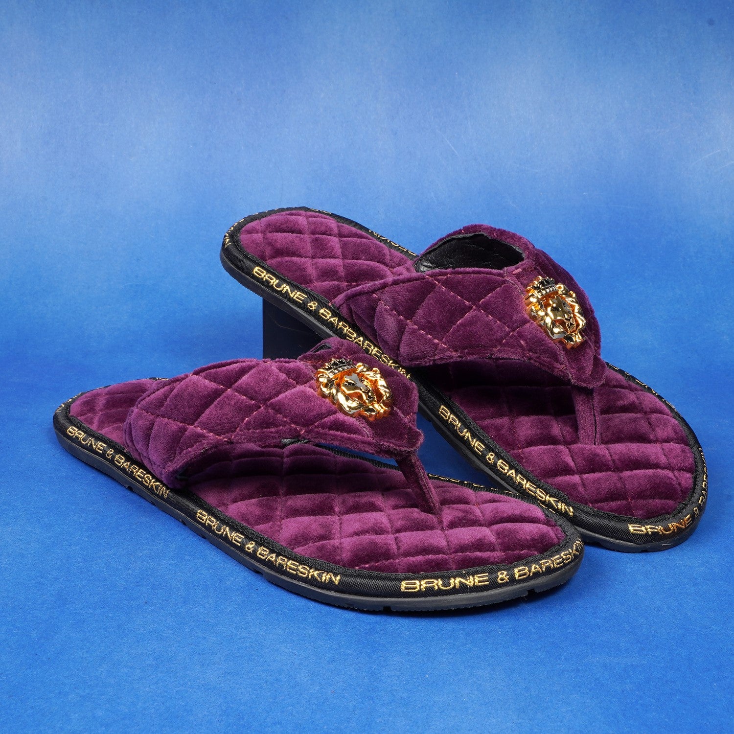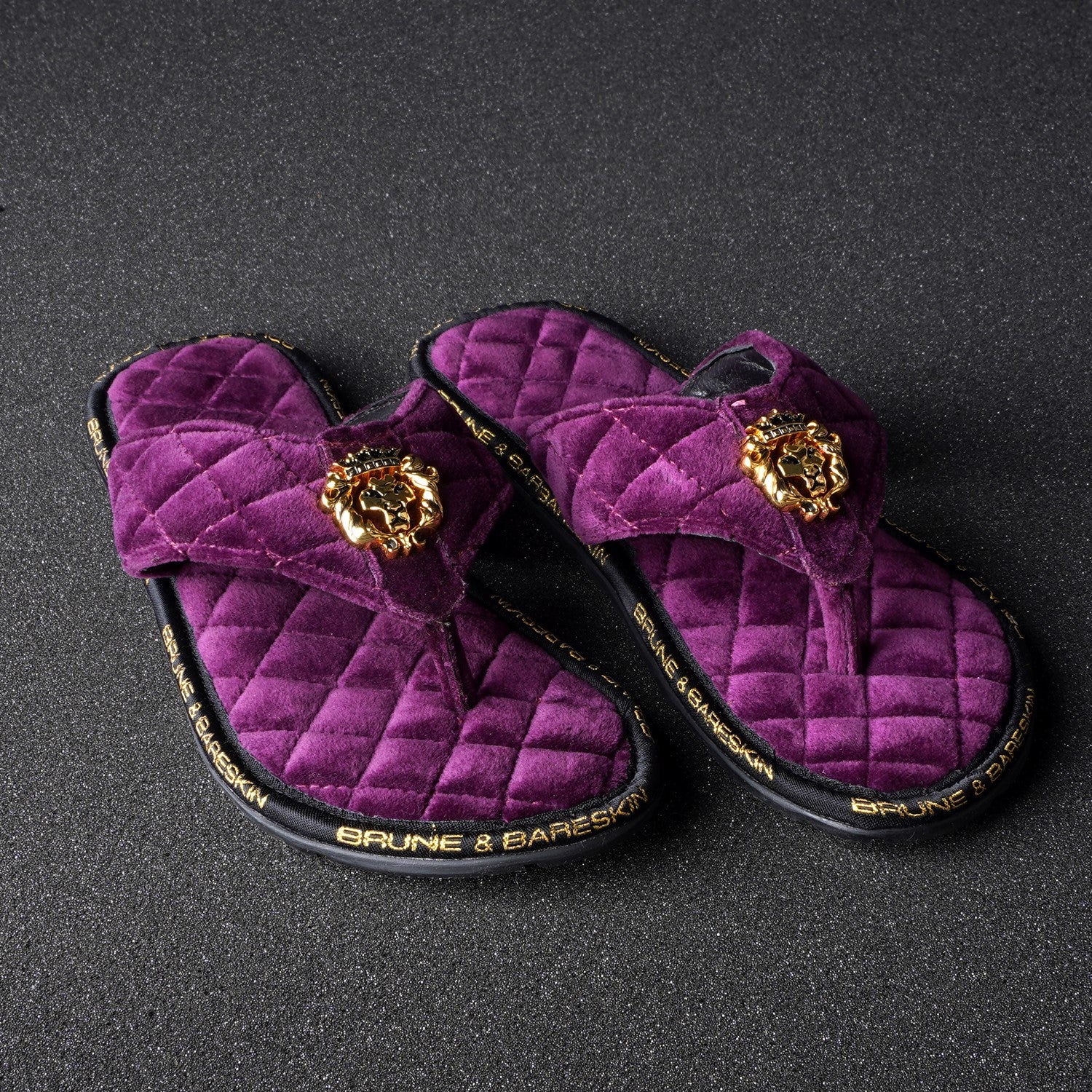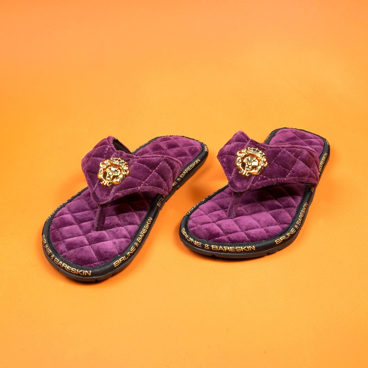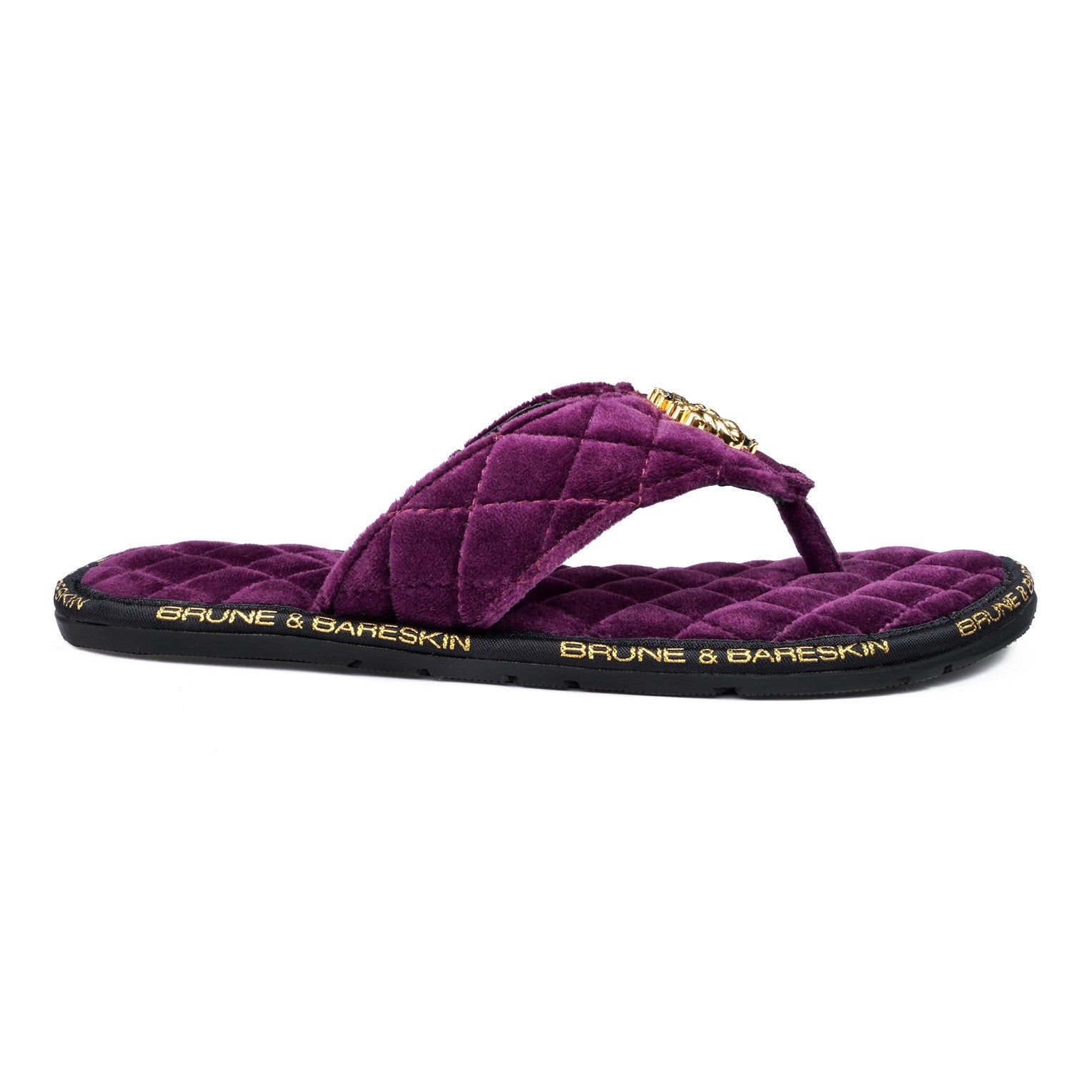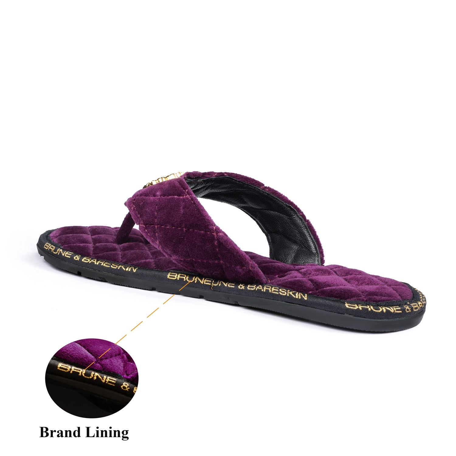 Discover the highest standards of luxury and style with Brune & Bareskin's V-Strap Slide-in Slipper. Handcrafted with premium and featuring a velvet, this women's Slide-in Slipper boasts iconic hand stitched v-strapped design. Experience comfort with extra-padded insoles and a rubberized flat sole for added durability.