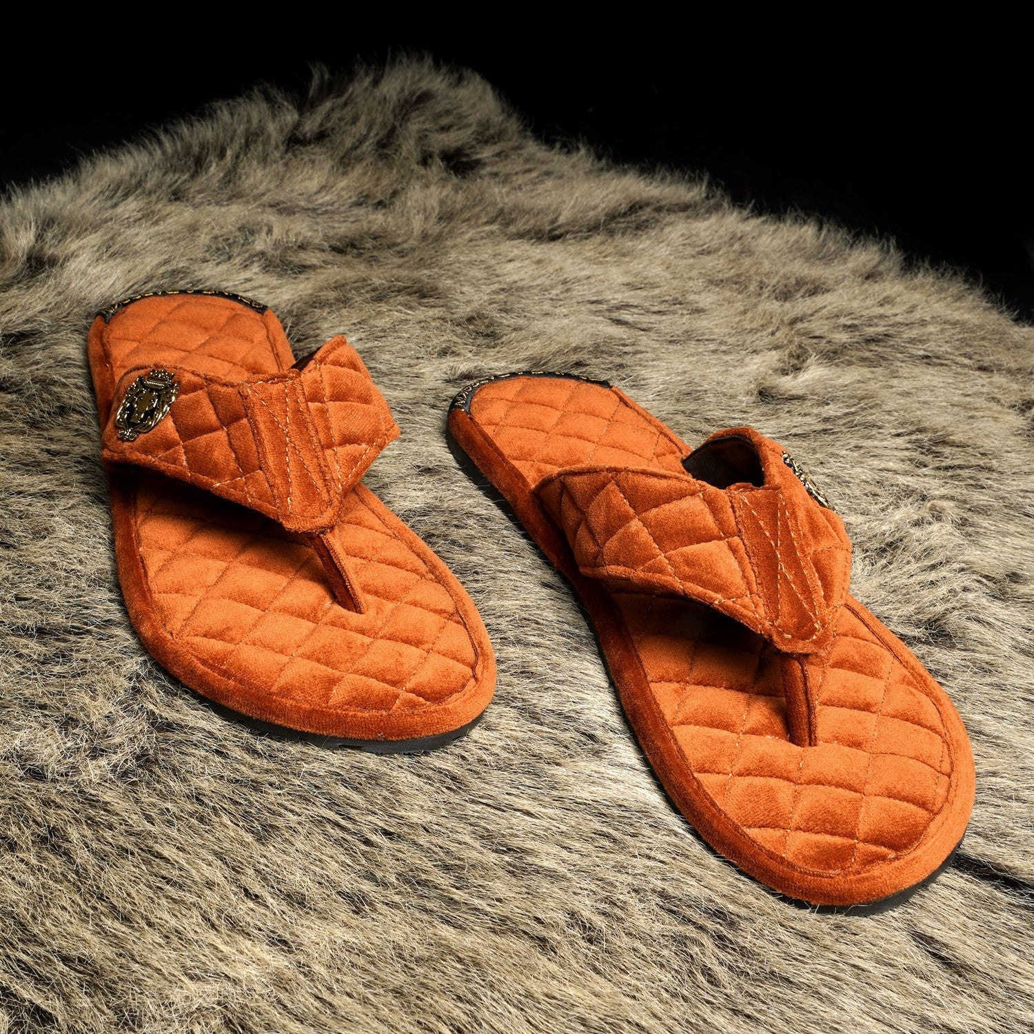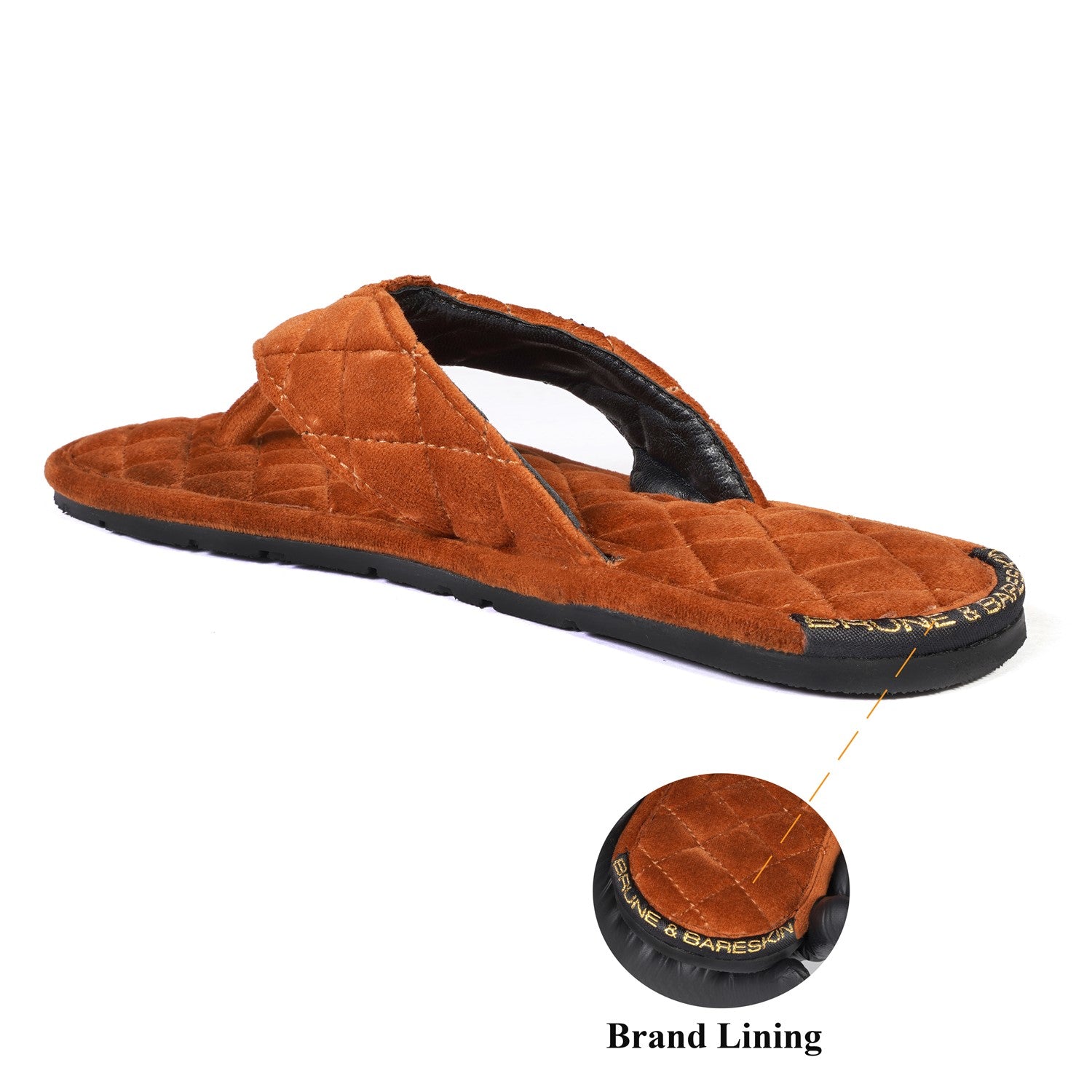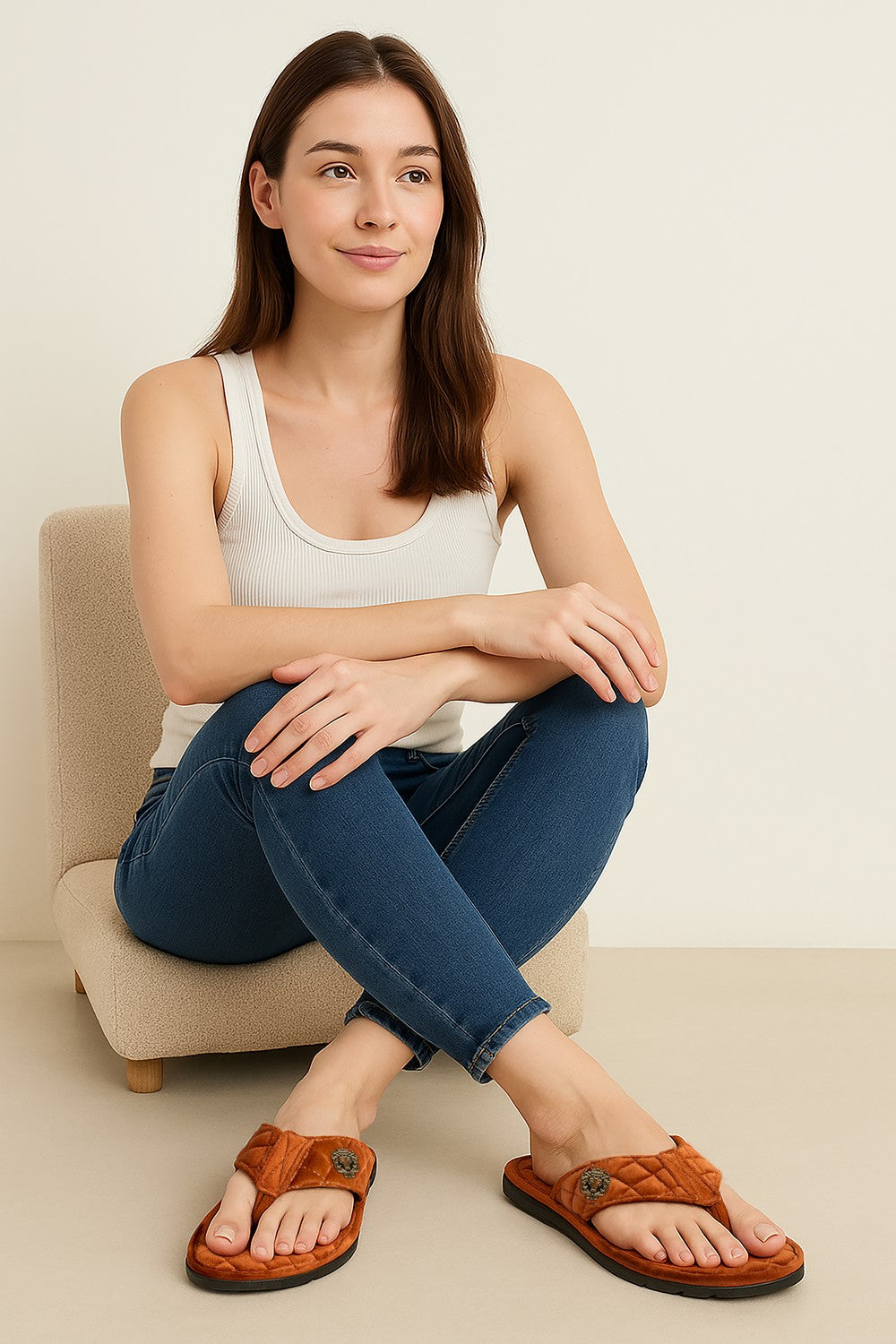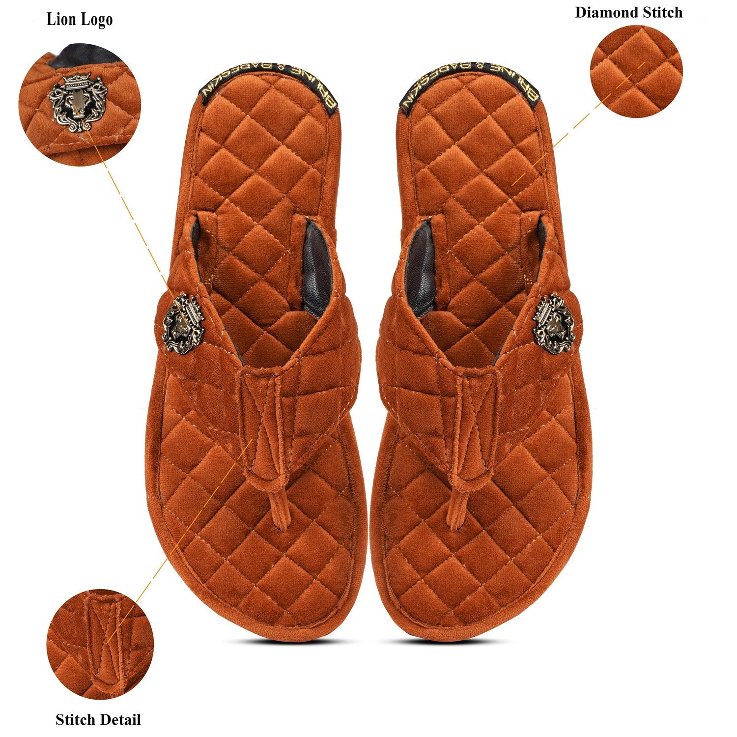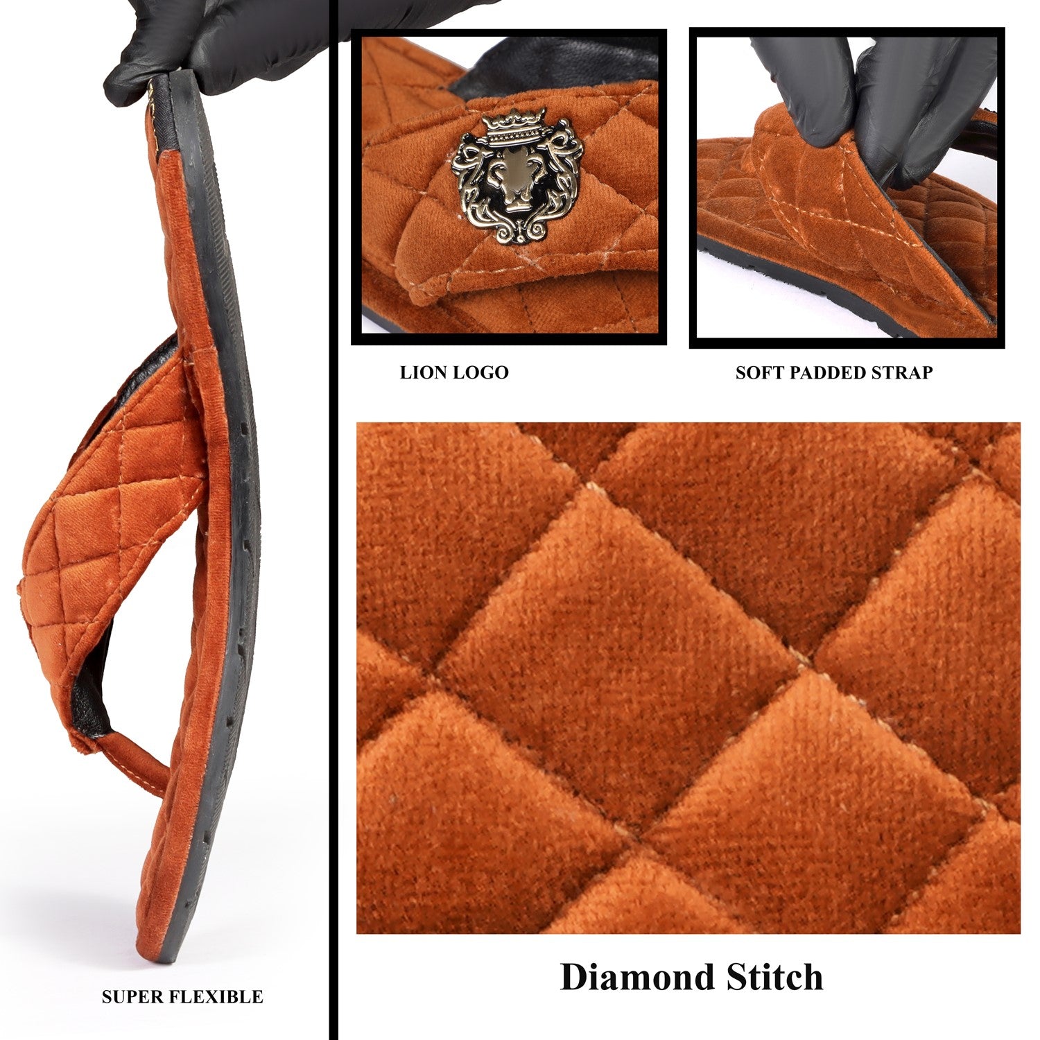 This comfy and super soft women's slippers are made using durable Italian Velvet. The slipper has a three point thong construction with quilted diamond stitched pattern on base and strap with extra cushioning. The wide strap provides a more secure and comfortable fit. It has the memory foam in the base which helps to retain it's quilted design. This dual shade effect velvet slipper looks fab when wears with Jeans, Shorts, Capris and other casual wears. The Brune & Bareskin Signature Lion logo on quilted strap enhances the elegance further. Anti-Skid Rubber outer sole ensures the perfect walking grip.
