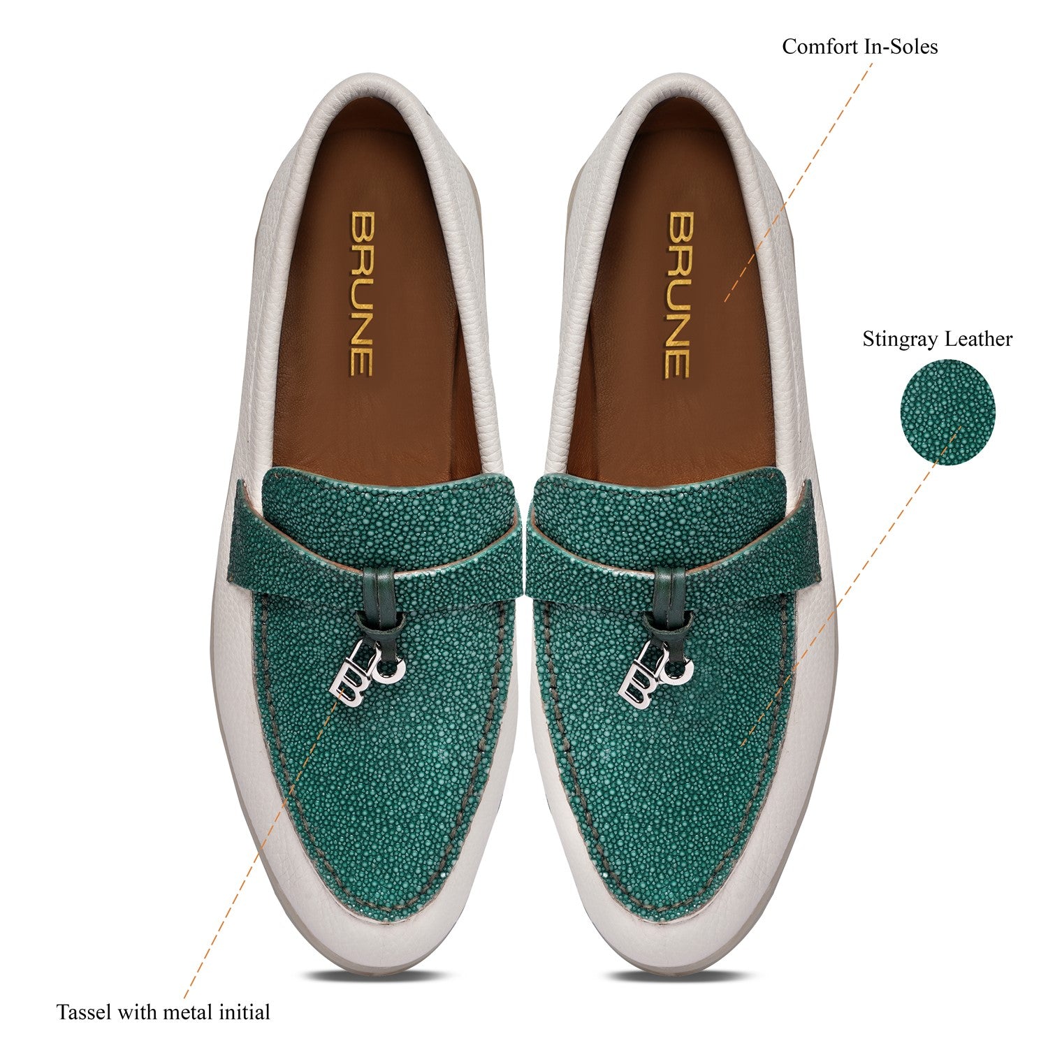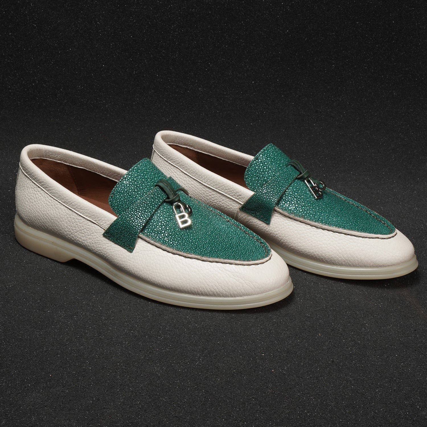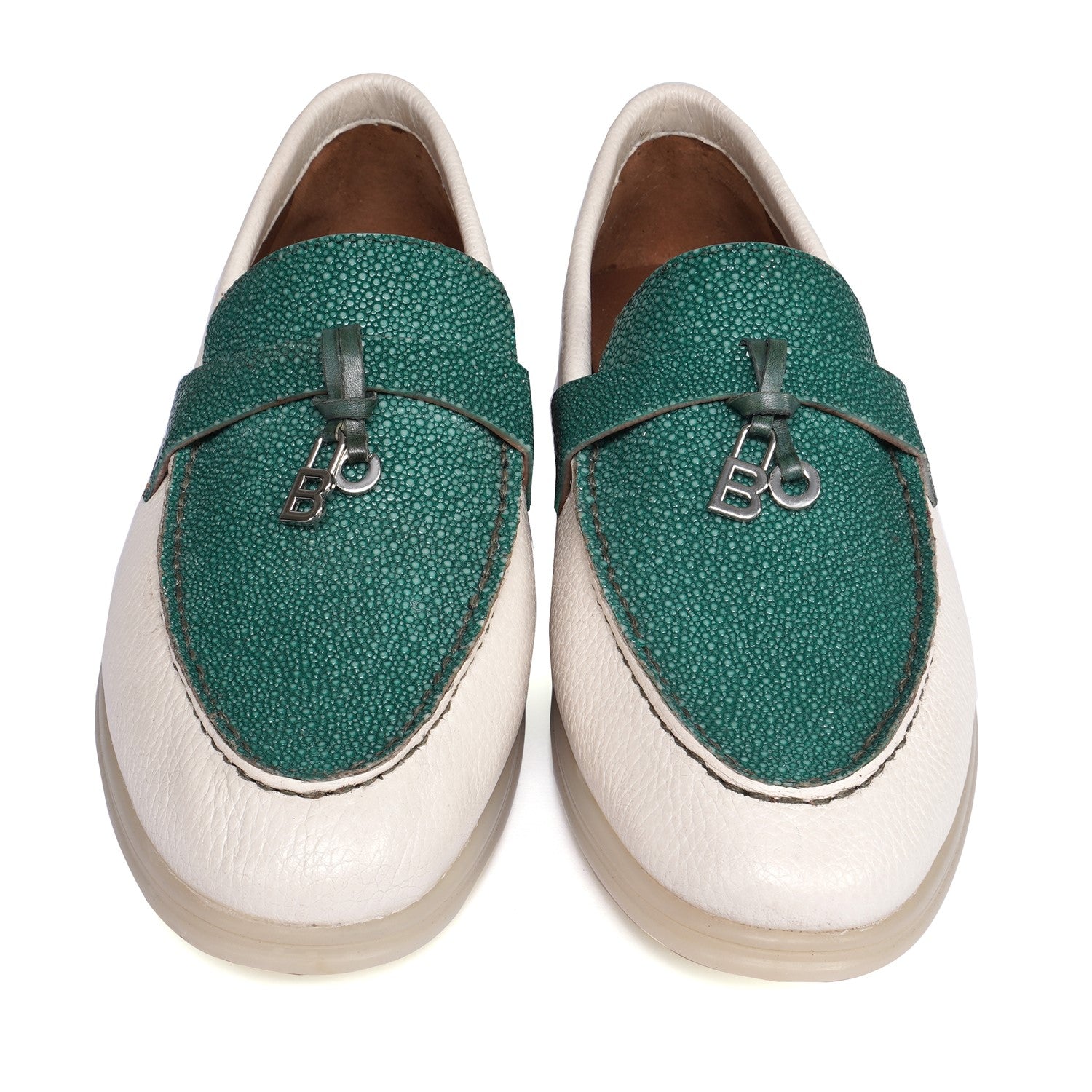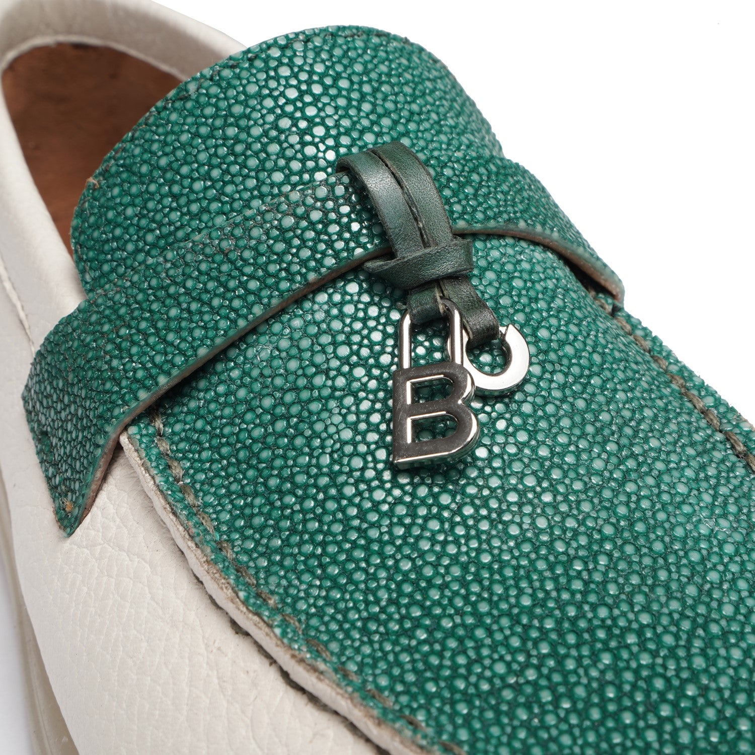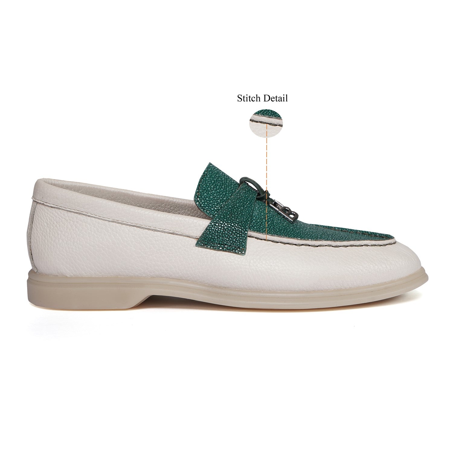 Upgrade your summer wardrobe with our designer Women Yacht Stingray Slip-On Shoes. Crafted with genuine Textured white leather, these shoes feature a rounded toe and tasseled metal initial, adding a touch of elegance. Hand crafted with a durable rubber sole, they offer the perfect combination of comfort and style. Perfect for a casual summer walk or a day on the yacht, these shoes are a premium quality addition to your collection.
