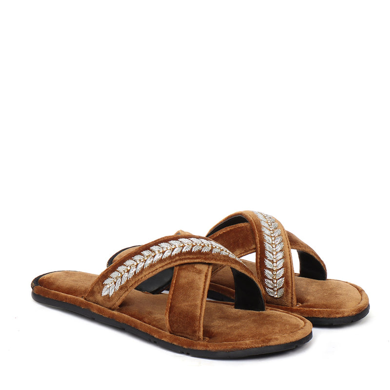 Black velvet cross strap sliders with Leaf zardosi are must have footwear in this season. These super soft velvet base slippers are must have of the season. The gel injected memory foam base is designed to provide you comfort while walking. We use special layering techniques to keep the base cozy and retain it's shape. The wider cross design straps with BRUNE & BARESKIN Lion Logo enhances the elegance further. Carry these with Jeans, Shorts, Capris and other casual wears to be style leader. Anti-Skid Rubber outer sole ensures the perfect walking grip.