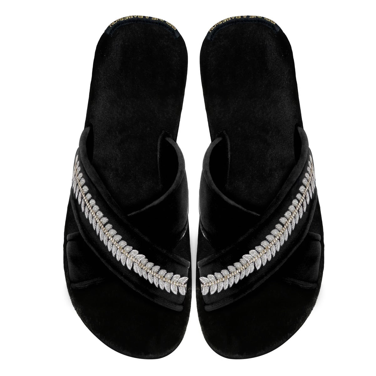 Women's Black Leaf Design Silver Zardosi Embroidery Cross Strap Slippers By Brune & Bareskin