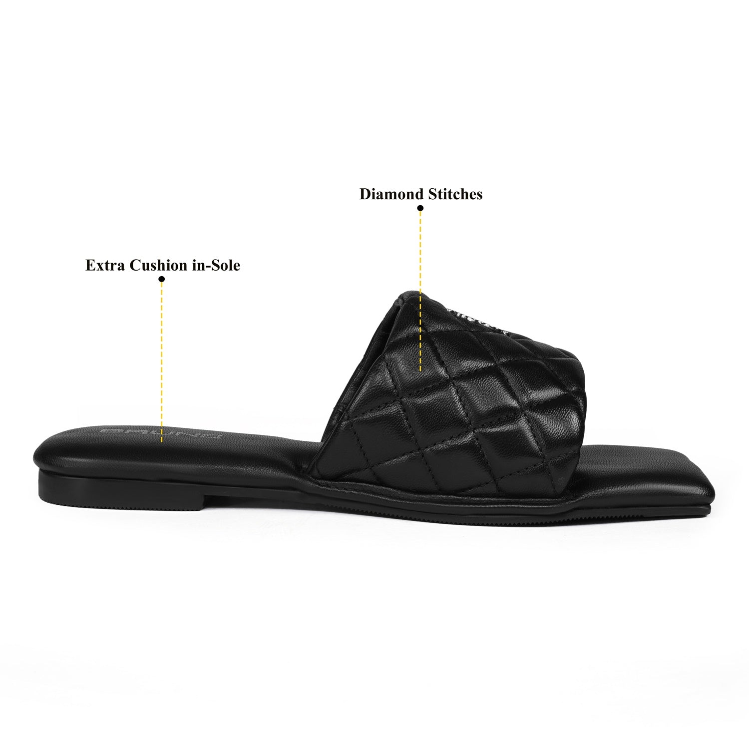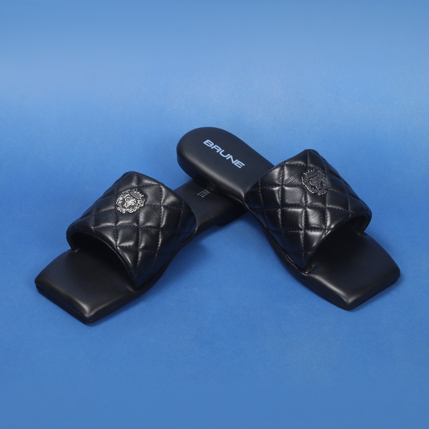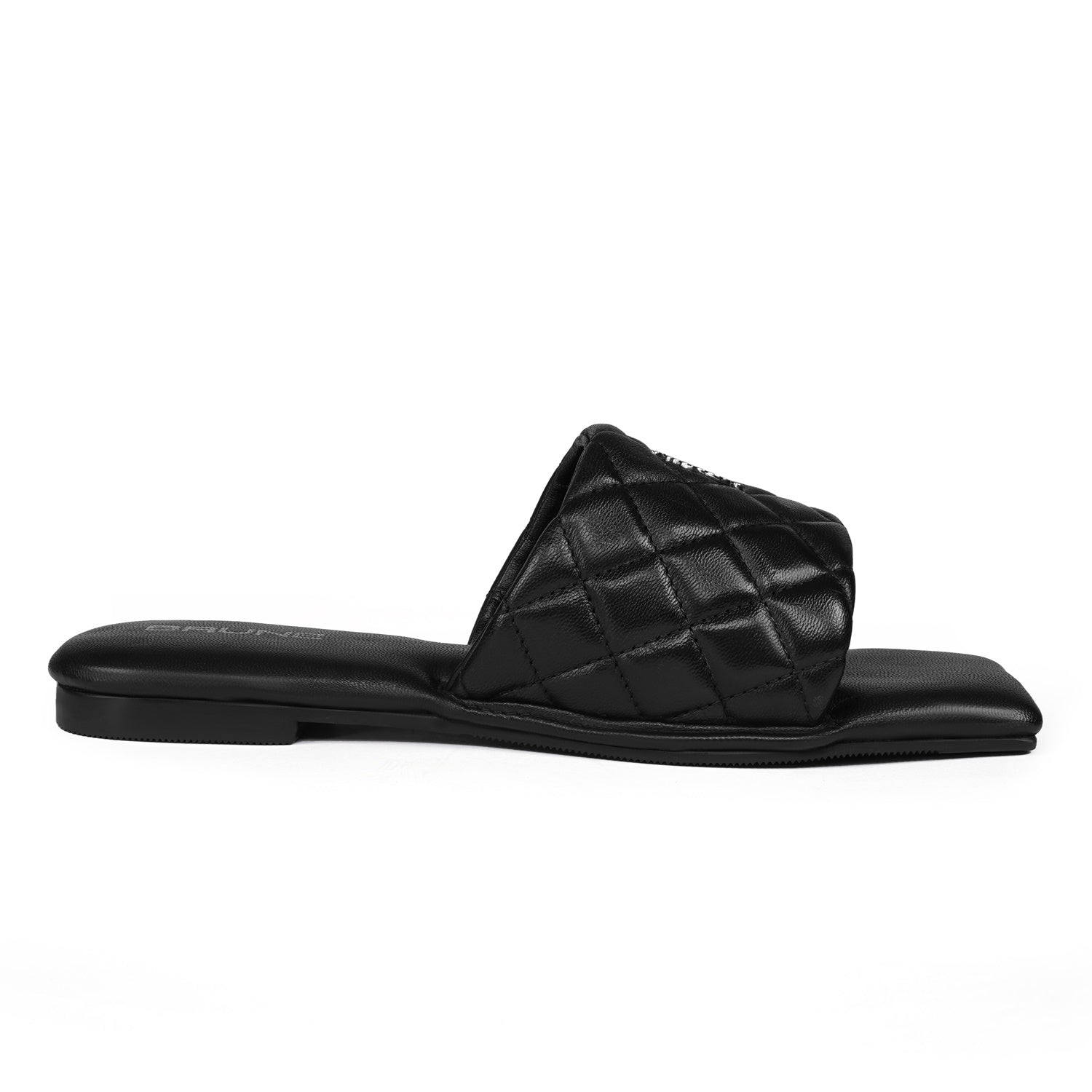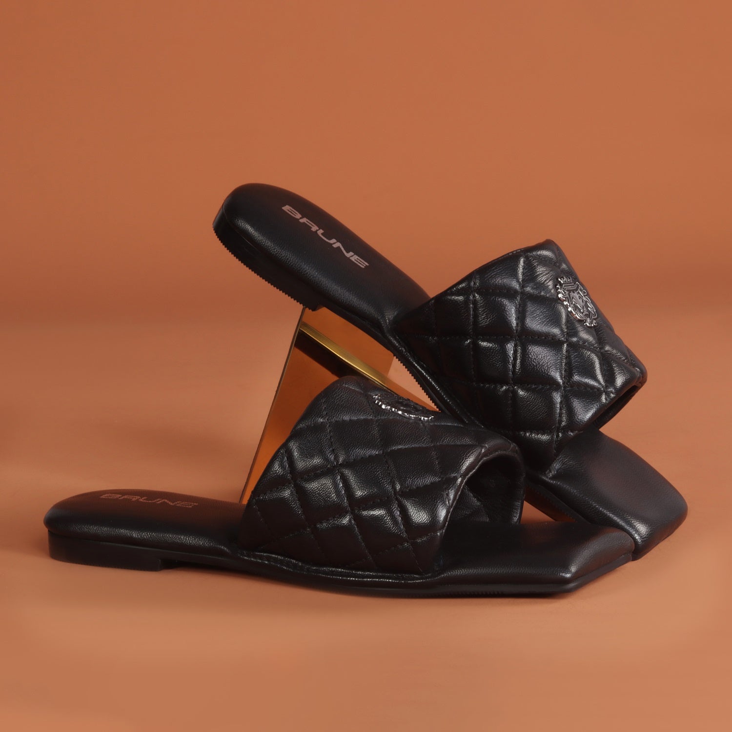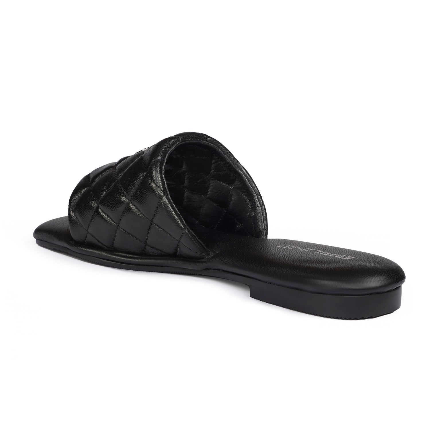 Women's Black Leather Squired Toe Quilted Strap Comfy Slide-in Slippers By Brune & Bareskin