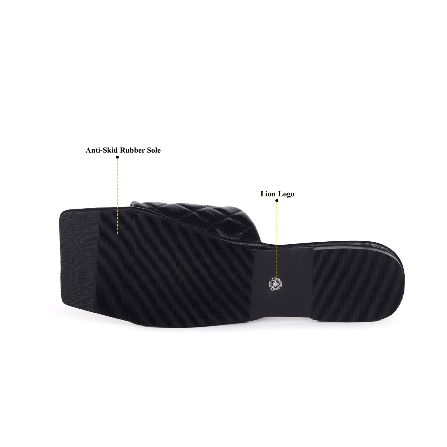 These super soft leather base open squared toe ladies slippers are must have for the season. The gel injected memory foam base is designed to provide you comfort while walking. We use special layering techniques to keep the base cozy and retain it's shape. The black quilted padded strap with BRUNE & BARESKIN Lion Logo enhances the elegance further. Carry these with Jeans, Shorts, Capris and other casual wears to be style leader. Anti-Skid Rubber outer sole ensures the perfect walking grip.