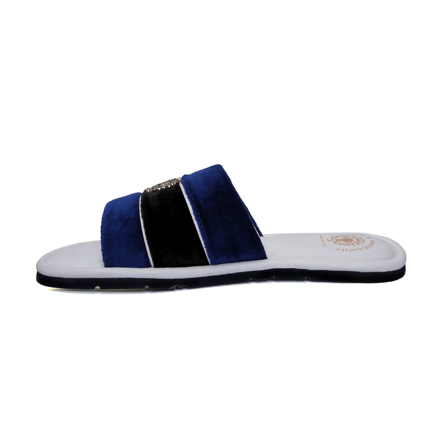 Women's Blue & Black Velvet Strap White Leather Slide-in Slippers by BRUNE & BARESKIN