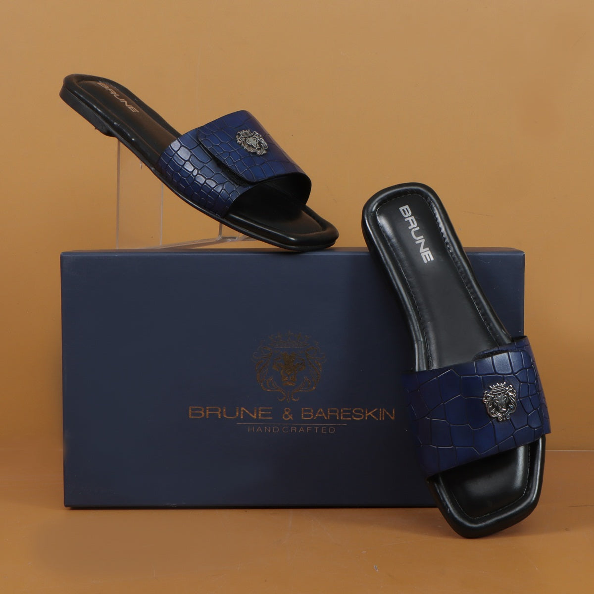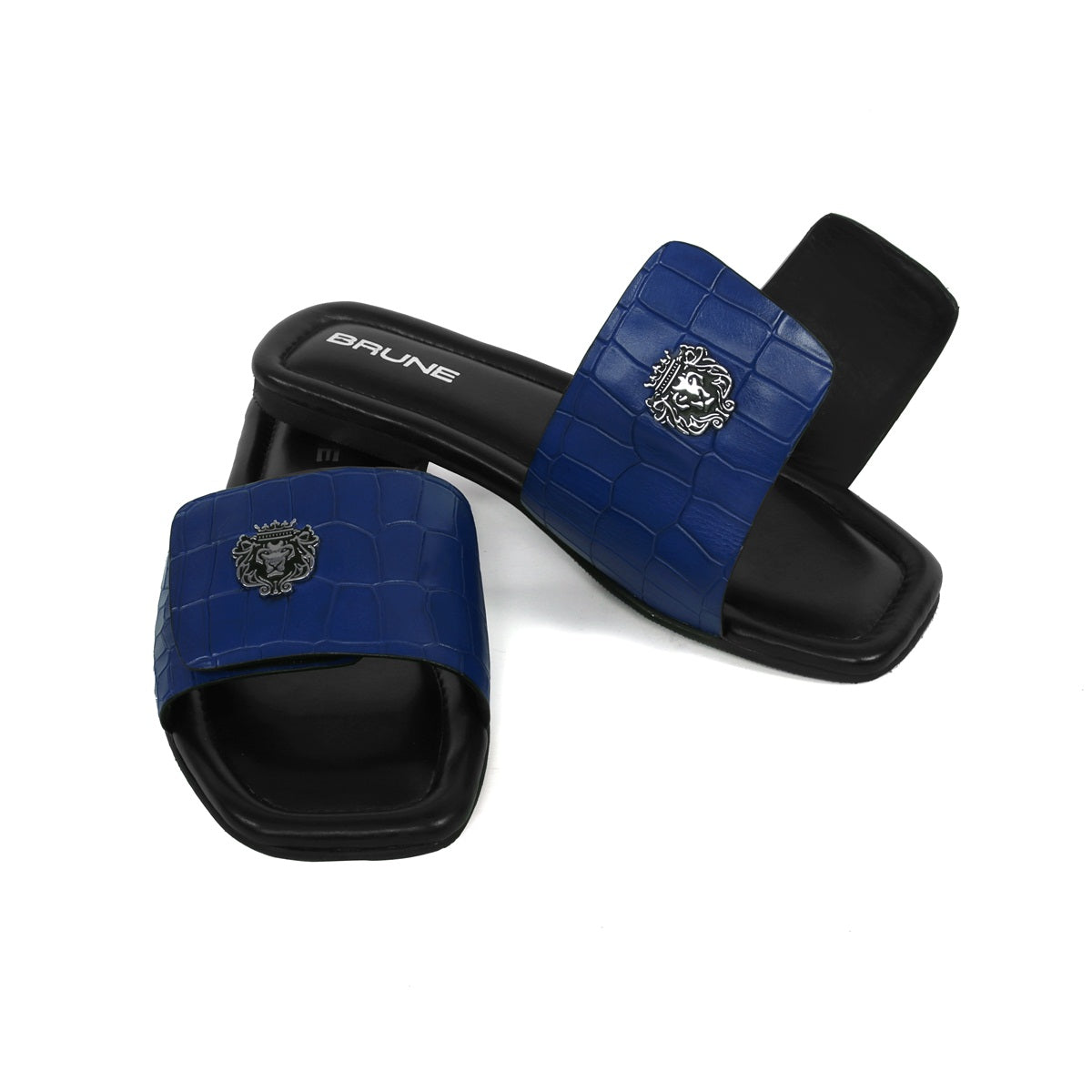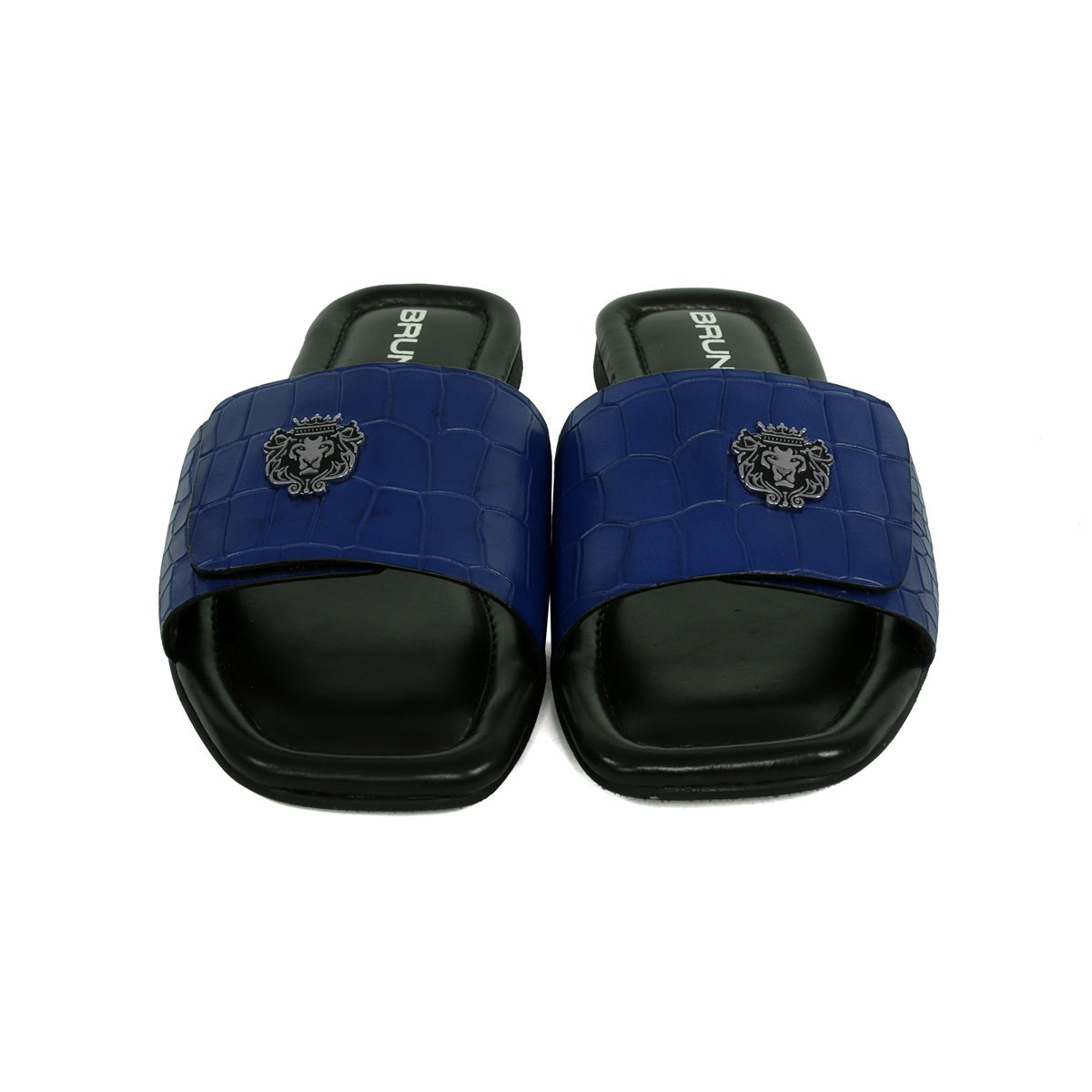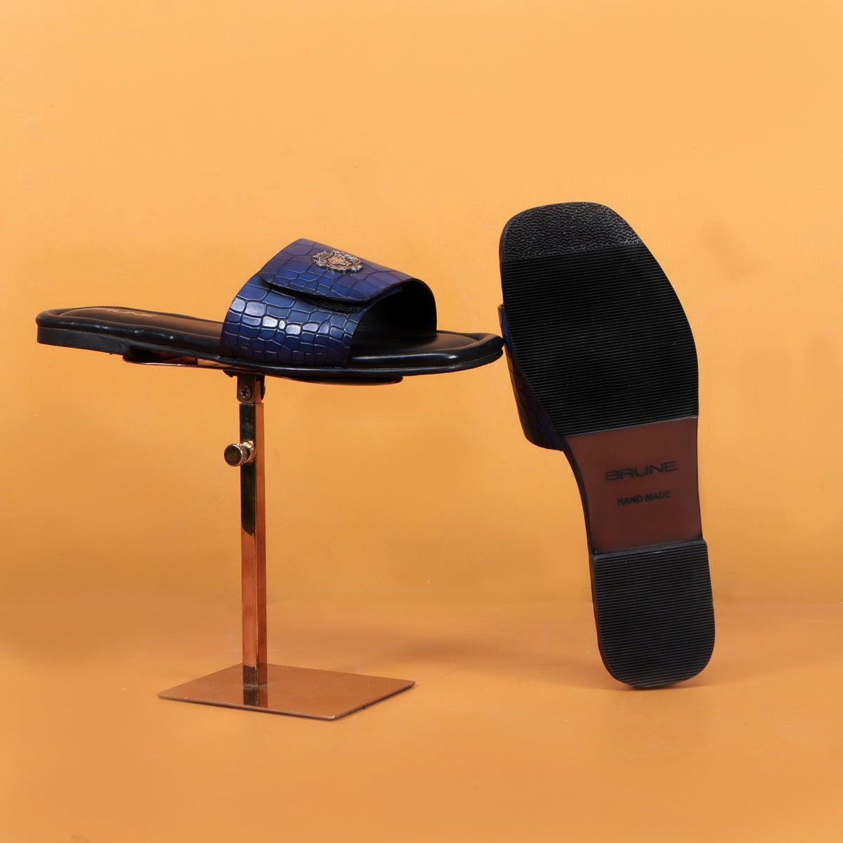 The croco deep cut textured leather slide in slipper from Brune & Bareskin is perfect for those who seek a stylish yet comfortable shoe. Featuring a Velcro adjustable strap, silver lion logo, and handmade blue finish, this slipper is both lightweight and soft, making it ideal for all-day wear. Anti-Skid rubber outer sole ensures the perfect walking grip. Carry these with Jeans, Shorts and other casual wears to be style leader. You can get it made in your favorite color with our Bespoke services.