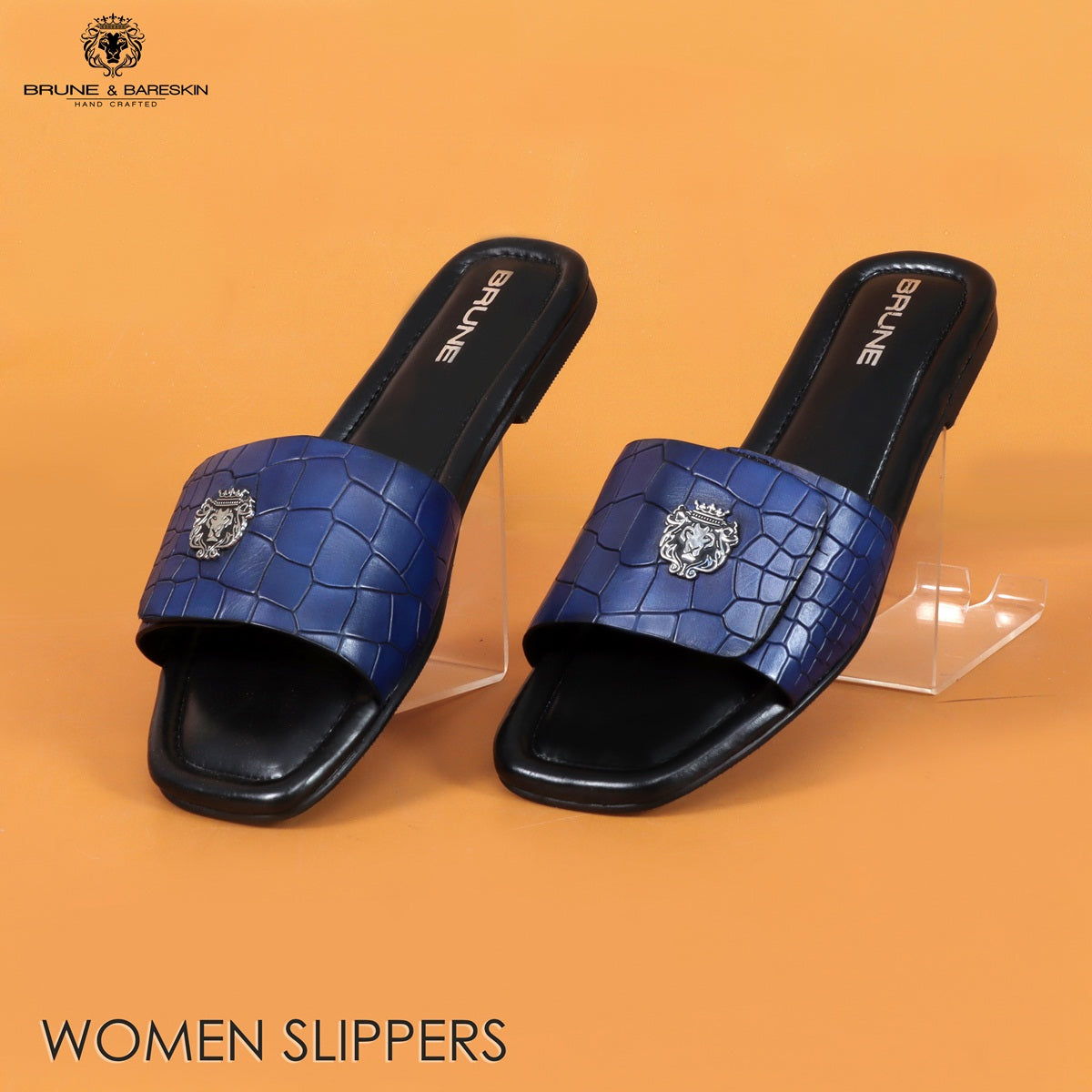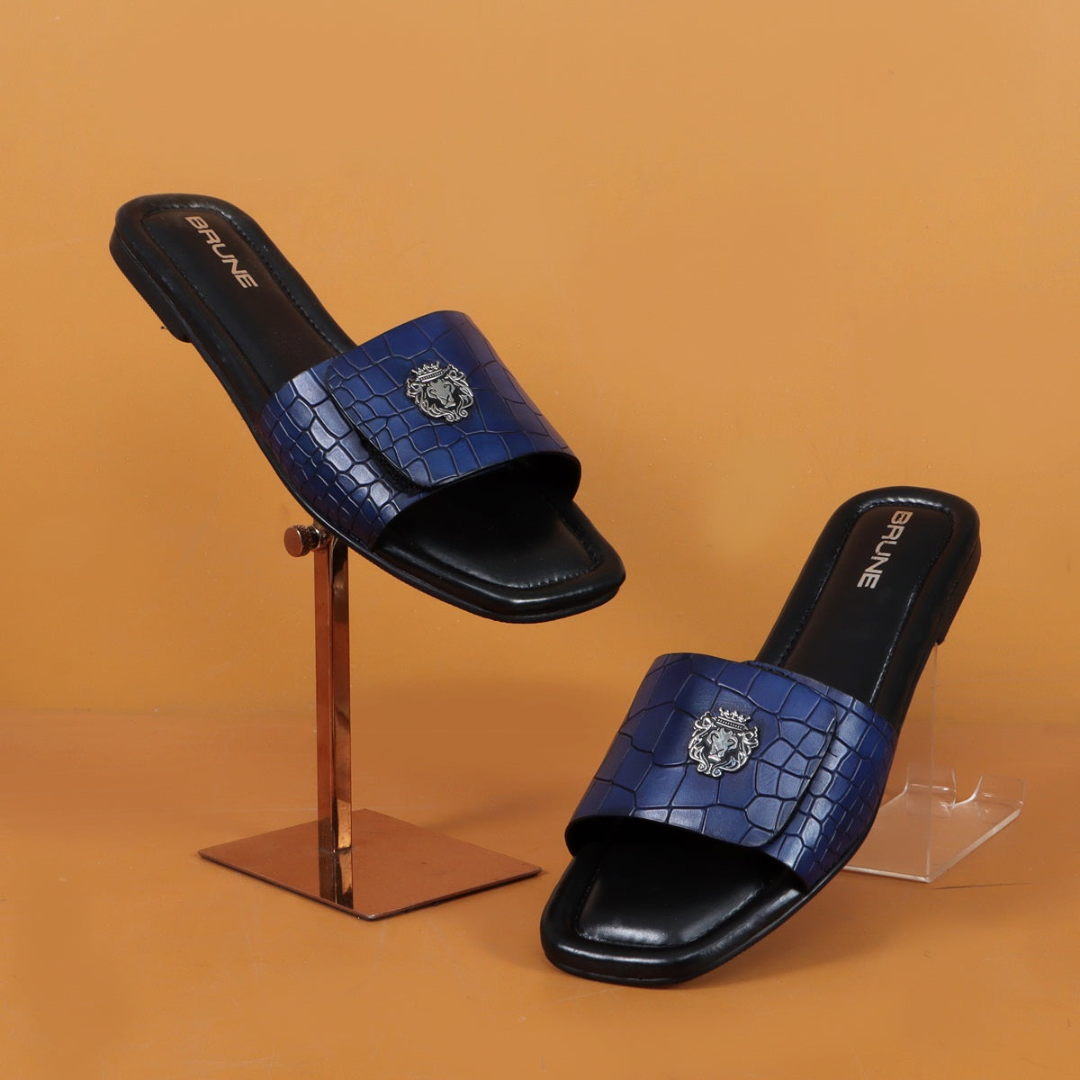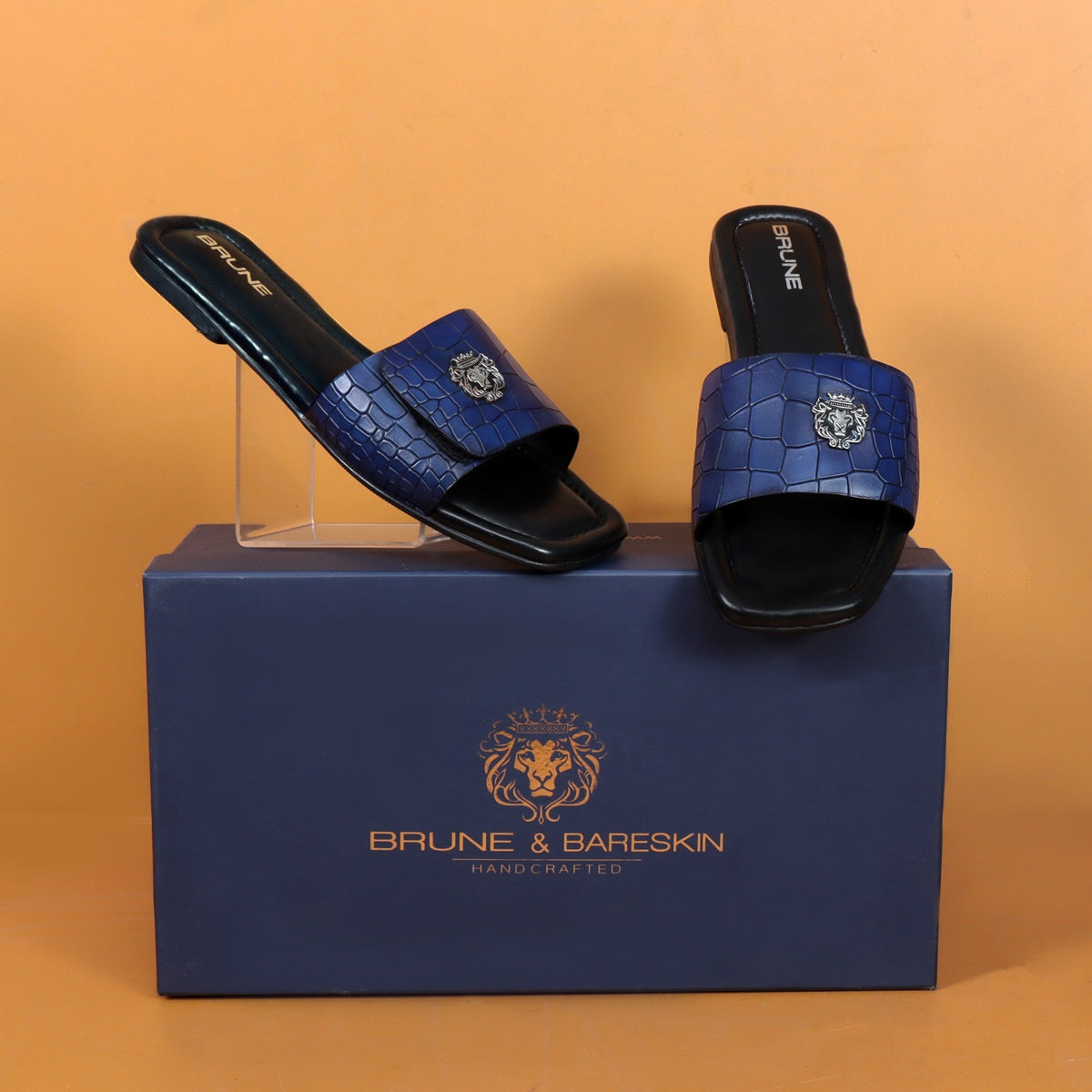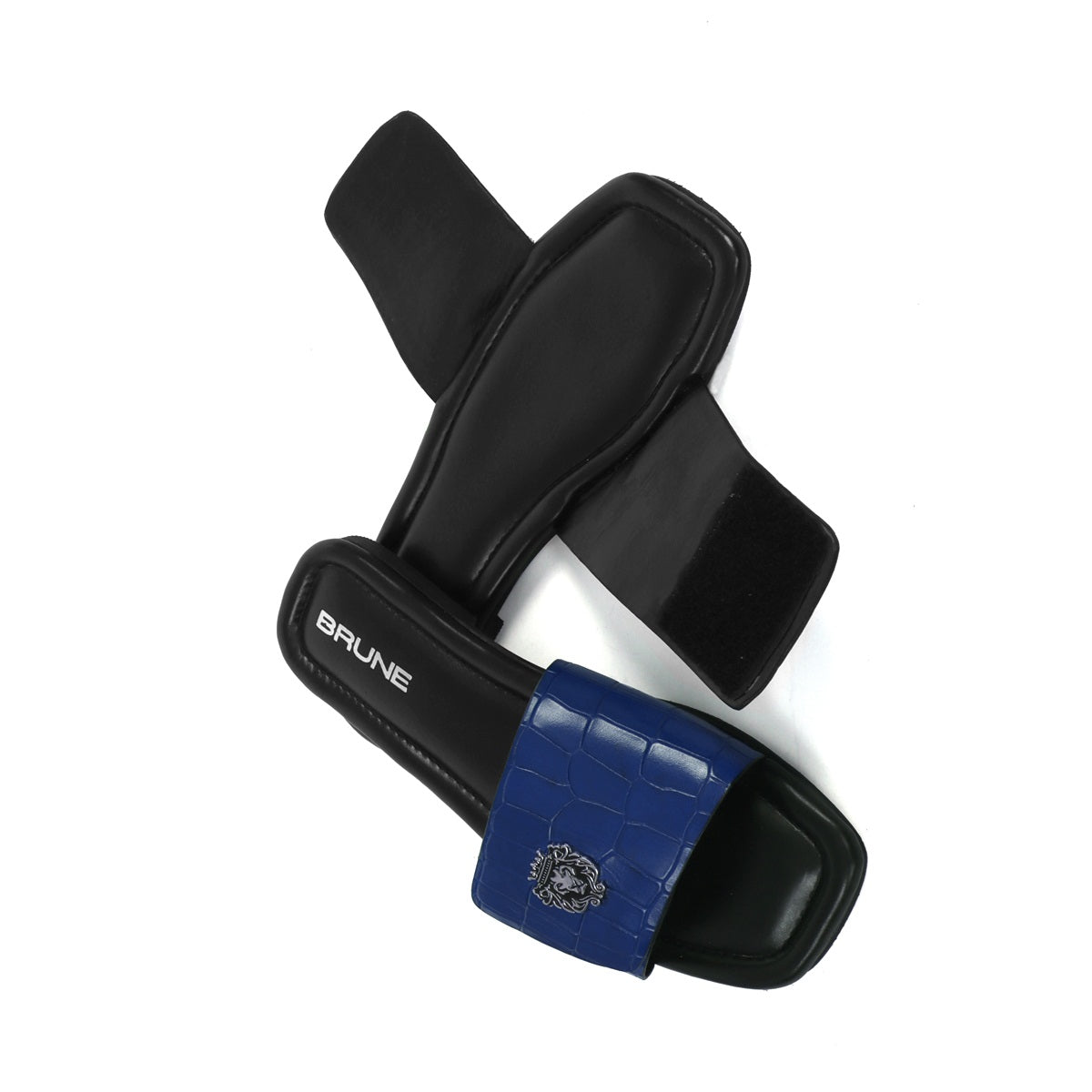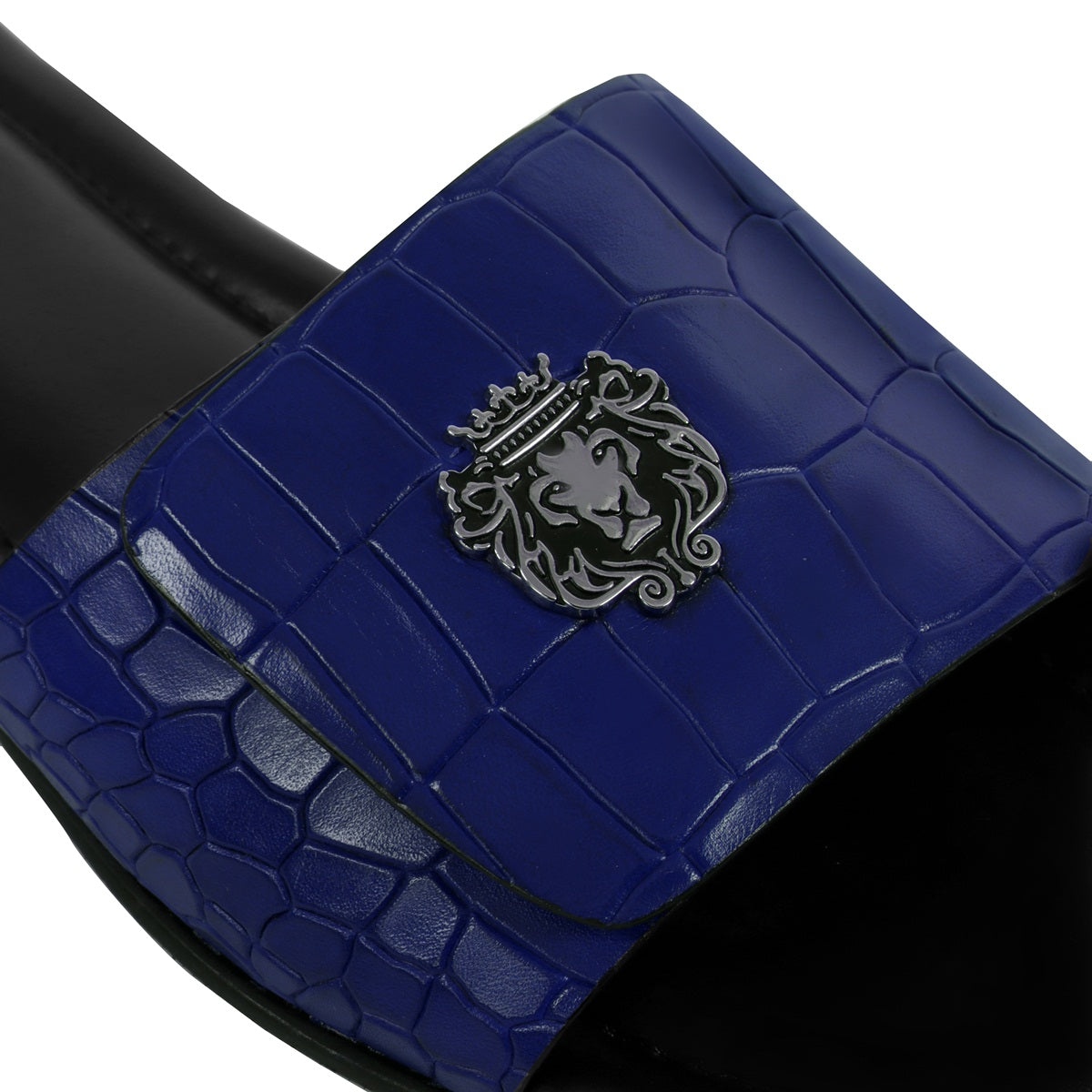 The croco deep cut textured leather slide in slipper from Brune & Bareskin is perfect for those who seek a stylish yet comfortable shoe. Featuring a Velcro adjustable strap, silver lion logo, and handmade blue finish, this slipper is both lightweight and soft, making it ideal for all-day wear. Anti-Skid rubber outer sole ensures the perfect walking grip. Carry these with Jeans, Shorts and other casual wears to be style leader. You can get it made in your favorite color with our Bespoke services.